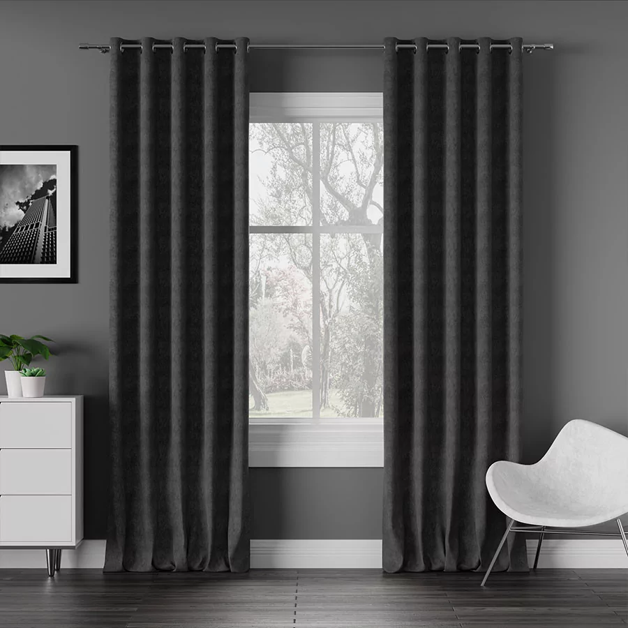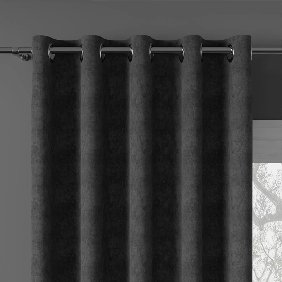 Gotowa do zawieszenia zasłona na przelotkach z gładkiej, miękkiej, aksamitnej w dotyku tkaniny dekoracyjnej.