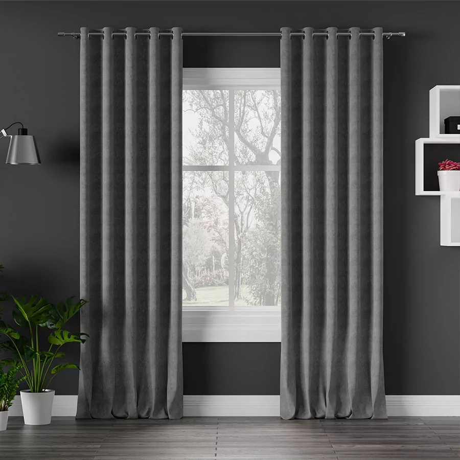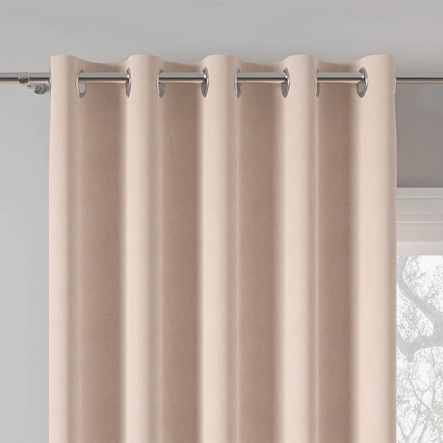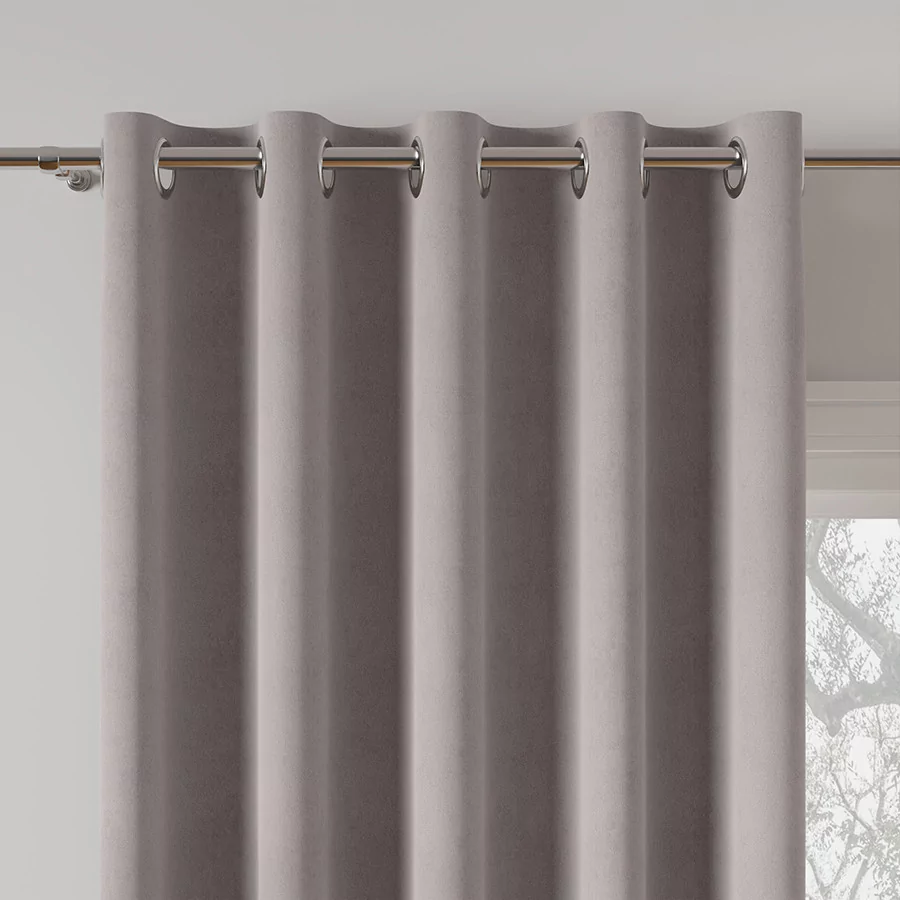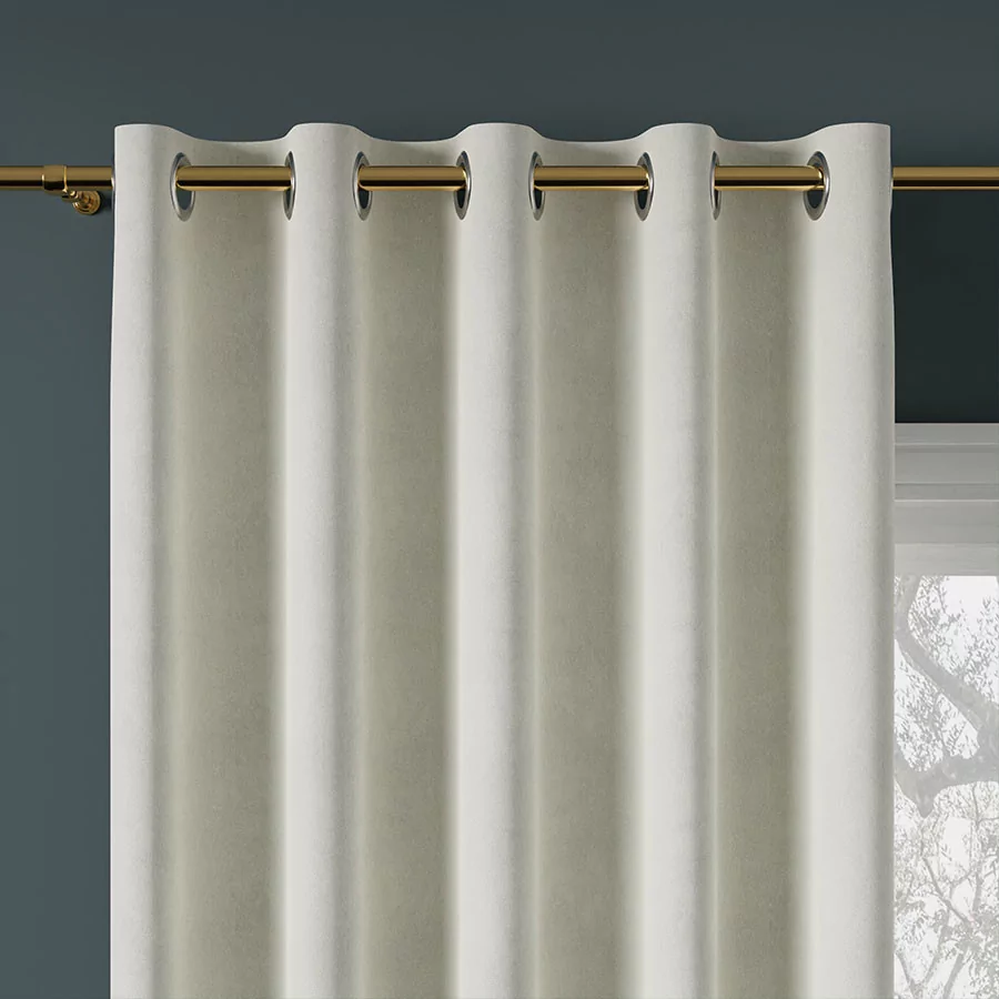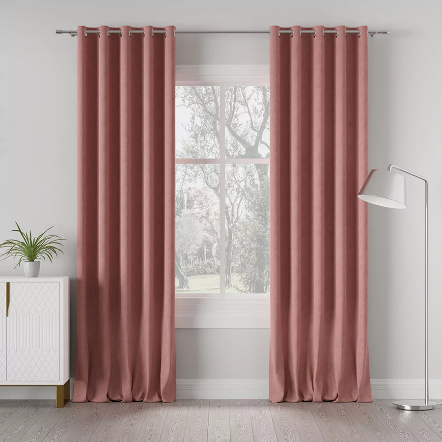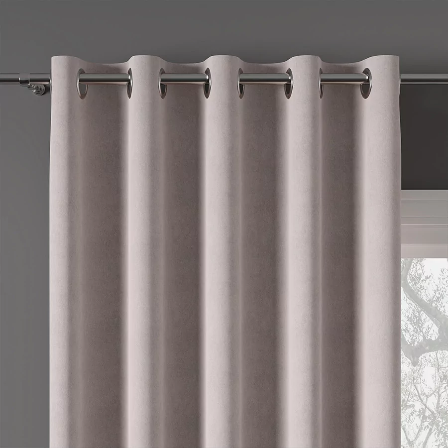 Gotowa do zawieszenia zasłona na przelotkach z gładkiej, miękkiej, aksamitnej w dotyku tkaniny dekoracyjnej.
