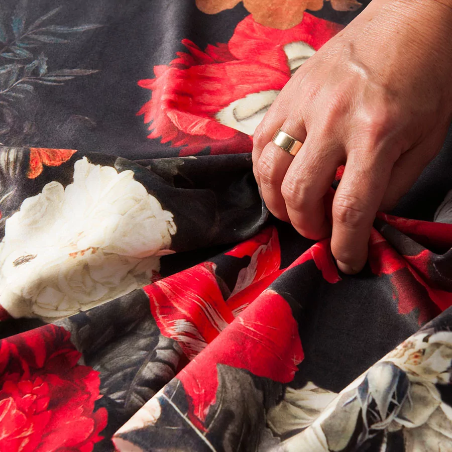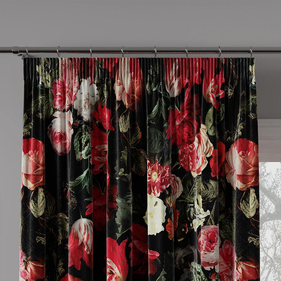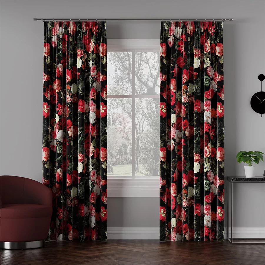 Jednym z najbardziej charakterystycznych elementów tej tkaniny jest nadruk czerwonych kwiatów na czarnym tle, który nadaje jej wyjątkowego i eleganckiego wyglądu. Kwiatowy motyw dodaje wnętrzu romantycznego i kobiecego charakteru, jednocześnie ożywiając przestrzeń. Kolorystyka tkaniny - czerwień na czerni - tworzy kontrastowy i efektowny efekt w pomieszczeniu, przyciągając wzrok i dodając mu głębi. Tkanina ładnie się układa, dzięki czemu z łatwością można ją zawiesić na oknie, tworząc elegancką dekorację. Dodatkowo, welwetowy materiał sprawia, że ma lekko połyskujący wygląd, co dodaje jej luksusowego charakteru. Dzięki takiemu wykończeniu, zasłona staje się nie tylko praktycznym elementem, ale również efektownym dodatkiem do wnętrza. Ta tkanina zasłonowa to doskonały wybór dla osób, które cenią sobie elegancję, styl i komfort w swoim domu. Dzięki swojemu unikalnemu wzornictwu i wysokiej jakości wykonania, sprawi, że każde pomieszczenie nabierze nowego, wyjątkowego charakteru.