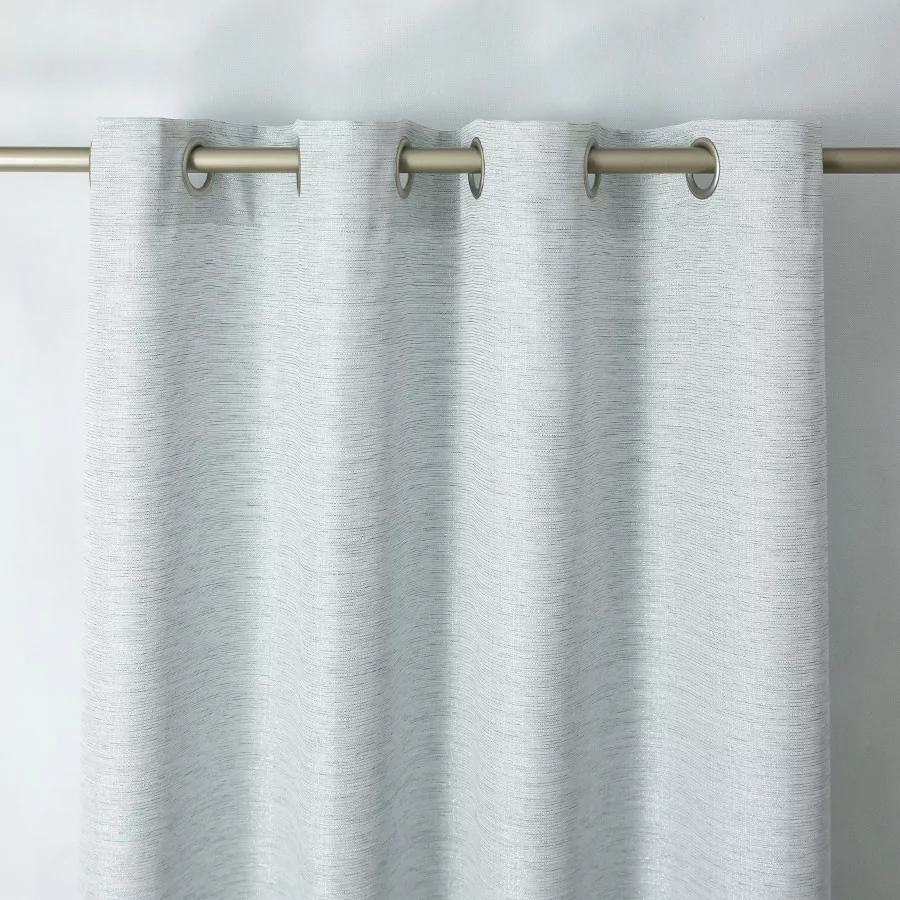 Zasłona gotowa z wykończeniem na taśmie, o lekko surowej strukturze z widoczną prążką. Pasuje do wnętrz nowoczesnych, jak i tych urządzonych w klasycznym stylu. Produkt występuje w kilku modnych kolorach: popiel ze srebrną nicią, pudrowy róż ze srebrną nicią, akcent zieleni ze srebrną nicią i szary ze srebrną nicią.
