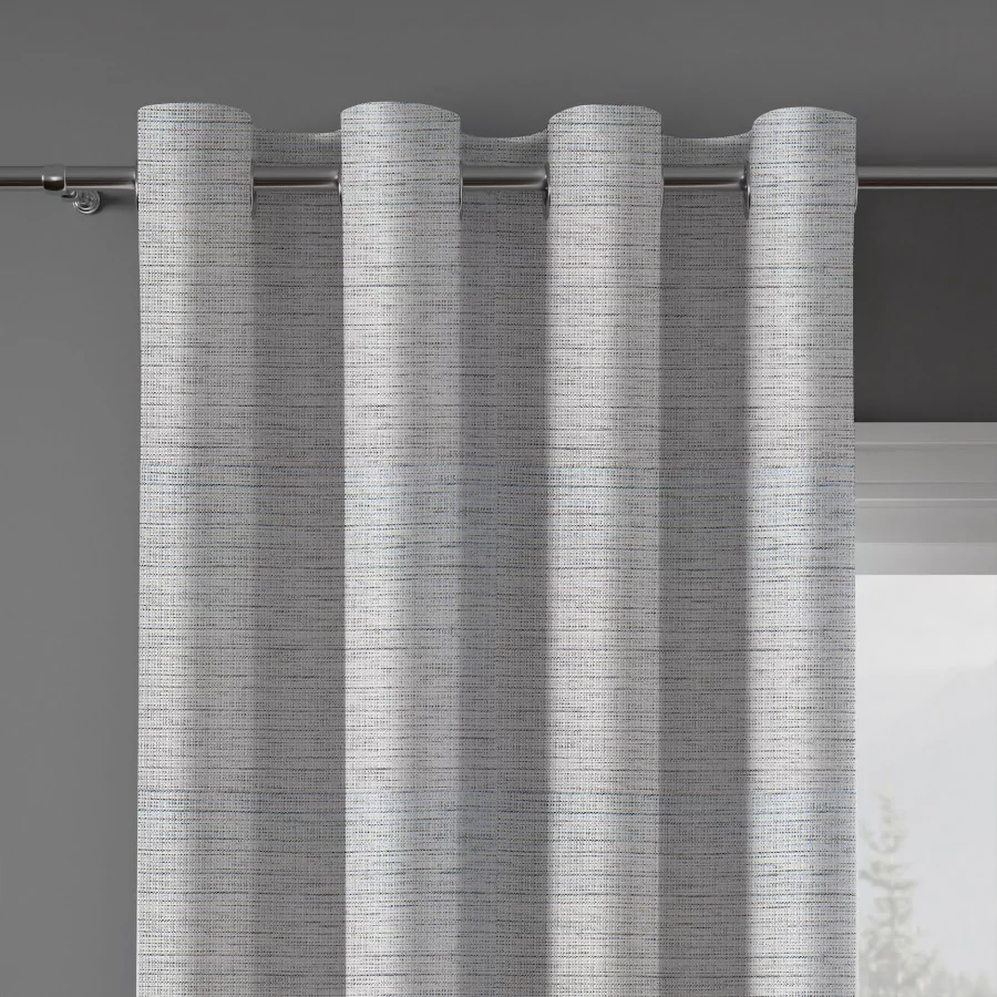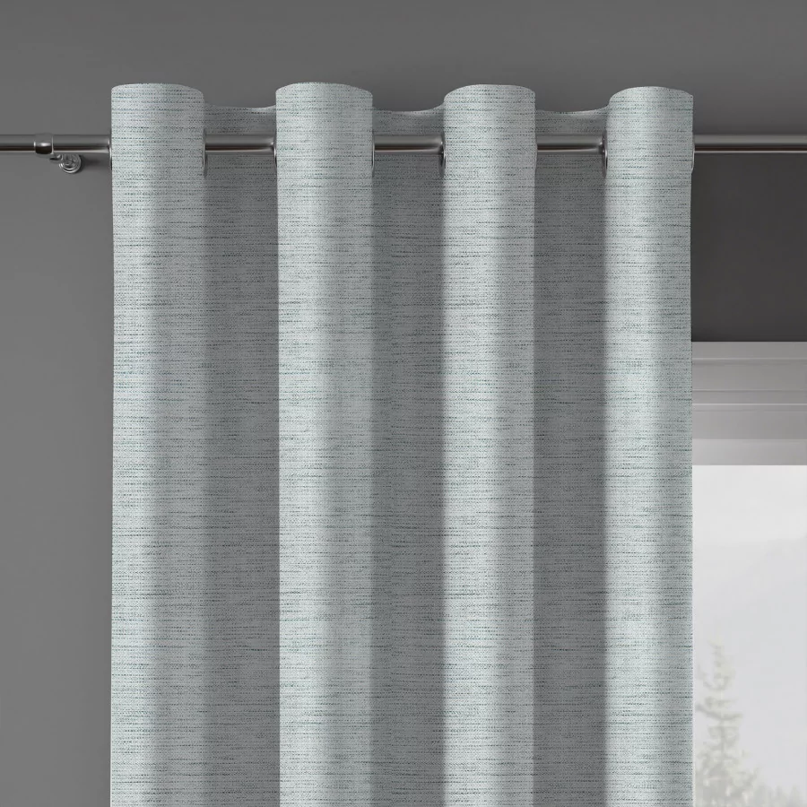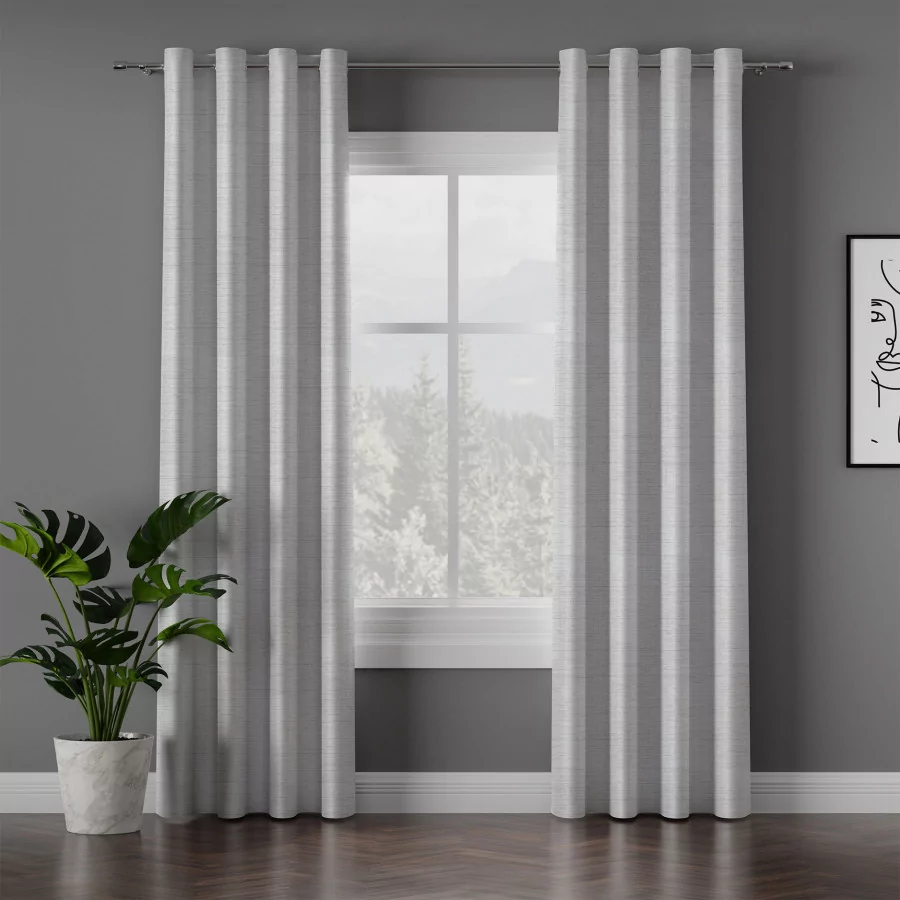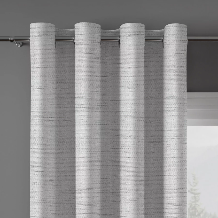 Zasłona gotowa z wykończeniem na przelotkach, o lekko surowej strukturze z widoczną prążką. Pasuje do wnętrz nowoczesnych, jak i tych urządzonych w klasycznym stylu. Produkt występuje w kilku modnych kolorach: popiel ze srebrną nicią, pudrowy róż ze srebrną nicią, akcent zieleni ze srebrną nicią i szary ze srebrną nicią.