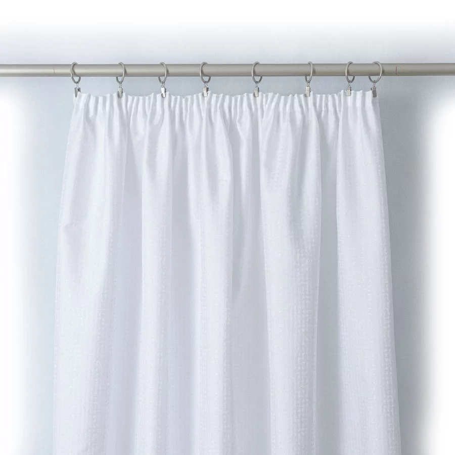 Gotowa do zawieszenia zasłona uszyta z materiału zdobionego nabłyszczaną nicią. Praktyczna zasłona wykończona taśmą marszczącą. Podany rozmiar: szerokość (przed marszczeniem) x wysokość.