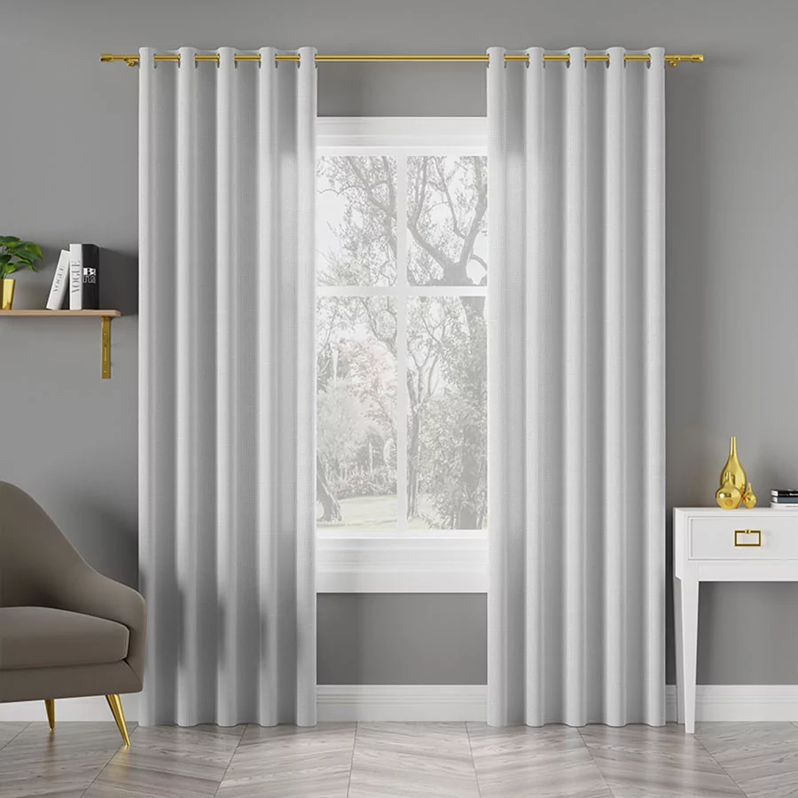 Gotowa do zawieszenia zasłona uszyta z materiału zdobionego nabłyszczaną nicią. Praktyczna zasłona wykończona metalowymi przelotkami. Podany rozmiar: szerokość (przed marszczeniem) x wysokość.