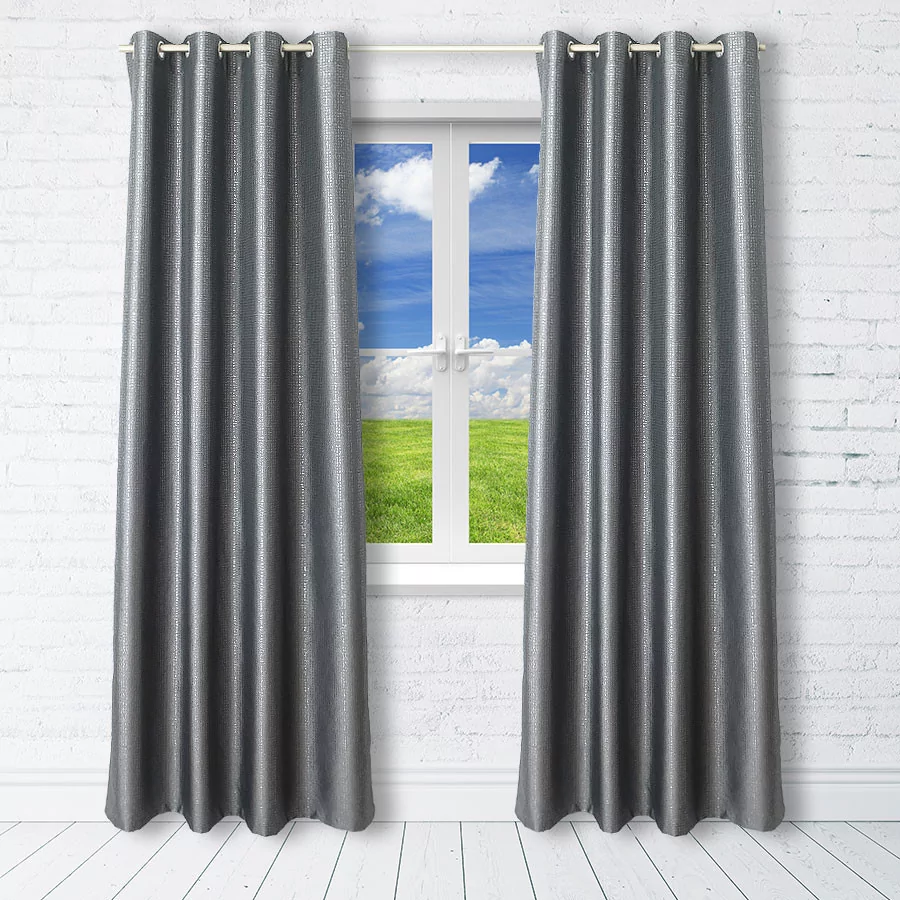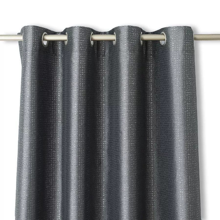 Gotowa do zawieszenia zasłona uszyta z materiału zdobionego nabłyszczaną nicią. Praktyczna zasłona wykończona metalowymi przelotkami. Podany rozmiar: szerokość (przed marszczeniem) x wysokość.