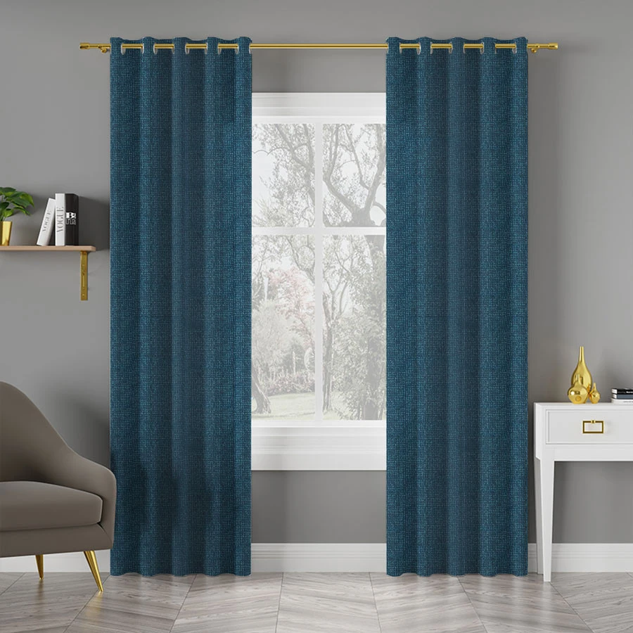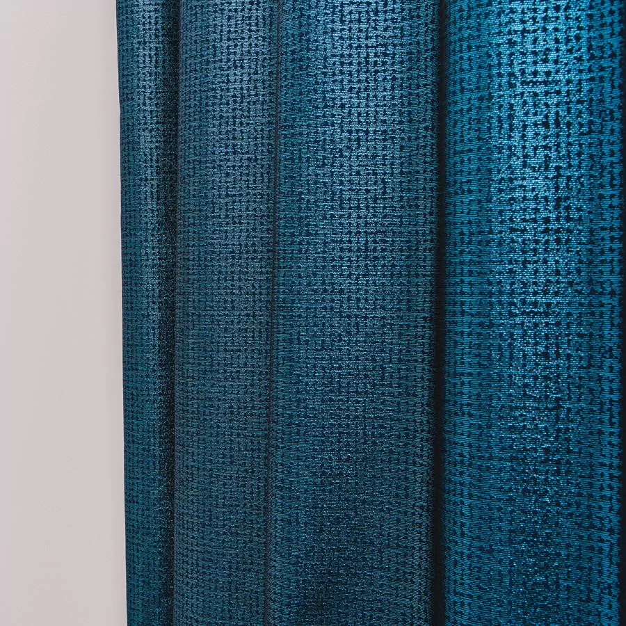 Gotowa do zawieszenia zasłona uszyta z materiału zdobionego nabłyszczaną nicią. Praktyczna zasłona wykończona metalowymi przelotkami. Podany rozmiar: szerokość (przed marszczeniem) x wysokość.