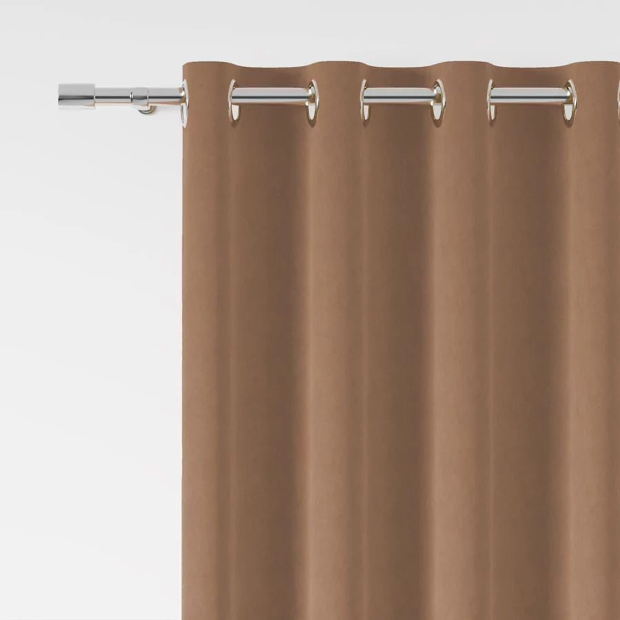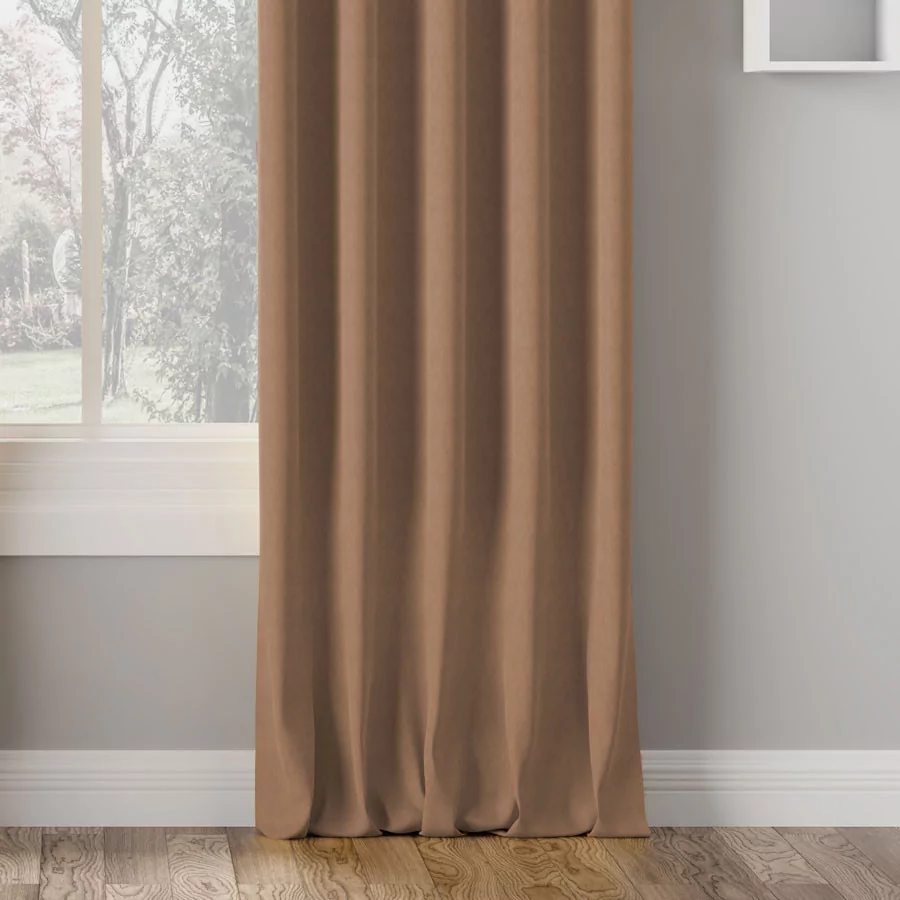 Gotowa do zawieszenia zasłona na przelotkach z gładkiej, miękkiej, aksamitnej w dotyku tkaniny dekoracyjnej.