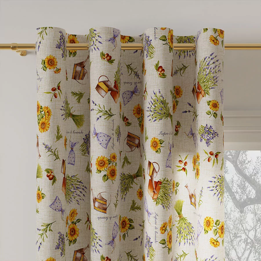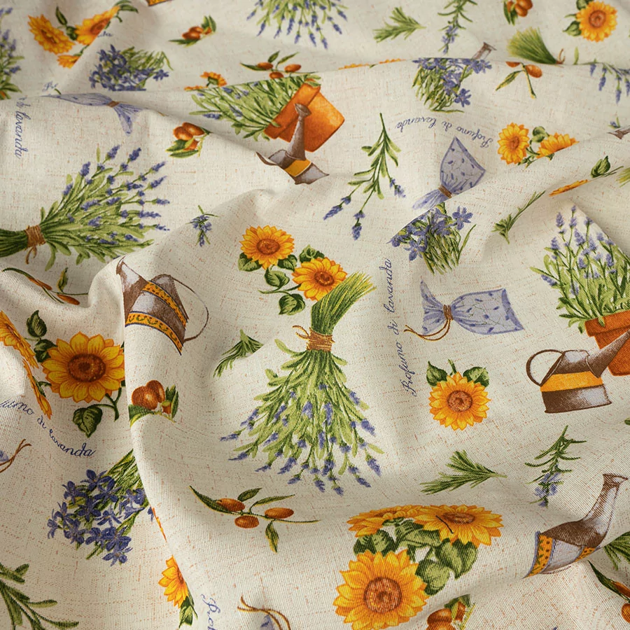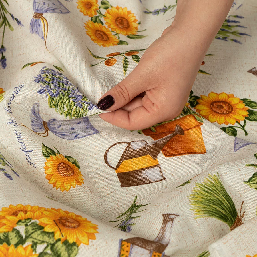 Słoneczniki, konewki i dzbanki, które zdobią tę tkaninę, przenoszą nas myślami na ciepłe letnie dni spędzone na wsi, w otoczeniu natury i świeżego powietrza. Wykonana w 70% z bawełny, tkanina ta jest nie tylko estetyczna, ale również bardzo praktyczna. Dzięki swojej strukturze ładnie się układa, co sprawia, że jest łatwa w obróbce i świetnie nadaje się do różnego rodzaju dekoracji. Można z niej uszyć zasłony, poduszki czy obrusy dodając każdemu pomieszczeniu wyjątkowego charakteru i uroku wiejskiego stylu.