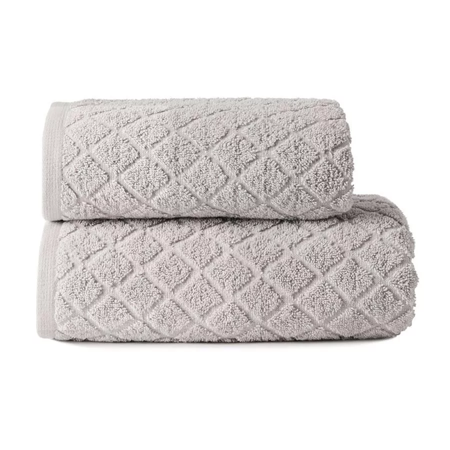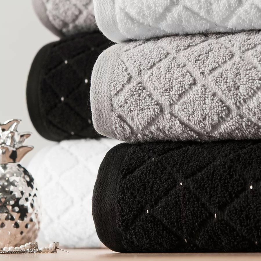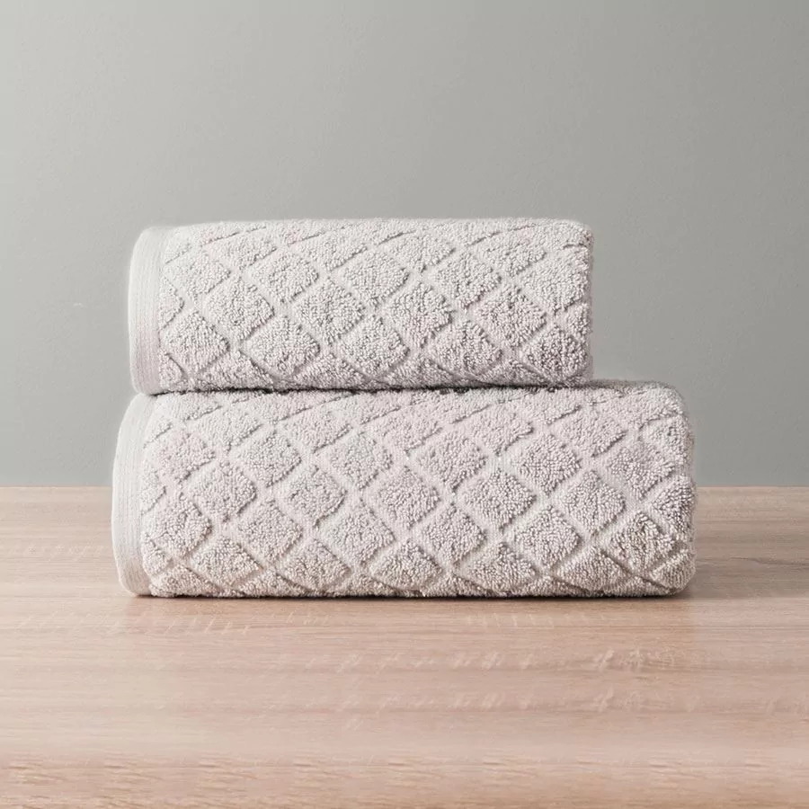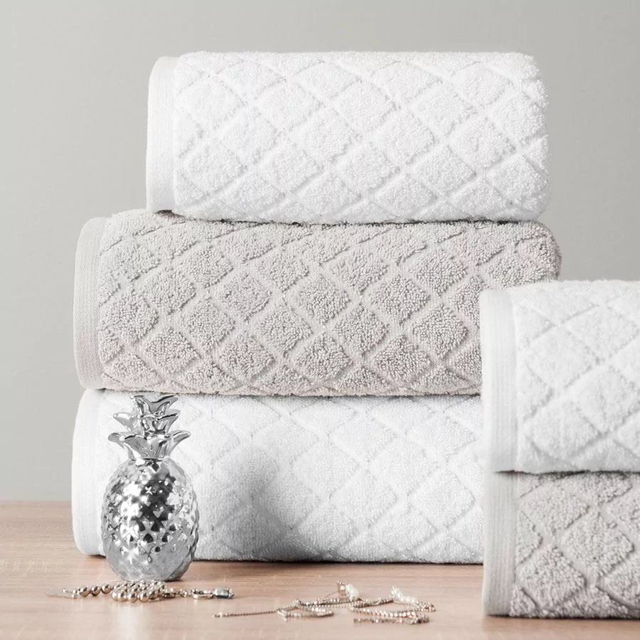 Prosty, geometryczny print dodaje temu produktowi sporo uroku. Równomiernie, ściśle ułożone obok sennie romby układają się w estetyczny wzór poprzecinany poliestrowymi punkcikami. Ten subtelny dodatek dodaje ręcznikowi subtelności i naturalnego piękna. Natomiast wysoka gramatura produktu sprawia, że jego wygląd jest jeszcze atrakcyjniejszy. Puszyste, ułomne w równą kostkę ręczniki wyglądają artykulacyjnie, modnie  i świeżo. Również umieszczone obok siebie na ozdobnych haczykach dodają wnętrzu estetycznego i ciekawego charakteru.