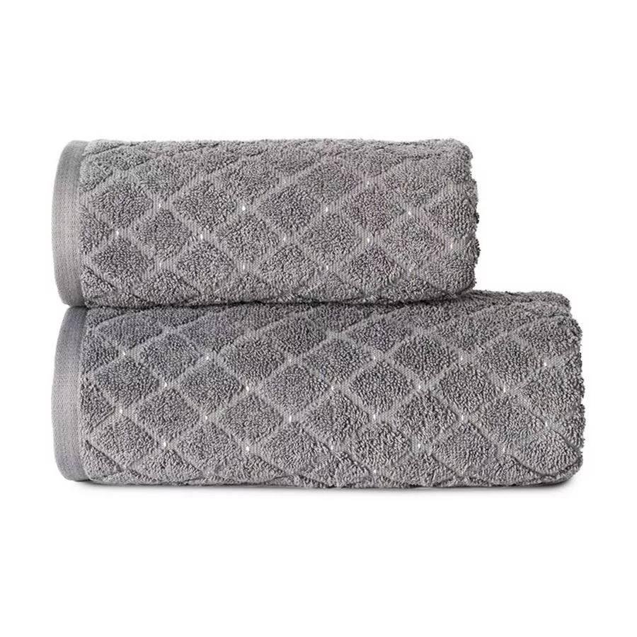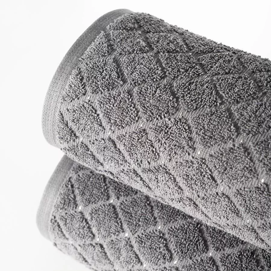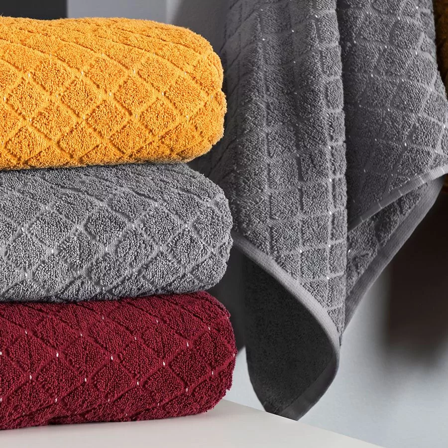 Prosty, geometryczny print dodaje temu produktowi sporo uroku. Równomiernie, ściśle ułożone obok sennie romby układają się w estetyczny wzór poprzecinany poliestrowymi punkcikami. Ten subtelny dodatek dodaje ręcznikowi subtelności i naturalnego piękna. Natomiast wysoka gramatura produktu sprawia, że jego wygląd jest jeszcze atrakcyjniejszy. Puszyste, ułomne w równą kostkę ręczniki wyglądają artykulacyjnie, modnie  i świeżo. Również umieszczone obok siebie na ozdobnych haczykach dodają wnętrzu estetycznego i ciekawego charakteru.