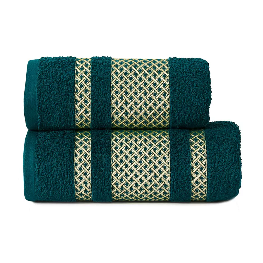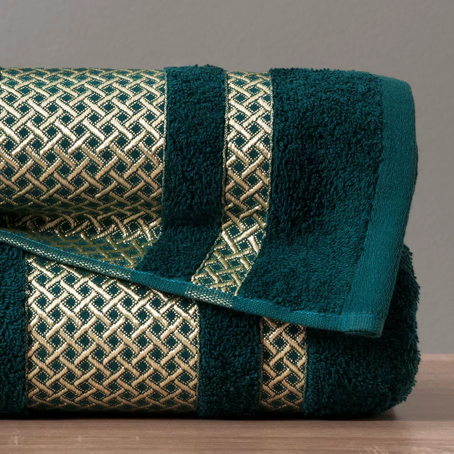Przyglądając się designowi ręcznika kąpielowego Lionel, można odnieść wrażenie, że gładka struktura i wzór doskonale się uzupełniają. Główny element z frotte to niezwykle puszysty, przytulny materiał bawełniany. Z kolei kratkowany złoty wzór wykonany jest z włókna poliestrowego. Na ręczniku widoczne są dwa węższe i jeden szeroki pas z taką strukturą. Tworzy to wrażenie trójwymiarowości i doskonale się prezentuje. Świetnie współgra z połyskującymi złotymi elementami we wnętrzu, tworząc monochromatyczne połączenie w stylu glamour. ęcznik dostępny jest w wielu kolorach i rozmiarach.