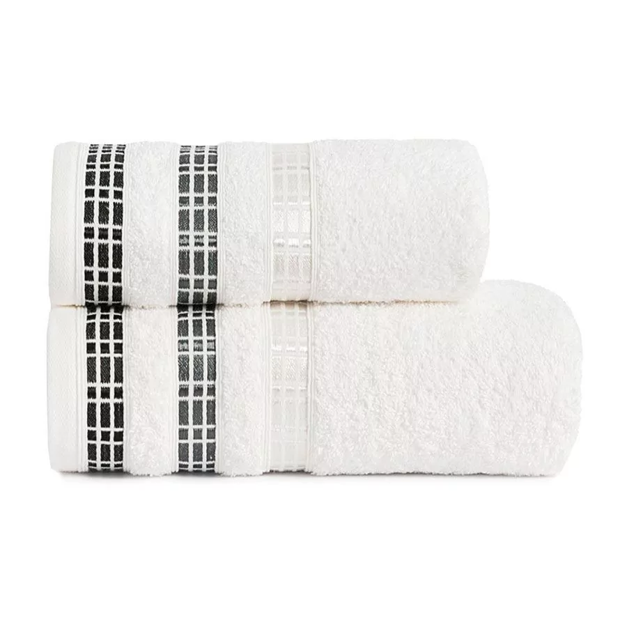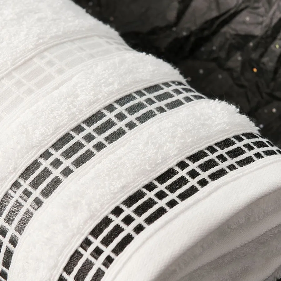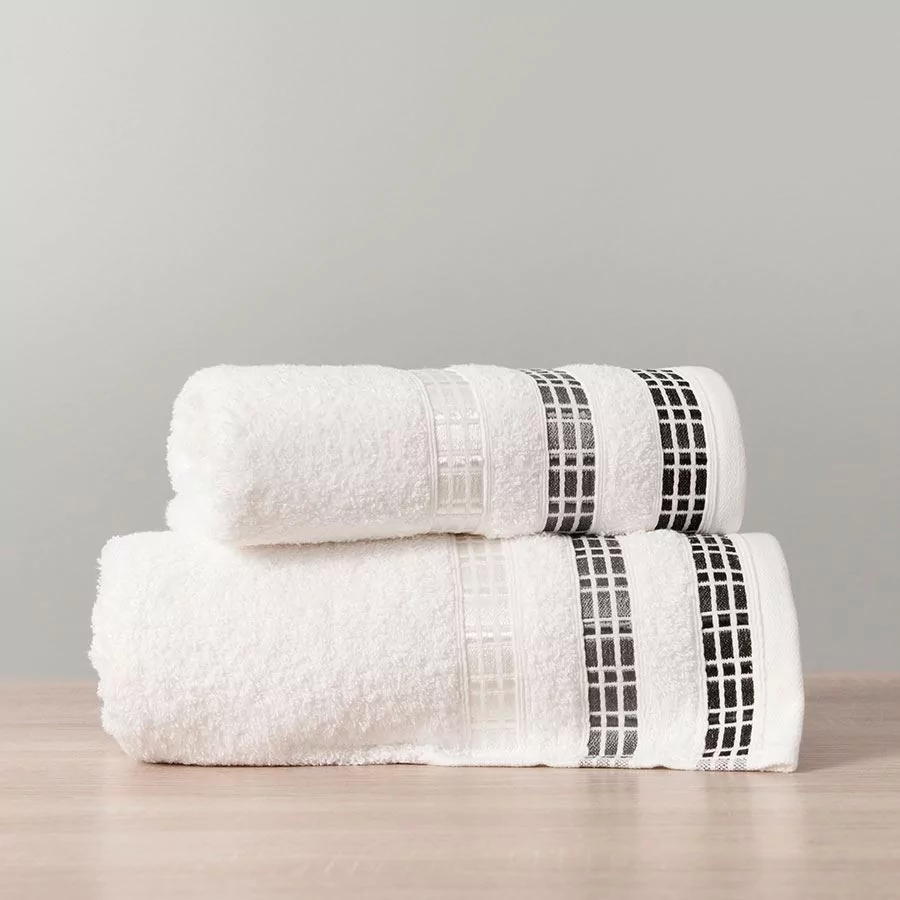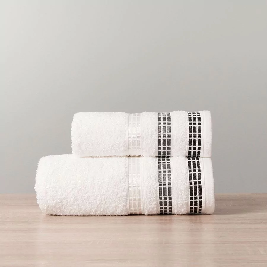 Udanej całości dopełnia geometryczna prosta bordiura, którą stanowią trzy grubsze pasy wyplenione prostokątami i kwadracikami. Lekko połyskliwa faktura daje ręcznikom szczypty elegancji i osobliwego szyku. Jeśli cenisz sobie połączenie bezpretensjonalności z nowoczesnością, te ręczniki są stworzone dla Ciebie.