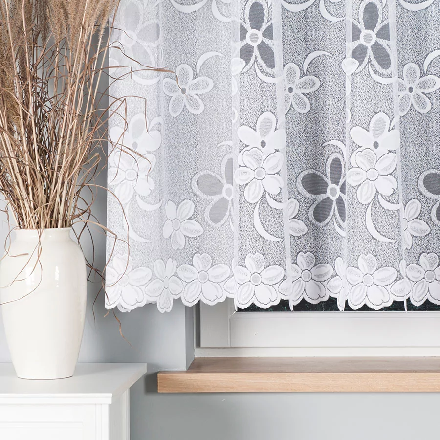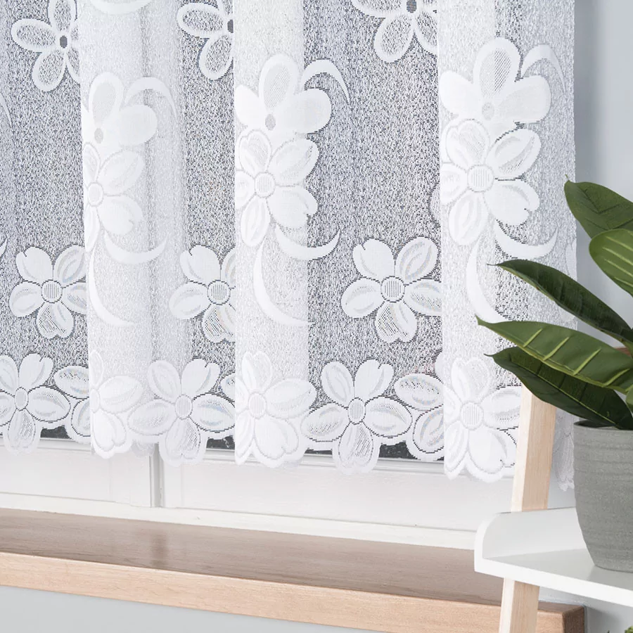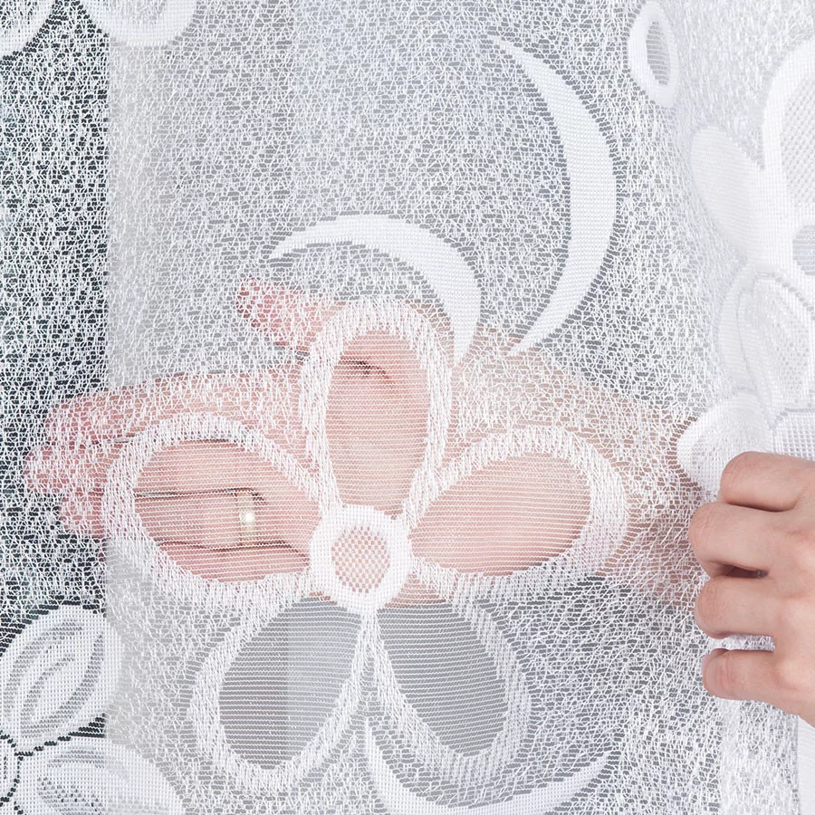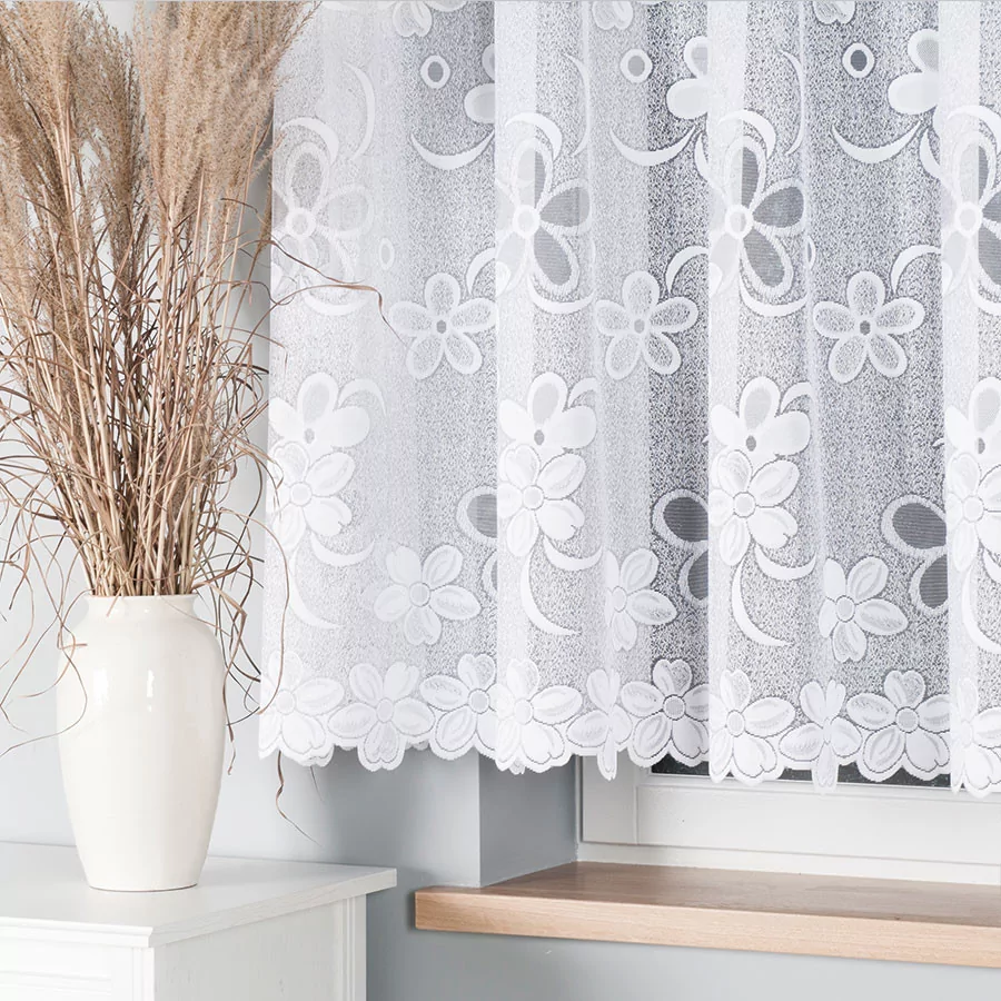 Firanka żakardowa dostępna w metrażu z gęstym motywem roślinnym. Wiele wysokości o wyboru, szerokość dowolna, dzięki czemu dopasujesz ją dokładnie do swojego okna. Firankę możesz zamówić z usługą szycia w naszej profesjonalnej szwalni - wybierz wykończenie, podaj wymiary, a otrzymasz uszytą i gotową do zawieszenia firankę. Najwyższa jakość przędzy żakardowej idealnie wkomponuje się w aranżację wnętrz nowoczesnych jak i tych urządzonych w klasycznym stylu. Firanka pięknie się układa, nie wymaga prasowania i można ją prać w pralce w niskiej temperaturze. Cechuje ją dobra przepuszczalność powietrza i promieni słonecznych.
