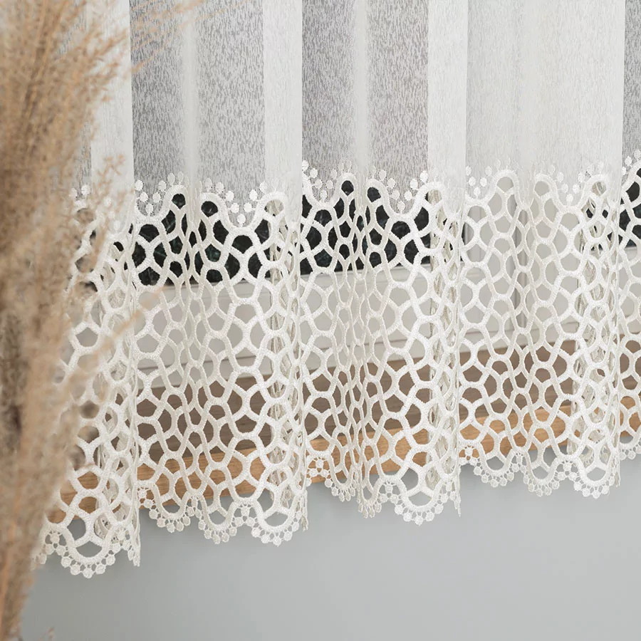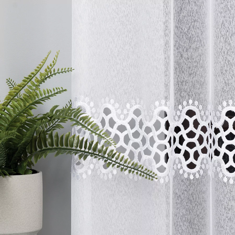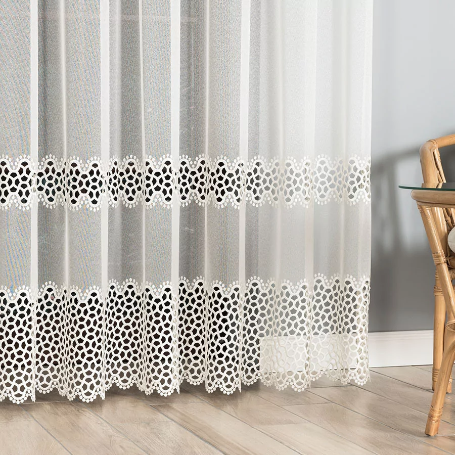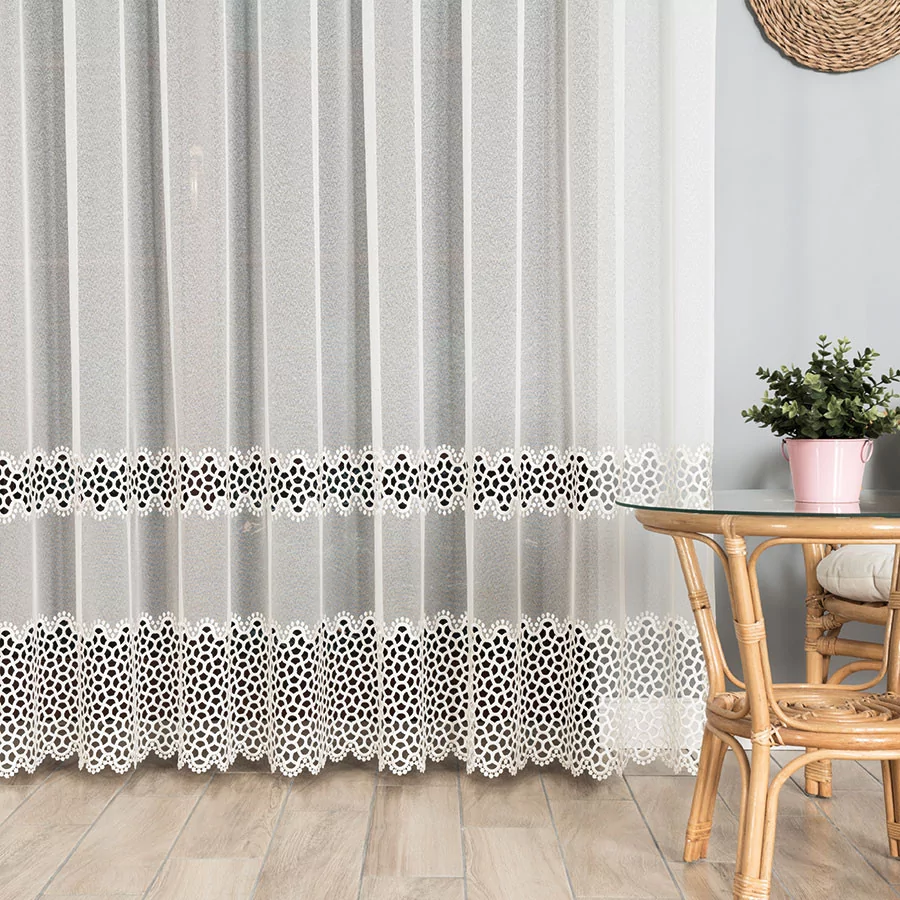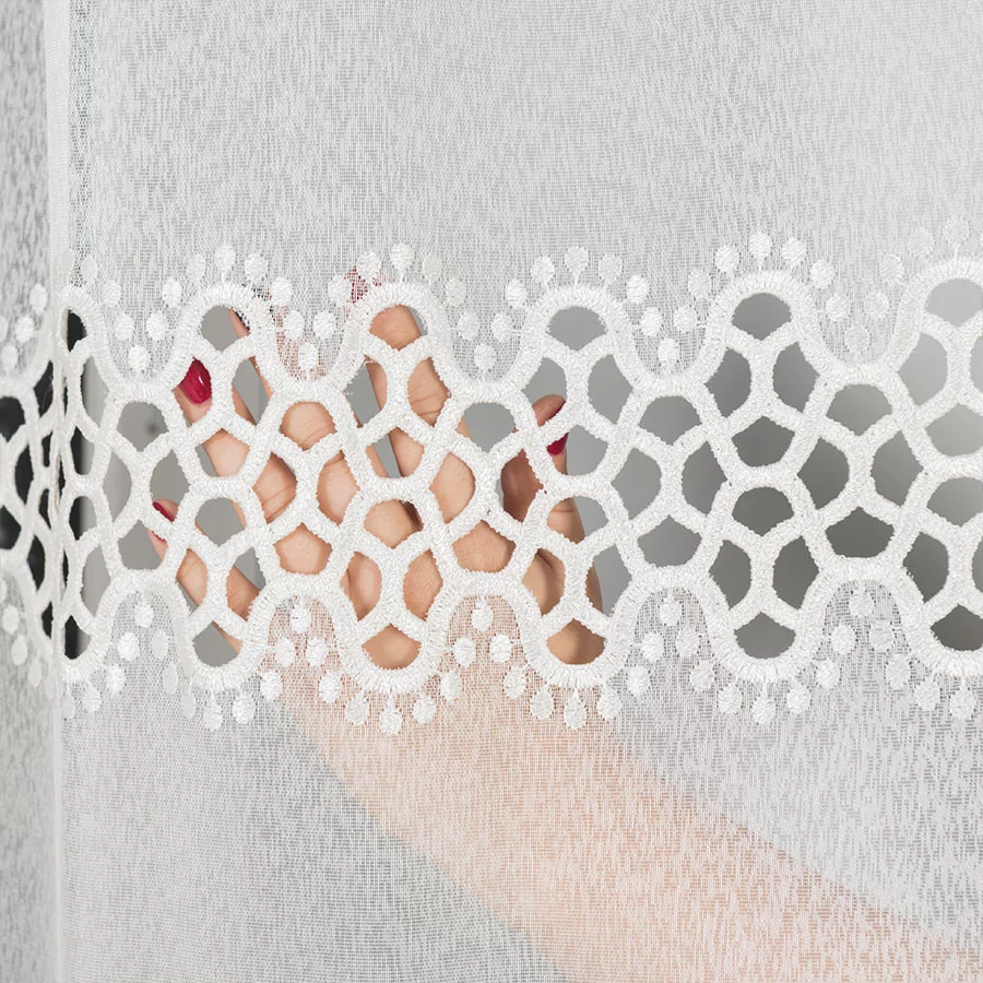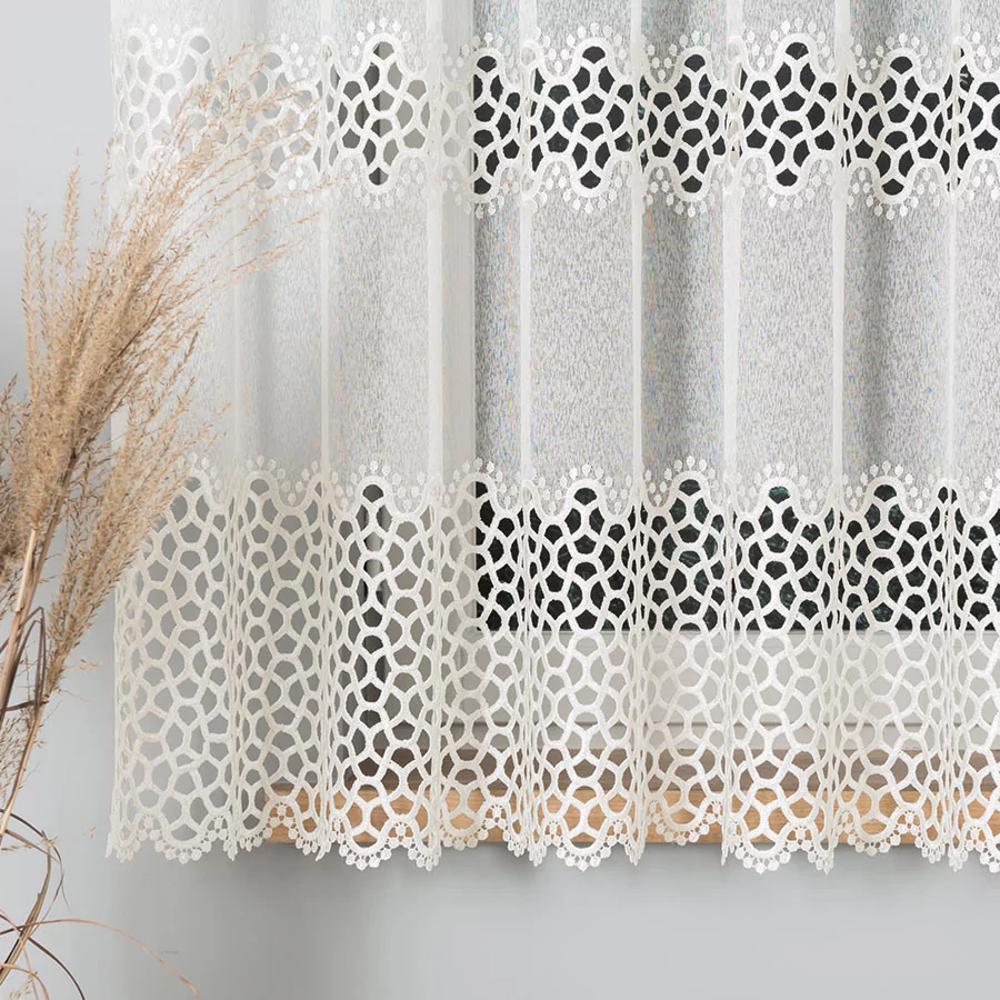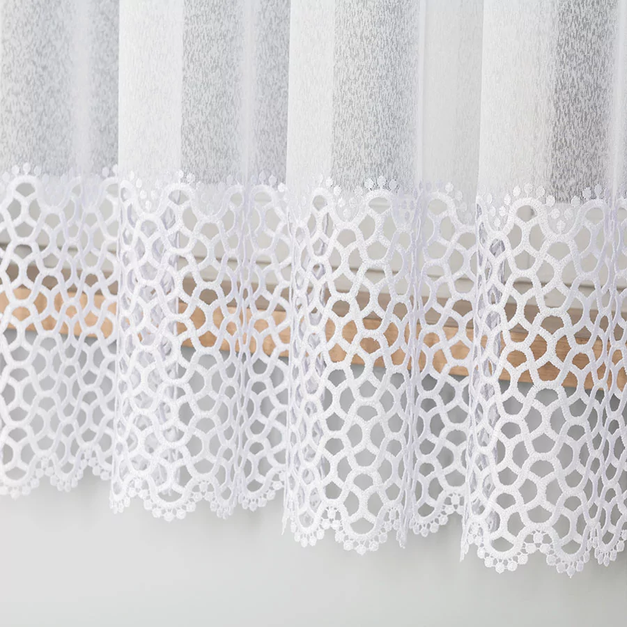 Poznaj naszą propozycję firanki metrażowej z aplikacją gipiurową. Wzór dostępny jest w kilku wysokościach, szerokość natomiast jest dowolna, dzięki czemu możemy uszyć firankę dopasowaną do Twoich potrzeb. Firanka została wykonana na delikatnym podkładzie z markizety. Pięknie się układa. Prosty i klasyczny akcent dekoracyjny z gipiurowymi wstawkami doda ciekawego charakteru i stylu w naszych wnętrzach. Tkaninę cechuje niezwykła lekkość i zwiewność.