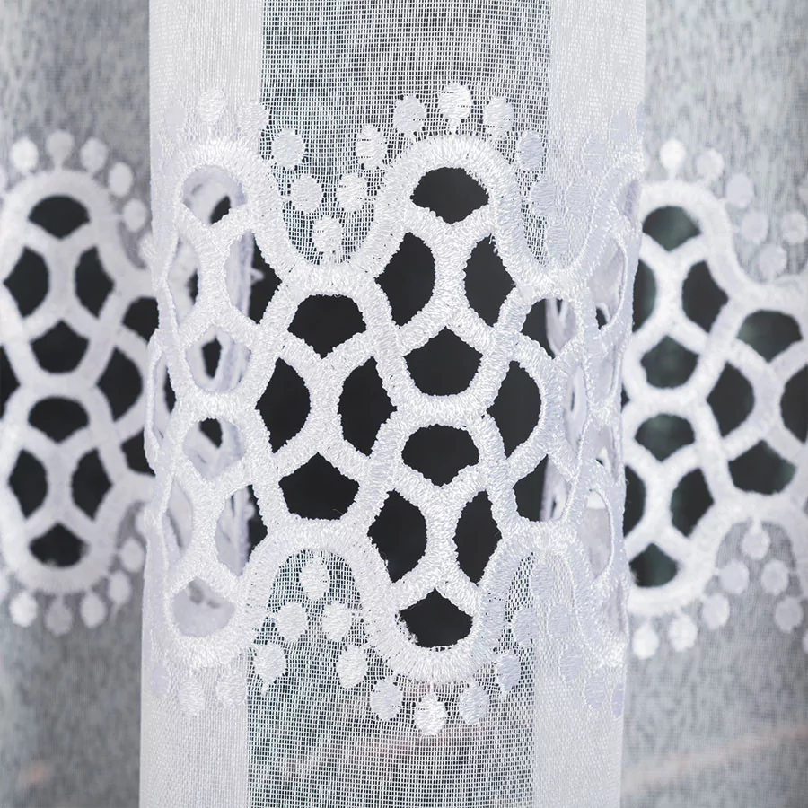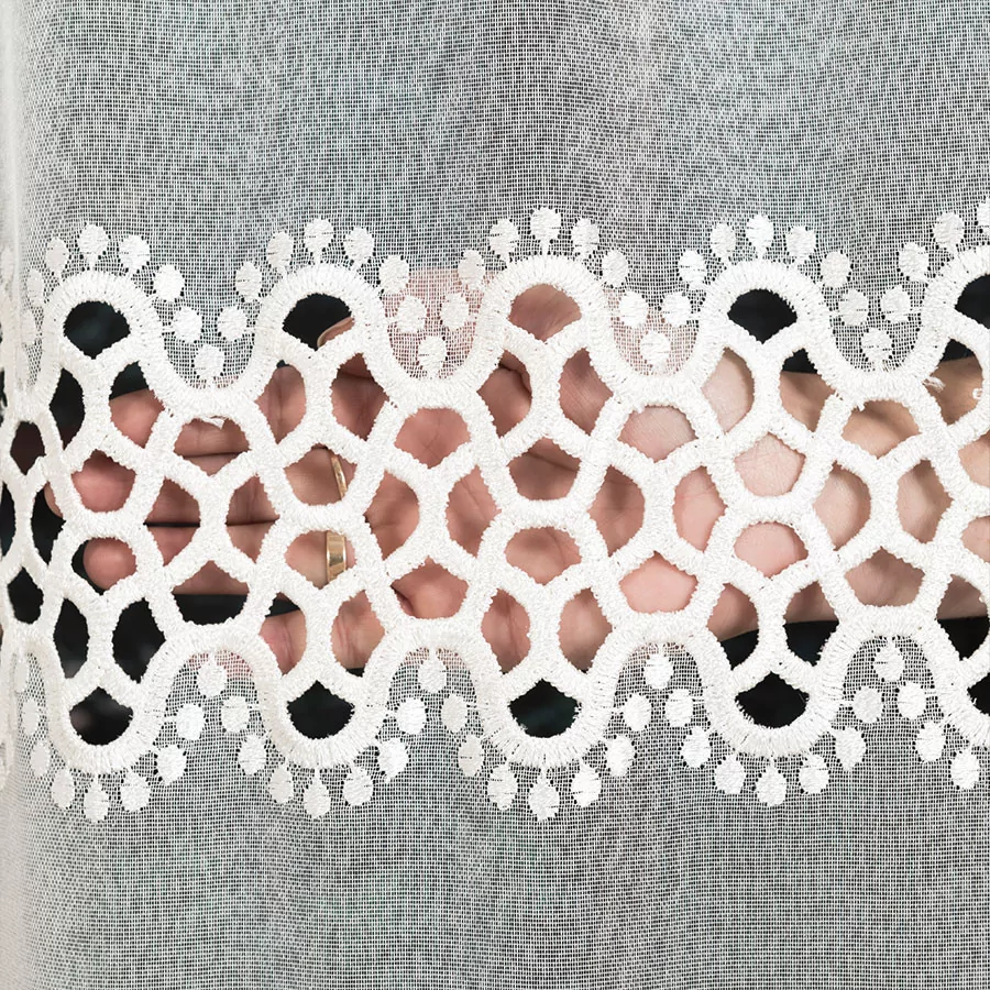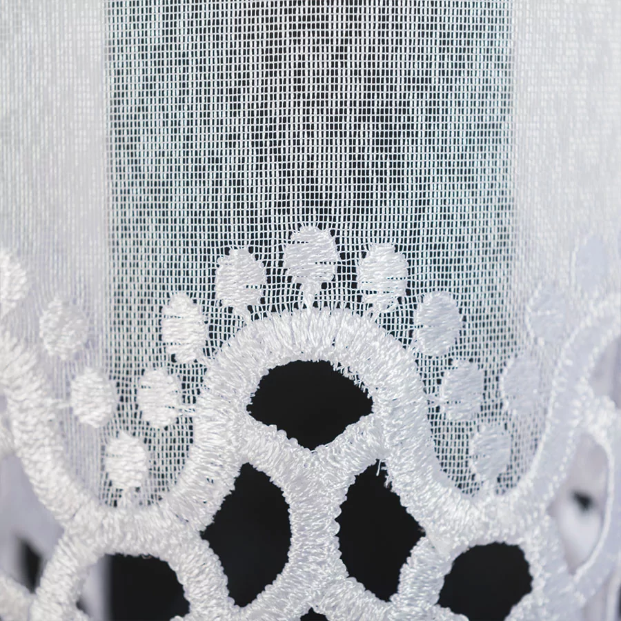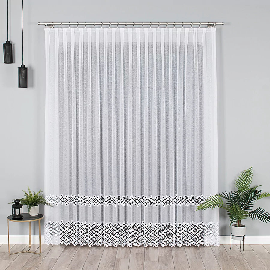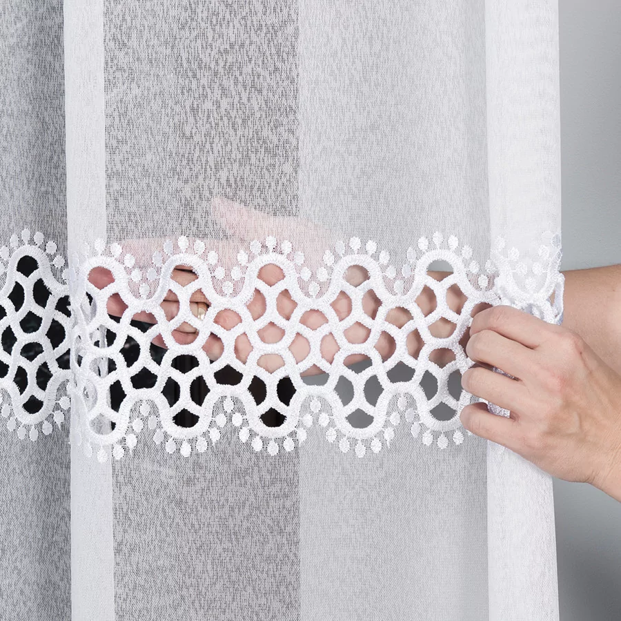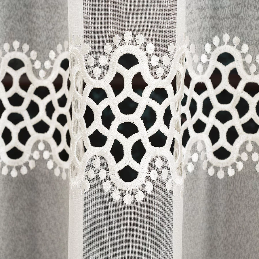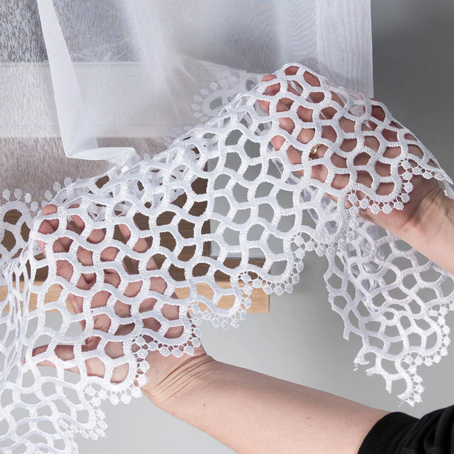 Poznaj naszą propozycję firanki metrażowej z aplikacją gipiurową. Wzór dostępny jest w kilku wysokościach, szerokość natomiast jest dowolna, dzięki czemu możemy uszyć firankę dopasowaną do Twoich potrzeb. Firanka została wykonana na delikatnym podkładzie z markizety. Pięknie się układa. Prosty i klasyczny akcent dekoracyjny z gipiurowymi wstawkami doda ciekawego charakteru i stylu w naszych wnętrzach. Tkaninę cechuje niezwykła lekkość i zwiewność.