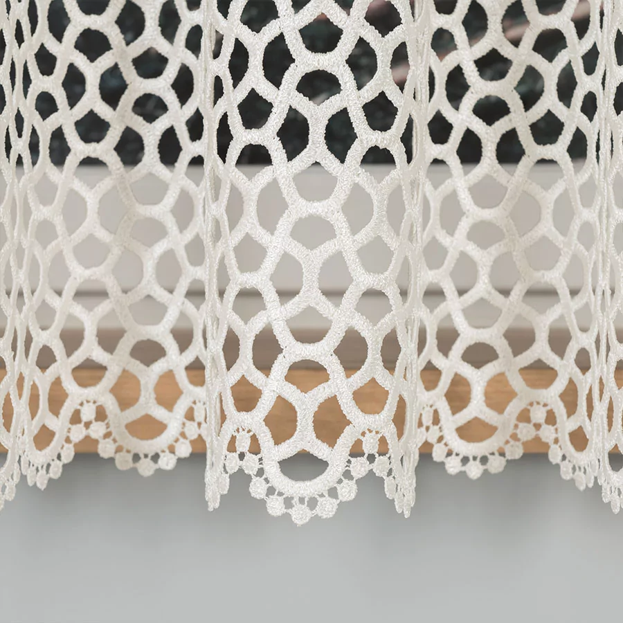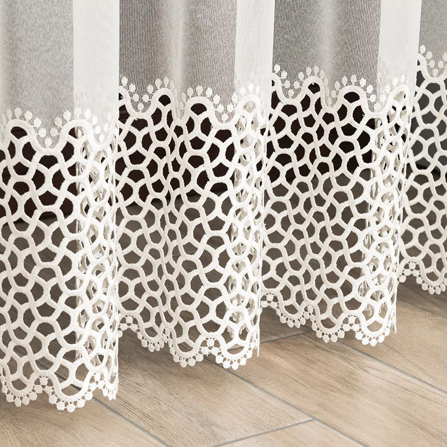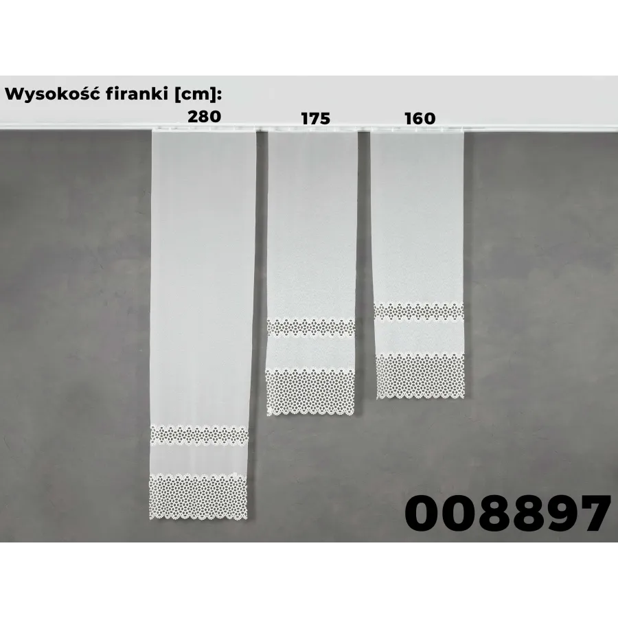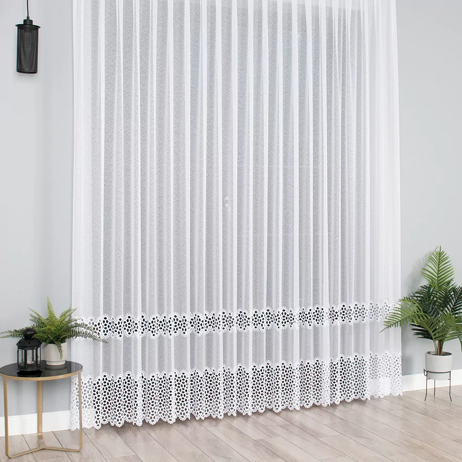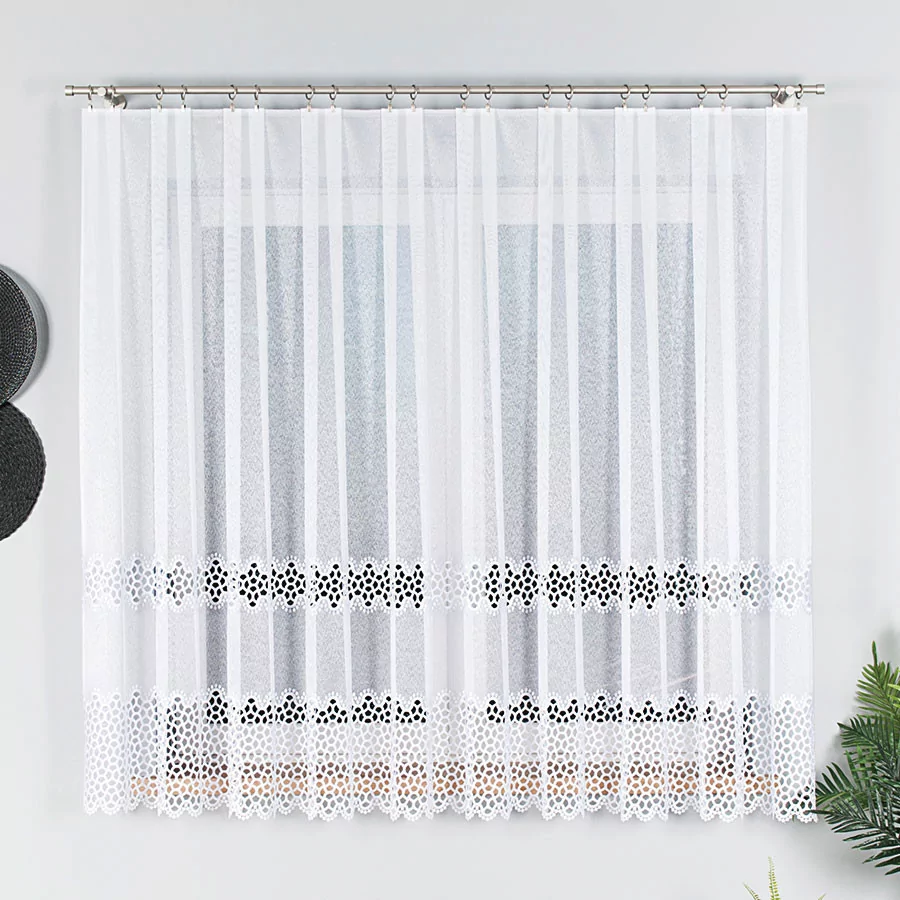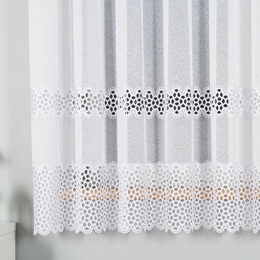 Poznaj naszą propozycję firanki metrażowej z aplikacją gipiurową. Wzór dostępny jest w kilku wysokościach, szerokość natomiast jest dowolna, dzięki czemu możemy uszyć firankę dopasowaną do Twoich potrzeb. Firanka została wykonana na delikatnym podkładzie z markizety. Pięknie się układa. Prosty i klasyczny akcent dekoracyjny z gipiurowymi wstawkami doda ciekawego charakteru i stylu w naszych wnętrzach. Tkaninę cechuje niezwykła lekkość i zwiewność.