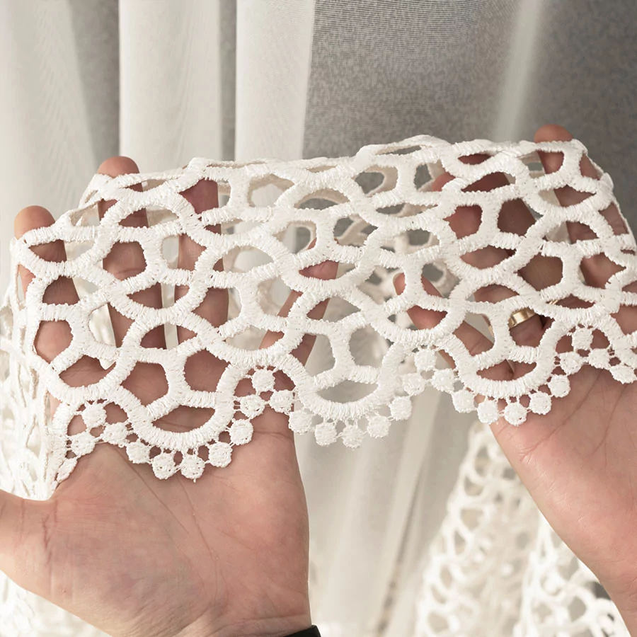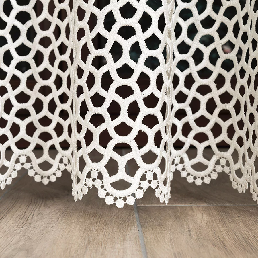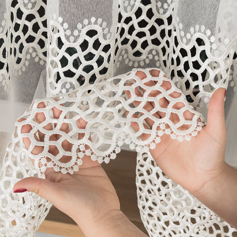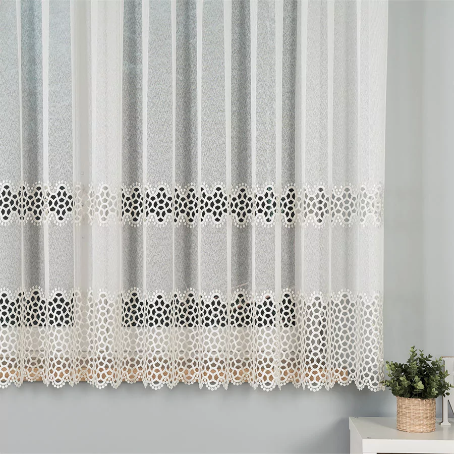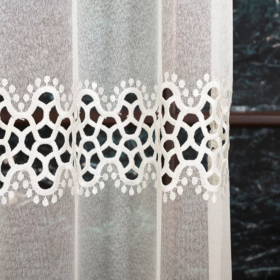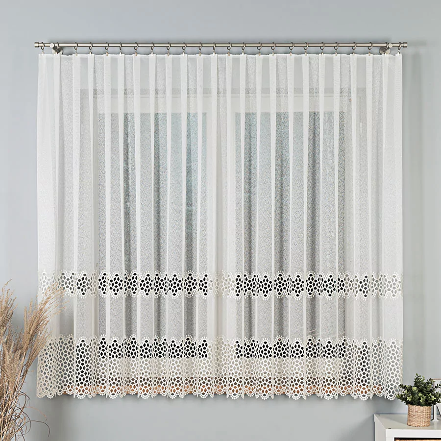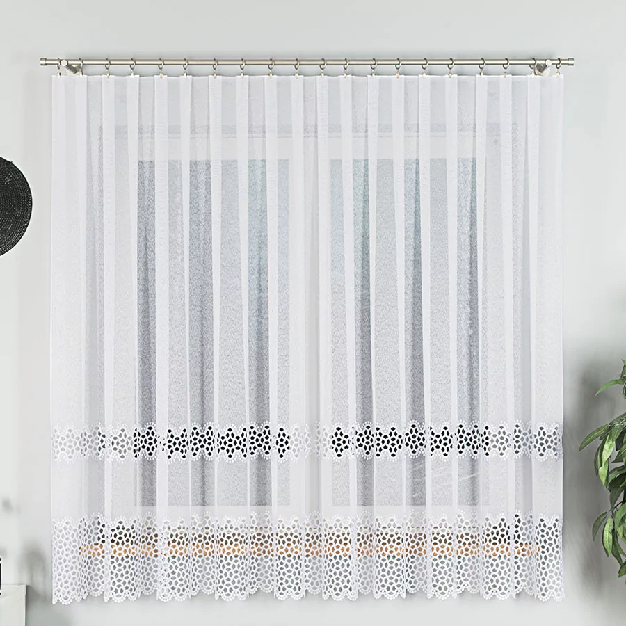 Poznaj naszą propozycję firanki metrażowej z aplikacją gipiurową. Wzór dostępny jest w kilku wysokościach, szerokość natomiast jest dowolna, dzięki czemu możemy uszyć firankę dopasowaną do Twoich potrzeb. Firanka została wykonana na delikatnym podkładzie z markizety. Pięknie się układa. Prosty i klasyczny akcent dekoracyjny z gipiurowymi wstawkami doda ciekawego charakteru i stylu w naszych wnętrzach. Tkaninę cechuje niezwykła lekkość i zwiewność.