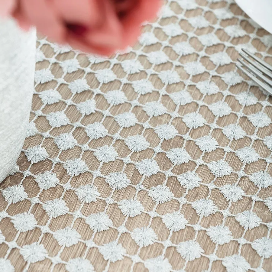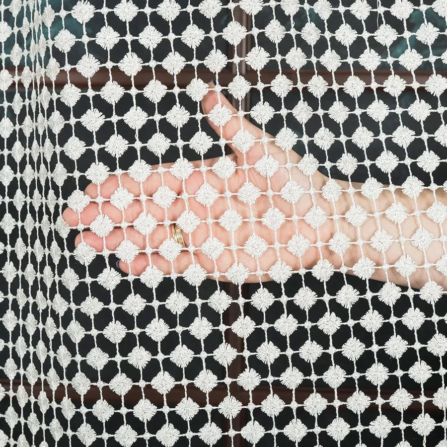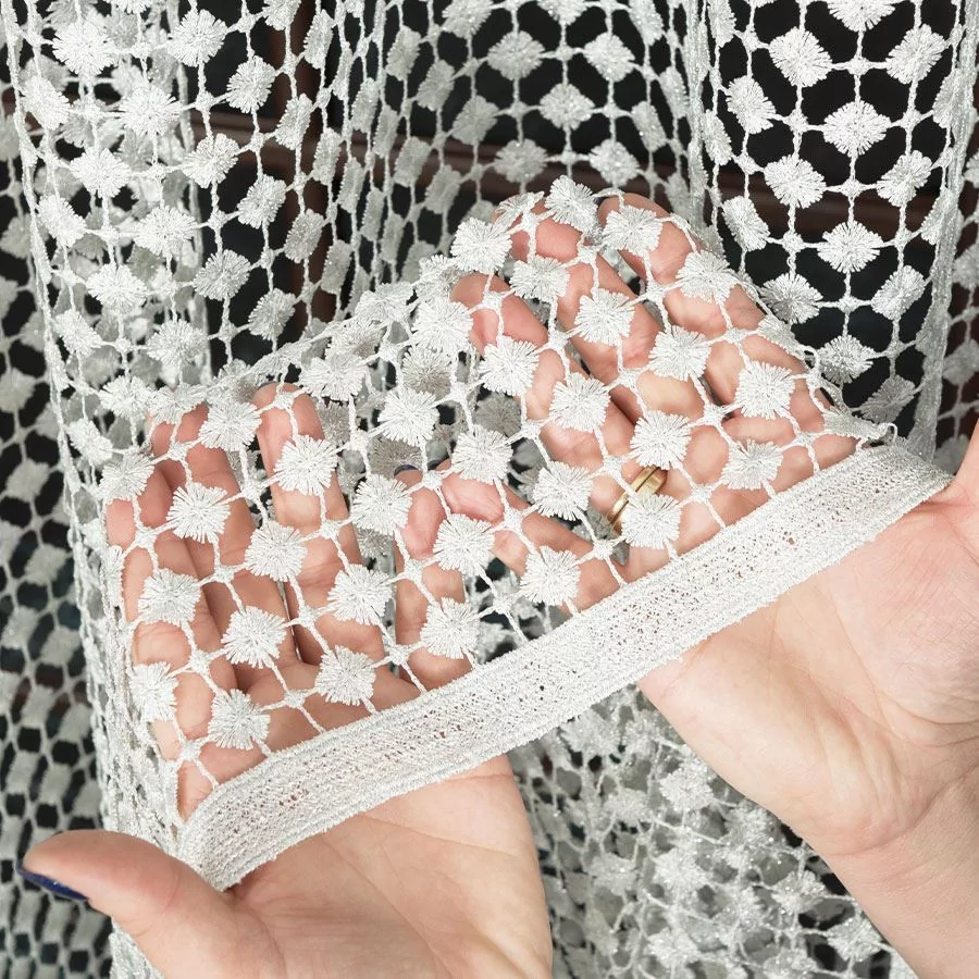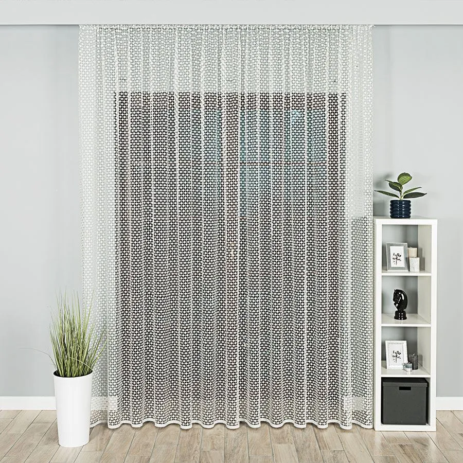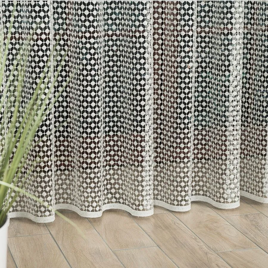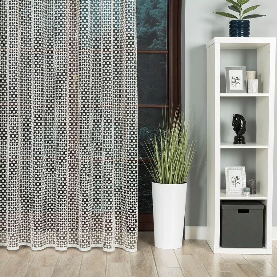 Bez wątpienia gipiura to materiał, który zachwyca swoją dekoracyjną strukturą. Mocne nitki, tworzą ozdobne sploty i wzory. W przypadku firanki metrażowej 061757 jest to 100% poliester, który jest trwały, ma mocny splot i jest odporny na uszkodzenia. Warto podkreślić, że żakard to materiał łatwy w pielęgnacji. Ponadto po praniu nie ma konieczności prasowania firany. Wystarczy drobne zagniecenia wygładzić parownicą. Materiał nie jest podatny na zgniecenia, co jest niewątpliwą zaletą. Bez wątpienia kolejnym atutem jest połyskująca struktura. Wszystko dzięki użytym nitkom z włókna poliestrowego.