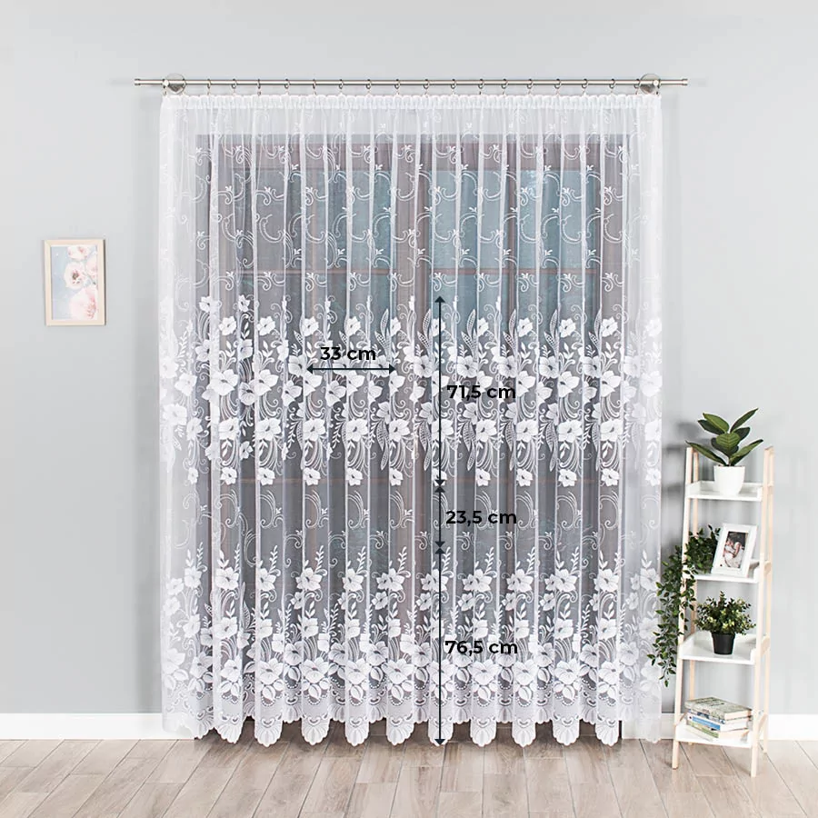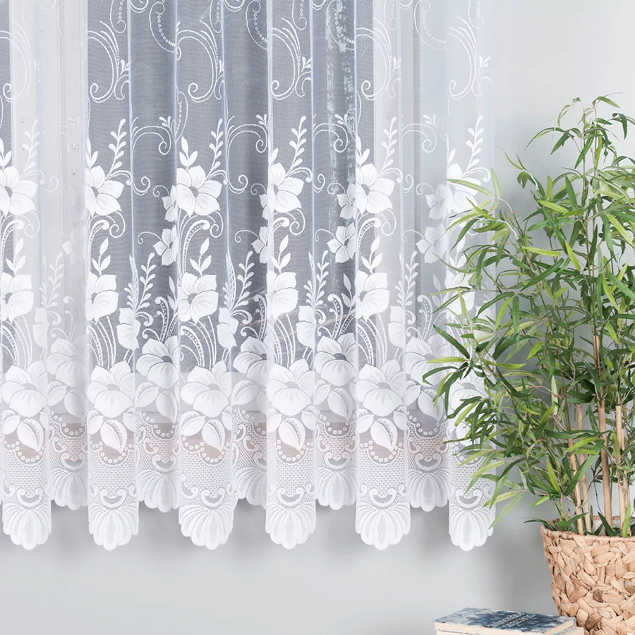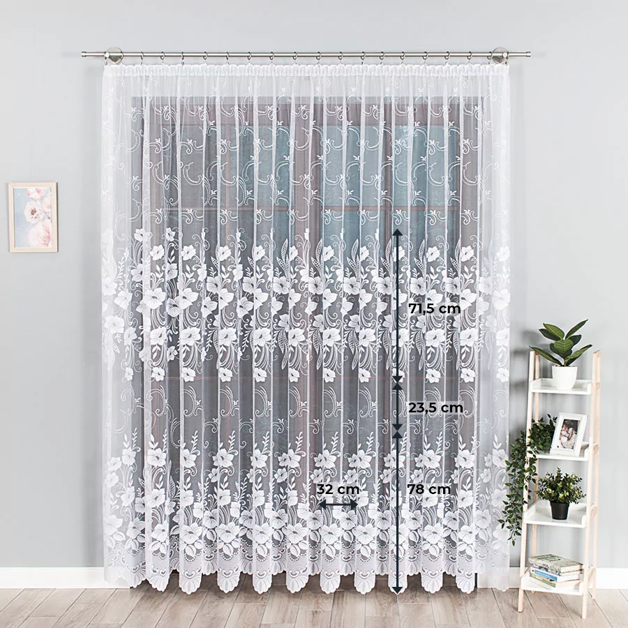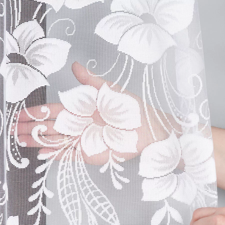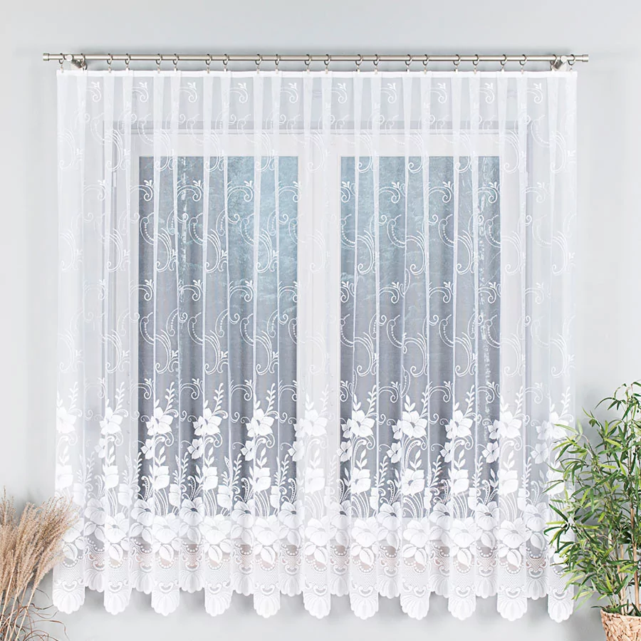 Firanka żakardowa dostępna w metrażu, w kolorze białym, z motywem kwiatowym. Wiele wysokości do wyboru a szerokość jest dowolna, dzięki czemu dopasujesz ją dokładnie do swojego okna. Firankę możesz zamówić z usługą szycia w naszej profesjonalnej szwalni - wybierz wykończenie, podaj wymiary, a otrzymasz uszytą i gotową do zawieszenia firankę. Najwyższa jakość przędzy żakardowej idealnie wkomponuje się w aranżację wnętrz nowoczesnych jak i tych urządzonych w klasycznym stylu. Firanka pięknie się układa, nie wymaga prasowania i można ją prać w pralce w niskiej temperaturze. Cechuje ją dobra przepuszczalność powietrza i promieni słonecznych.