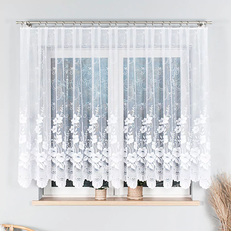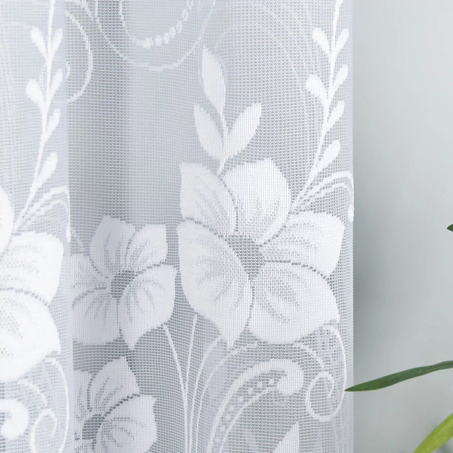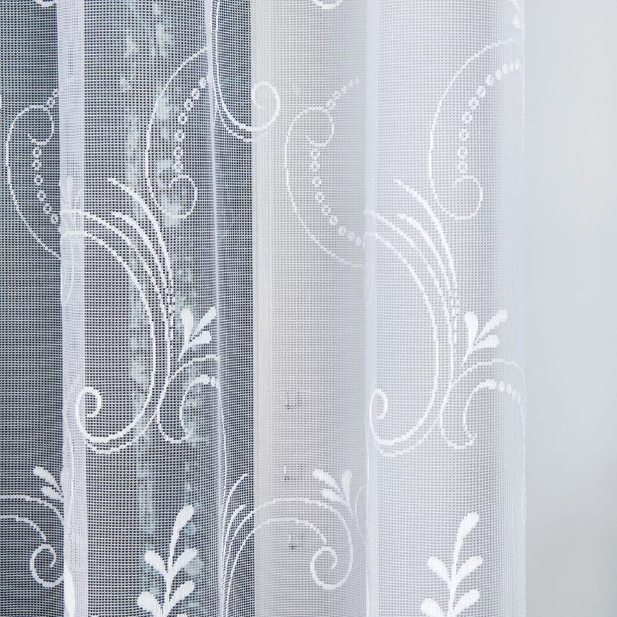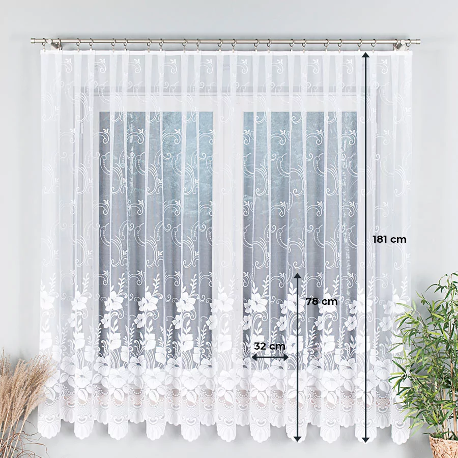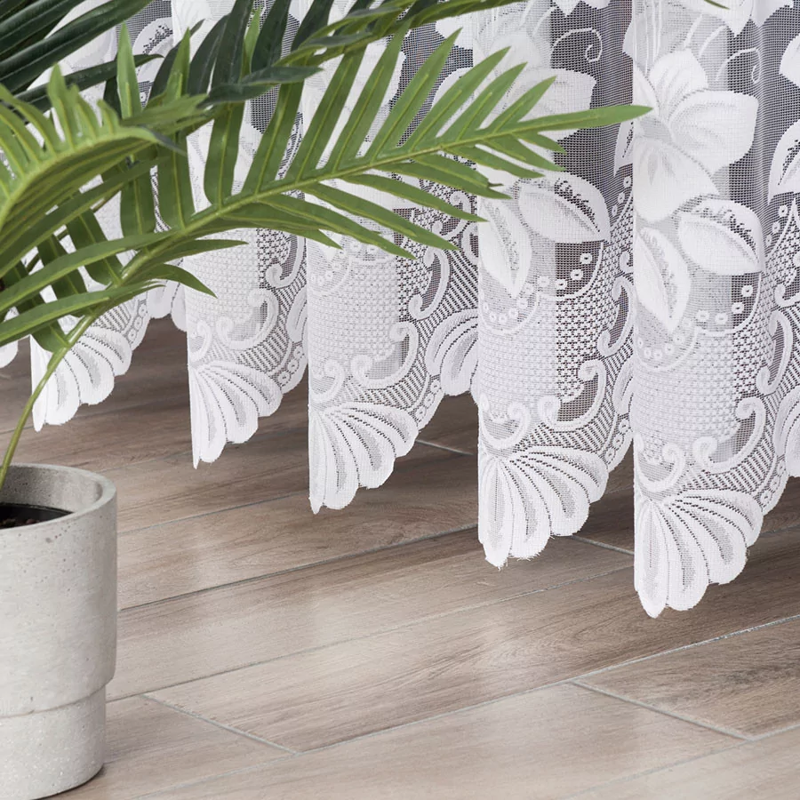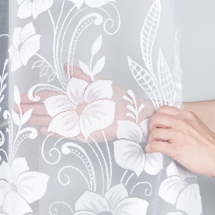 Firanka żakardowa dostępna w metrażu, w kolorze białym, z motywem kwiatowym. Wiele wysokości do wyboru a szerokość jest dowolna, dzięki czemu dopasujesz ją dokładnie do swojego okna. Firankę możesz zamówić z usługą szycia w naszej profesjonalnej szwalni - wybierz wykończenie, podaj wymiary, a otrzymasz uszytą i gotową do zawieszenia firankę. Najwyższa jakość przędzy żakardowej idealnie wkomponuje się w aranżację wnętrz nowoczesnych jak i tych urządzonych w klasycznym stylu. Firanka pięknie się układa, nie wymaga prasowania i można ją prać w pralce w niskiej temperaturze. Cechuje ją dobra przepuszczalność powietrza i promieni słonecznych.