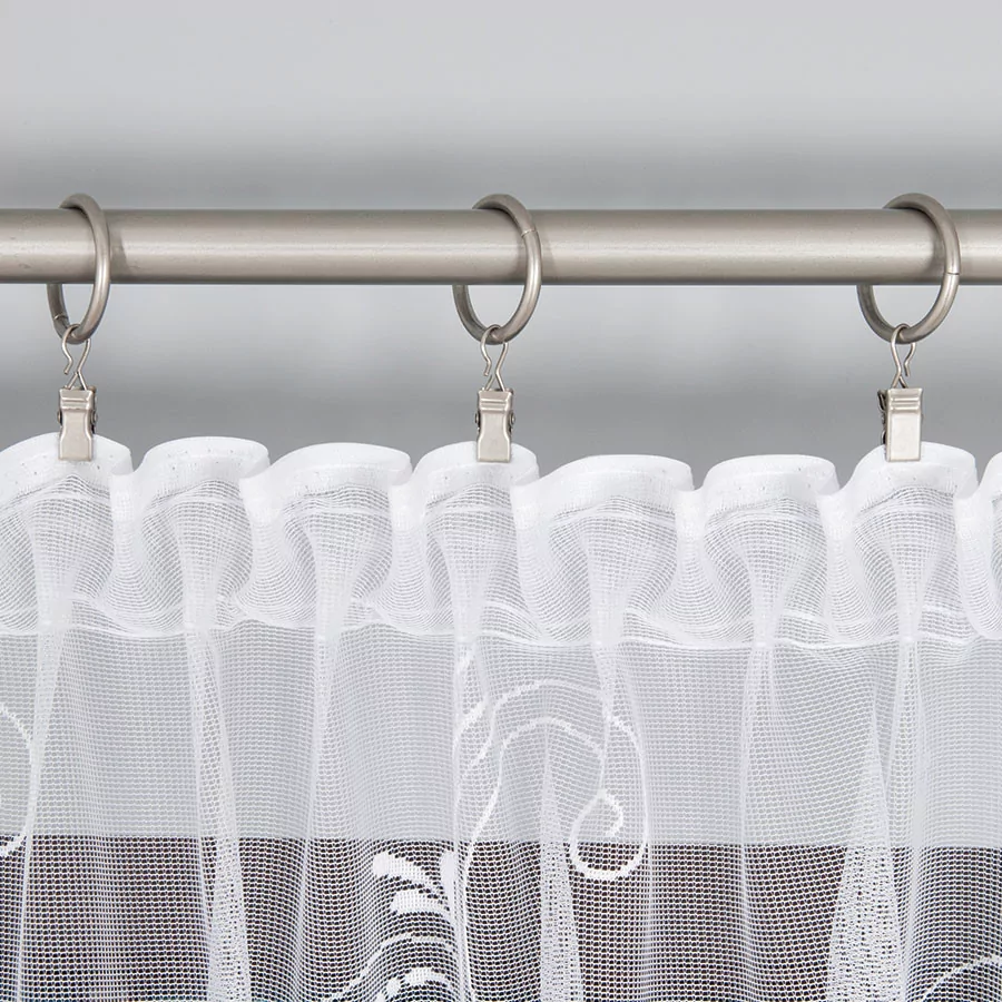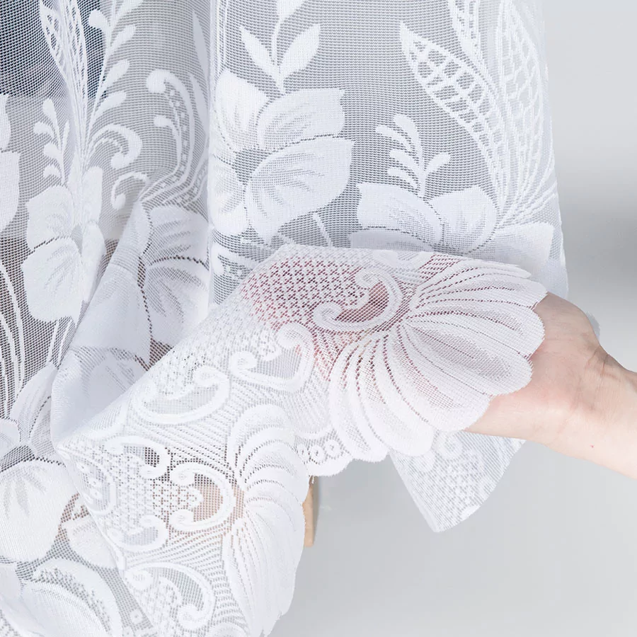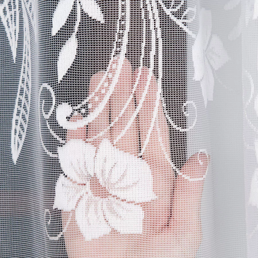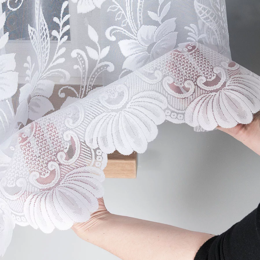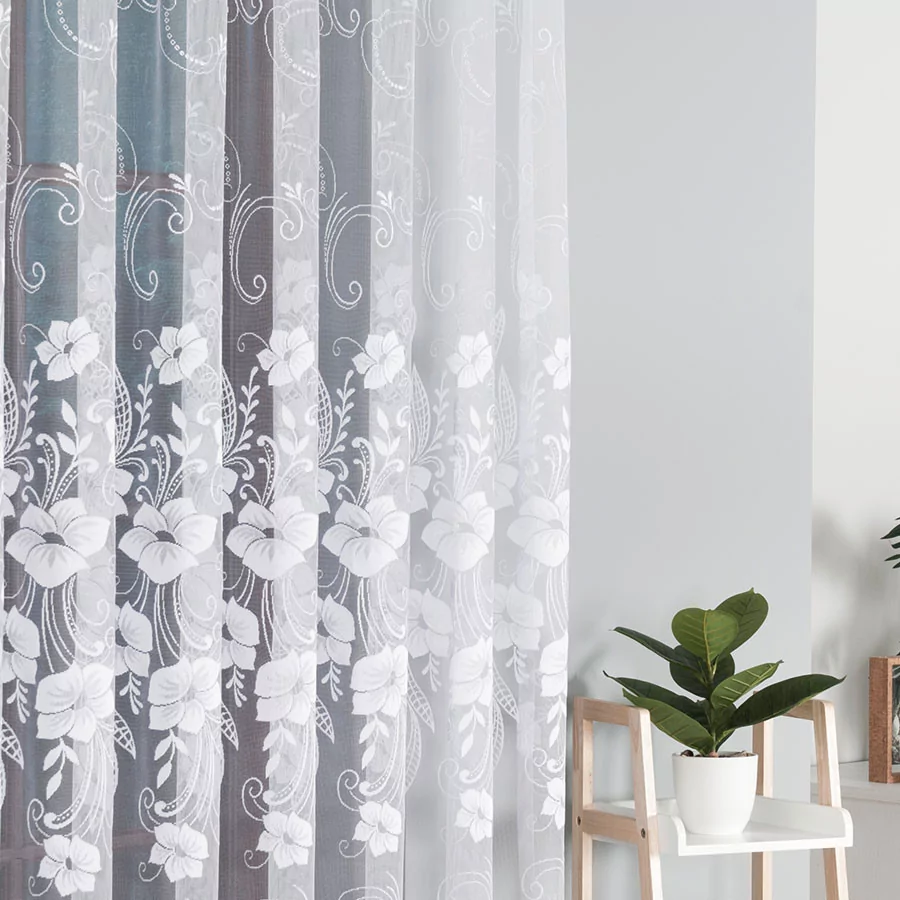 Firanka żakardowa dostępna w metrażu, w kolorze białym, z motywem kwiatowym. Wiele wysokości do wyboru a szerokość jest dowolna, dzięki czemu dopasujesz ją dokładnie do swojego okna. Firankę możesz zamówić z usługą szycia w naszej profesjonalnej szwalni - wybierz wykończenie, podaj wymiary, a otrzymasz uszytą i gotową do zawieszenia firankę. Najwyższa jakość przędzy żakardowej idealnie wkomponuje się w aranżację wnętrz nowoczesnych jak i tych urządzonych w klasycznym stylu. Firanka pięknie się układa, nie wymaga prasowania i można ją prać w pralce w niskiej temperaturze. Cechuje ją dobra przepuszczalność powietrza i promieni słonecznych.