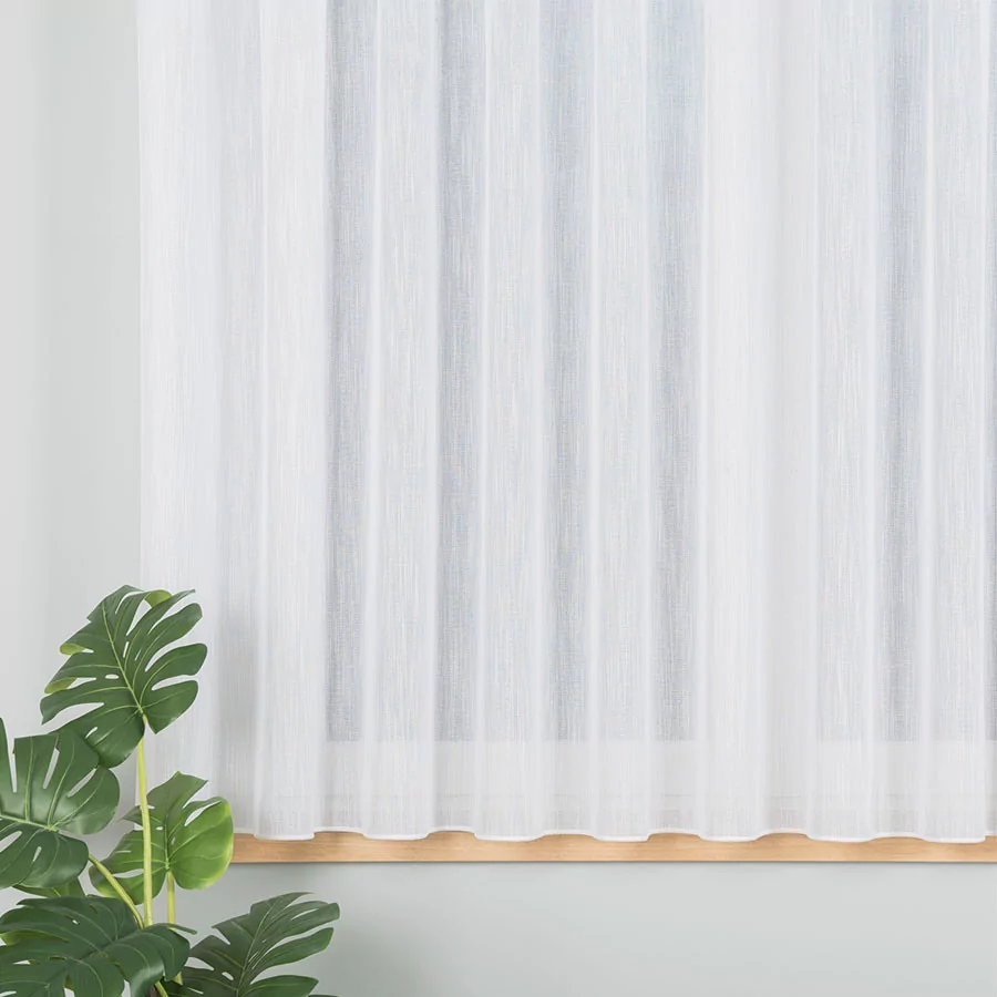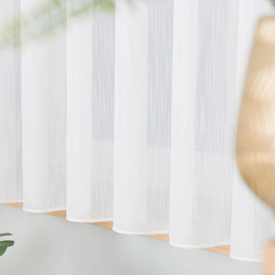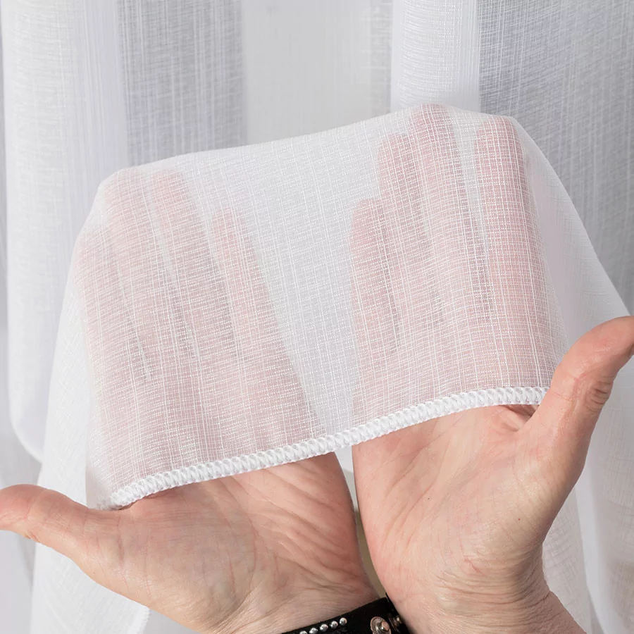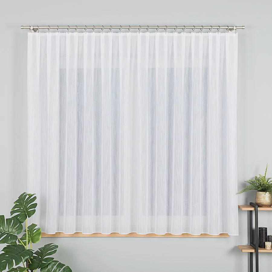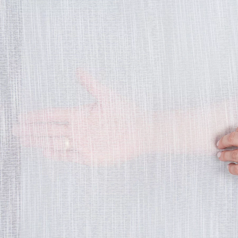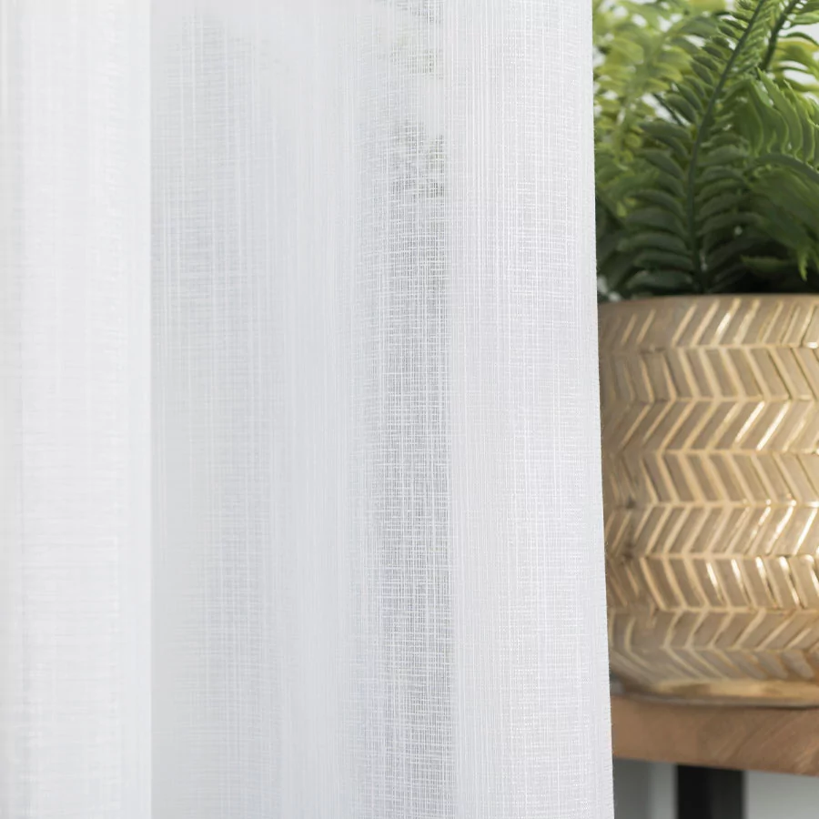 Zagęszczony splot firanki ozdobiony jest delikatnie błyszczącym efektem "deszczyku". Tak prosty i minimalistyczny wzór doda subtelności i przytulności wnętrzom.