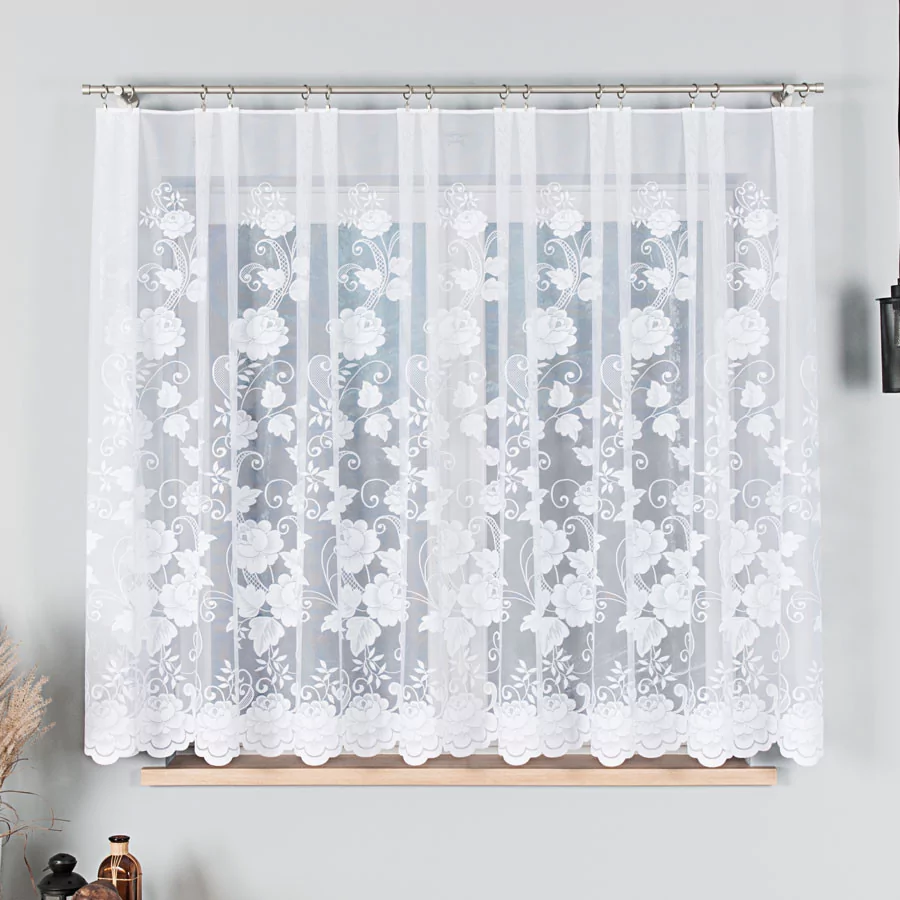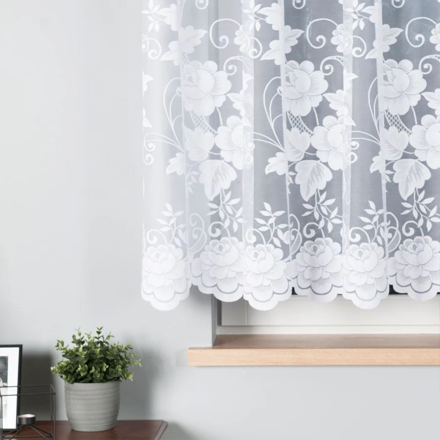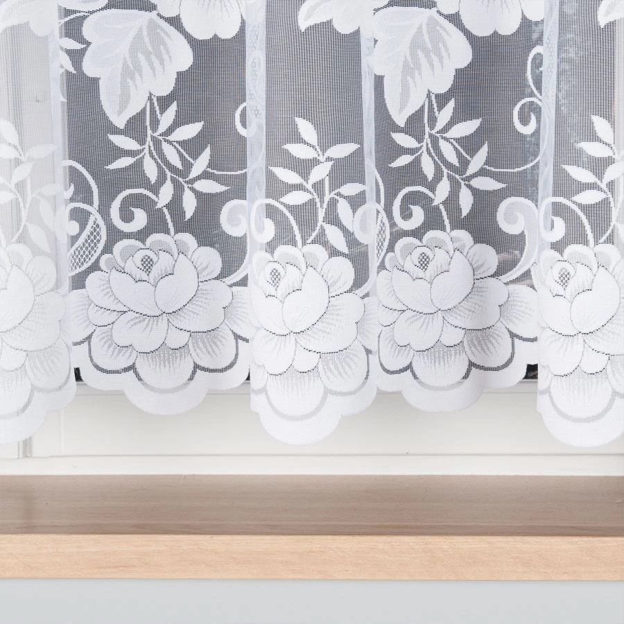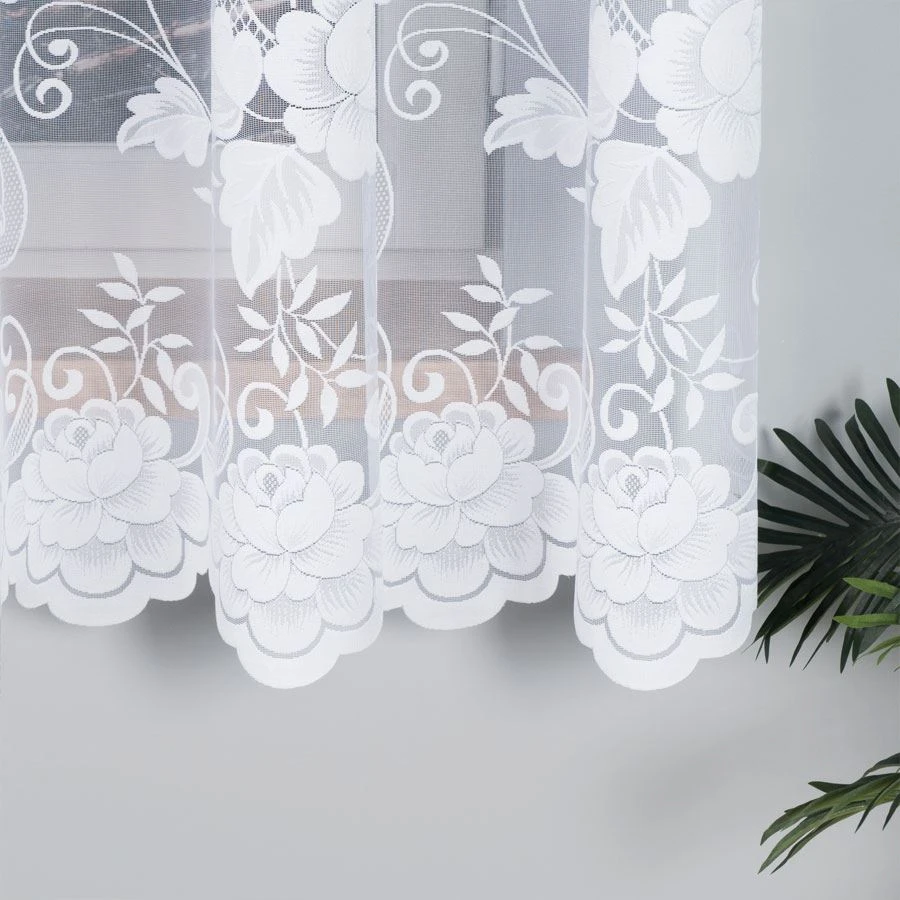 Firanka żakardowa dostępna w metrażu, w kolorze białym, z motywem kwiatowym. Wiele wysokości do wyboru a szerokość jest dowolna, dzięki czemu dopasujesz ją dokładnie do swojego okna. Firankę możesz zamówić z usługą szycia w naszej profesjonalnej szwalni - wybierz wykończenie, podaj wymiary, a otrzymasz uszytą i gotową do zawieszenia firankę.