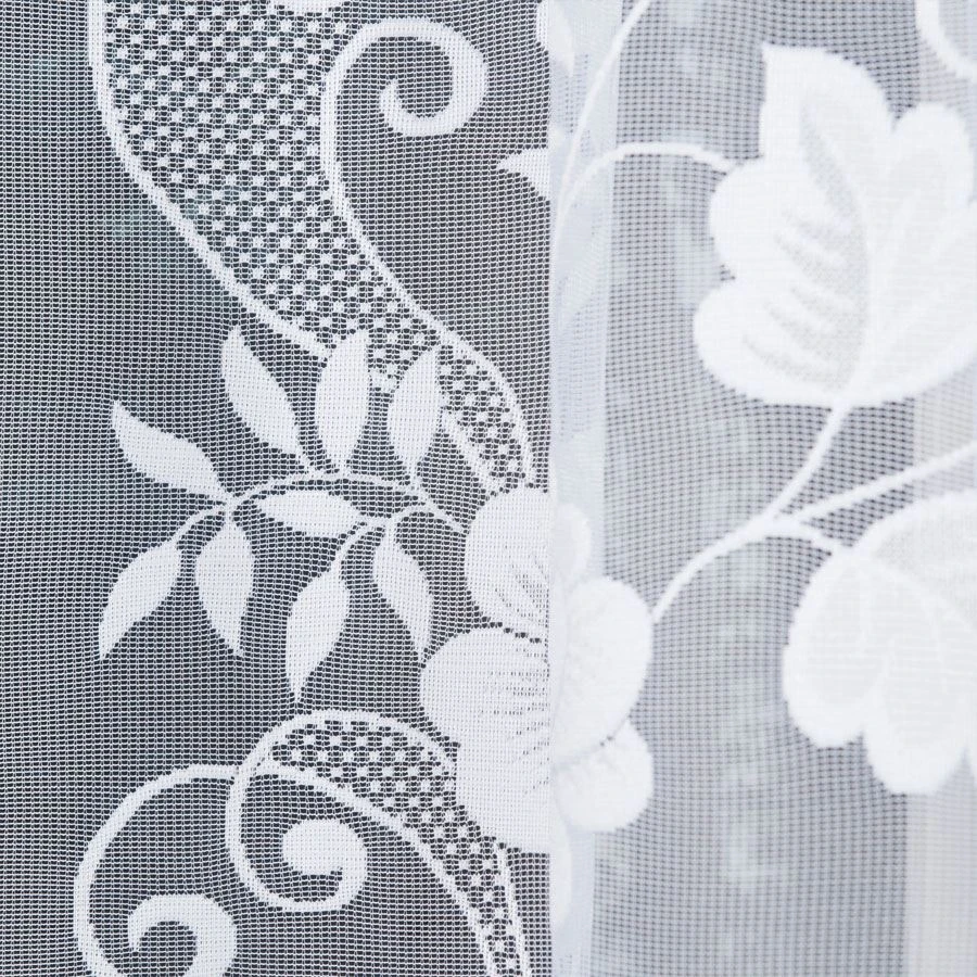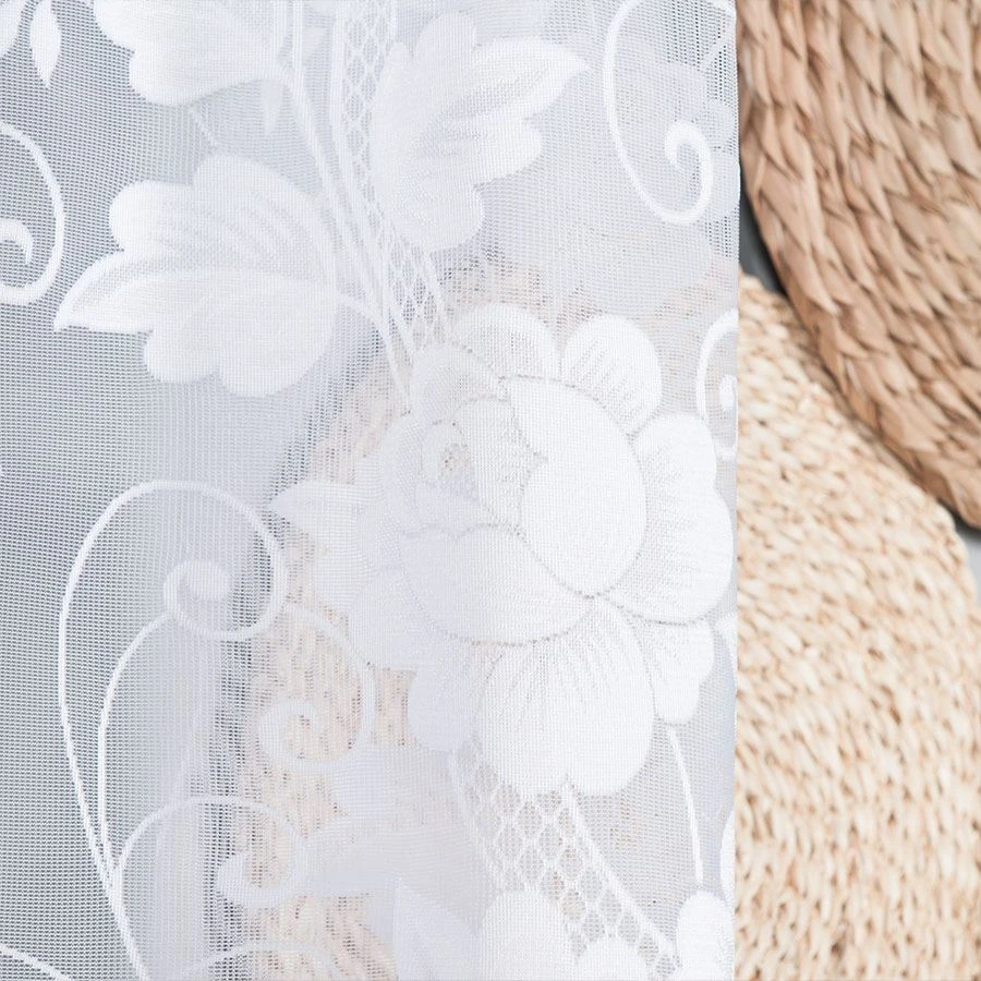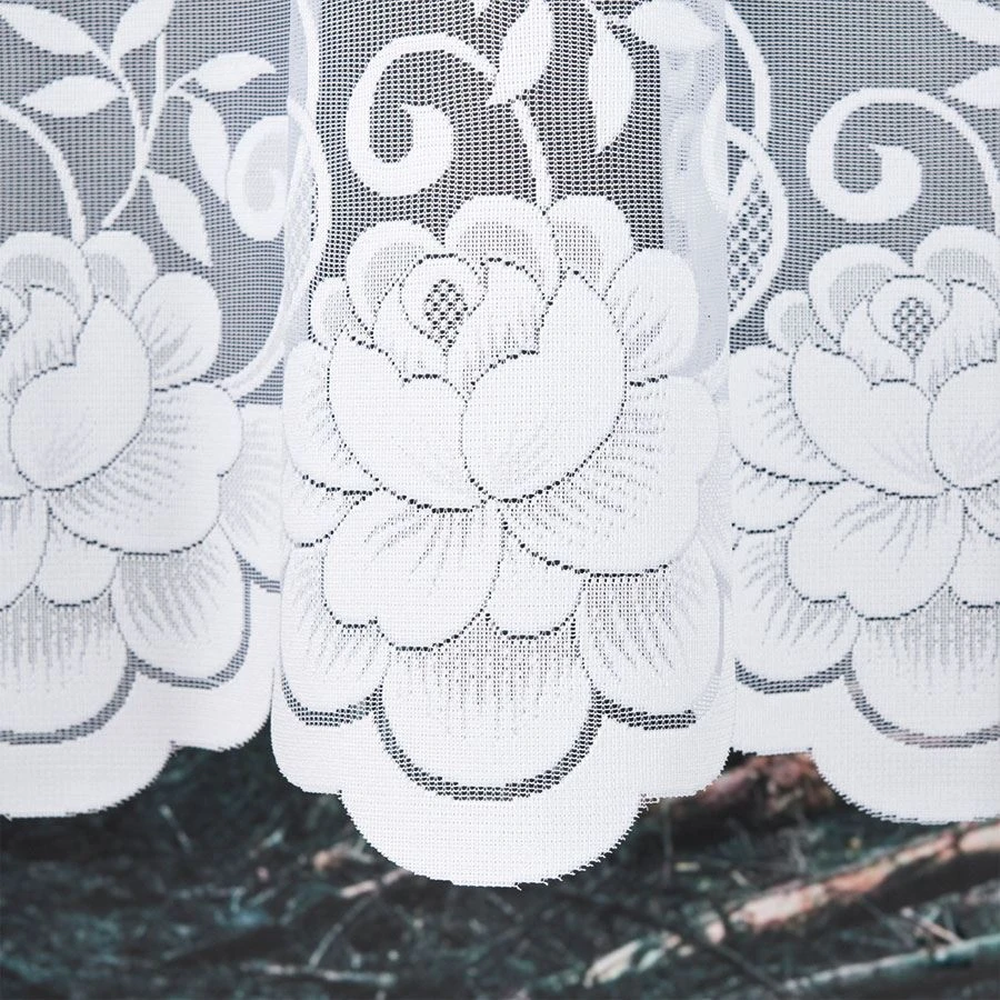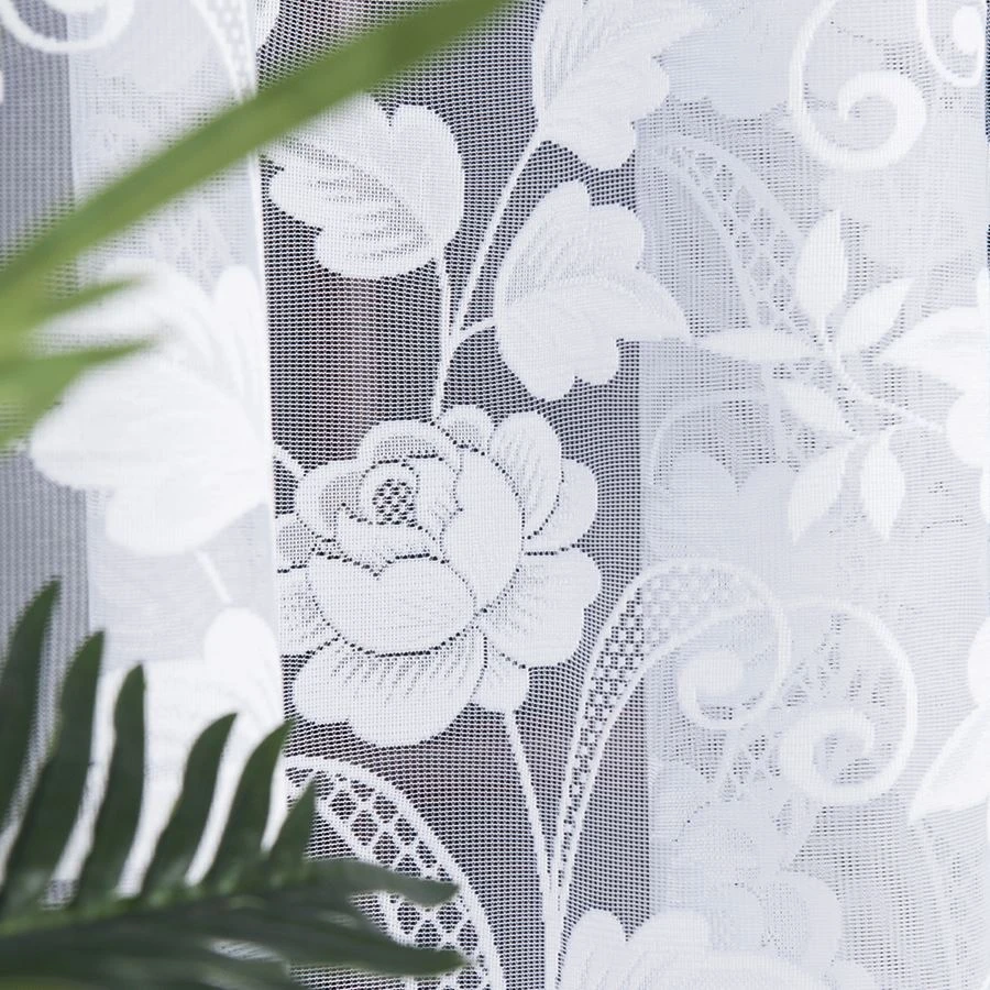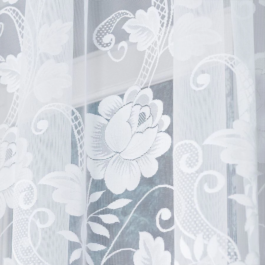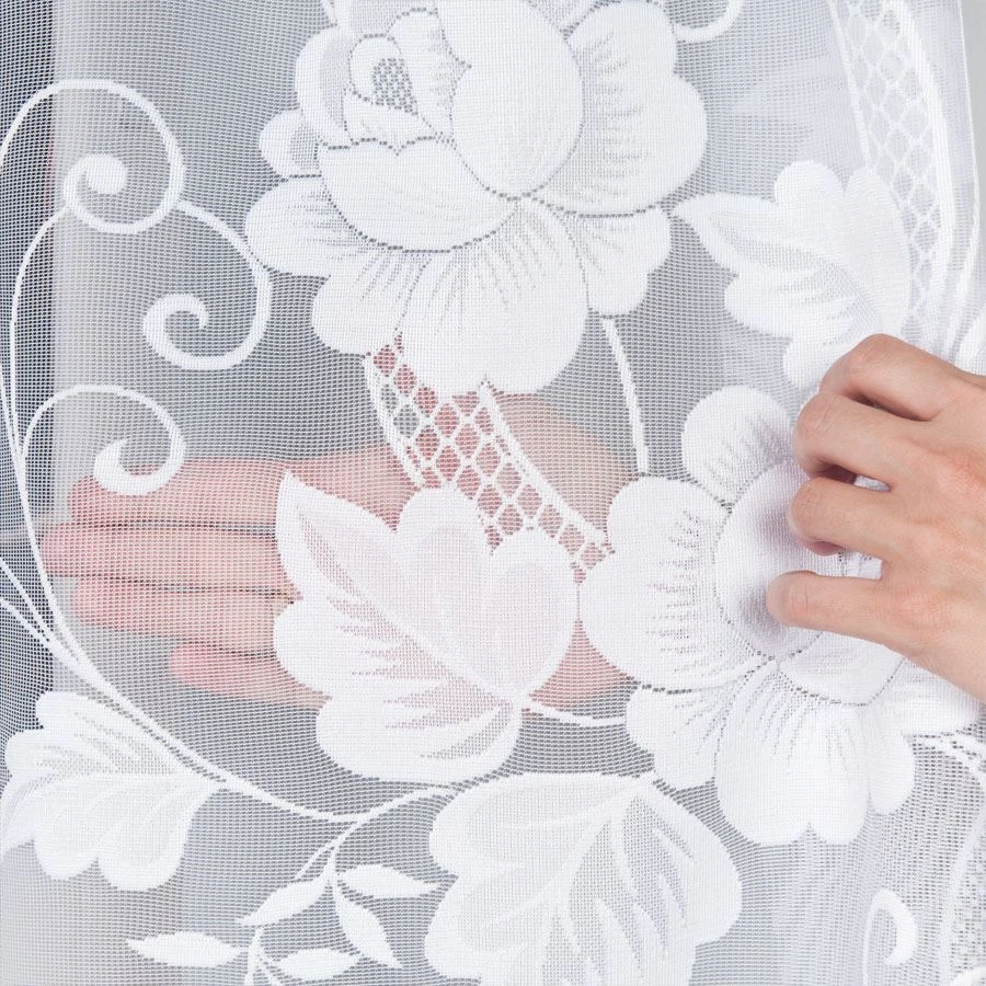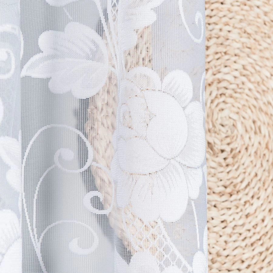 Firanka żakardowa dostępna w metrażu, w kolorze białym, z motywem kwiatowym. Wiele wysokości do wyboru a szerokość jest dowolna, dzięki czemu dopasujesz ją dokładnie do swojego okna. Firankę możesz zamówić z usługą szycia w naszej profesjonalnej szwalni - wybierz wykończenie, podaj wymiary, a otrzymasz uszytą i gotową do zawieszenia firankę. Najwyższa jakość przędzy żakardowej idealnie wkomponuje się w aranżację wnętrz nowoczesnych jak i tych urządzonych w klasycznym stylu. Firanka pięknie się układa, nie wymaga prasowania i można ją prać w pralce w niskiej temperaturze. Cechuje ją dobra przepuszczalność powietrza i promieni słonecznych.