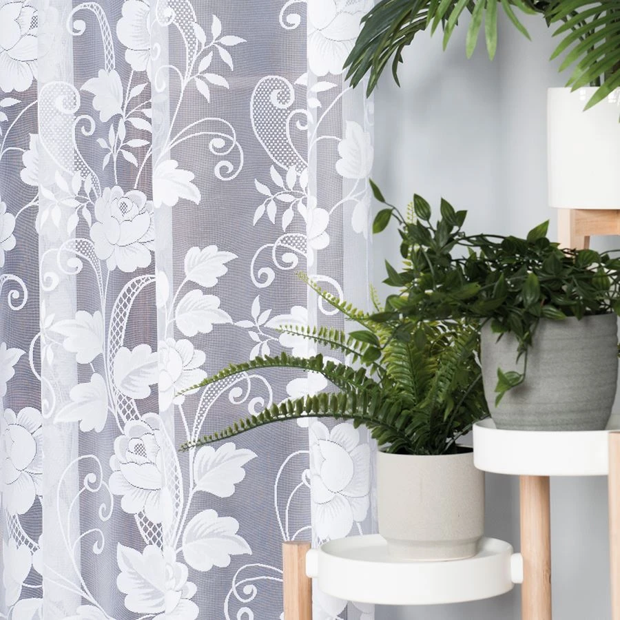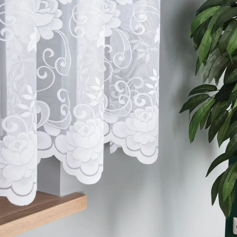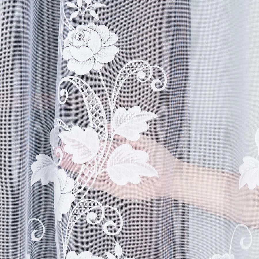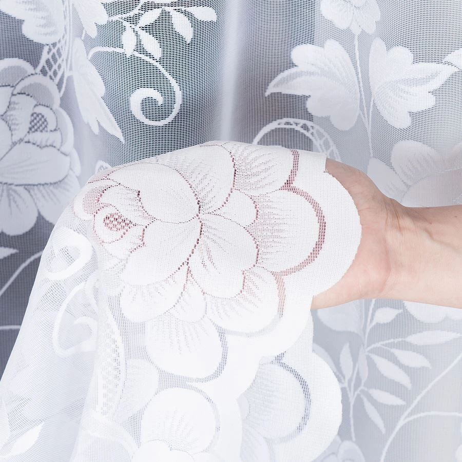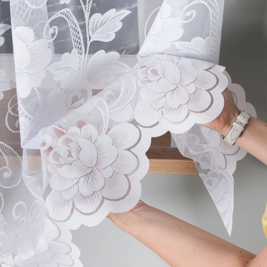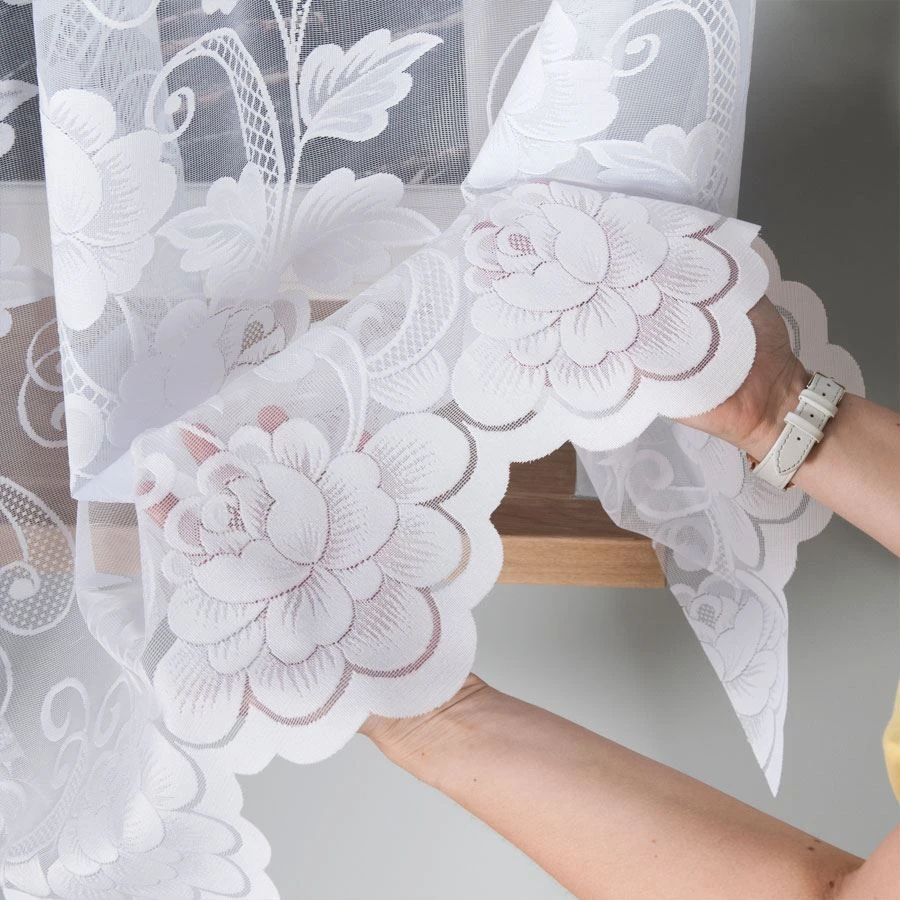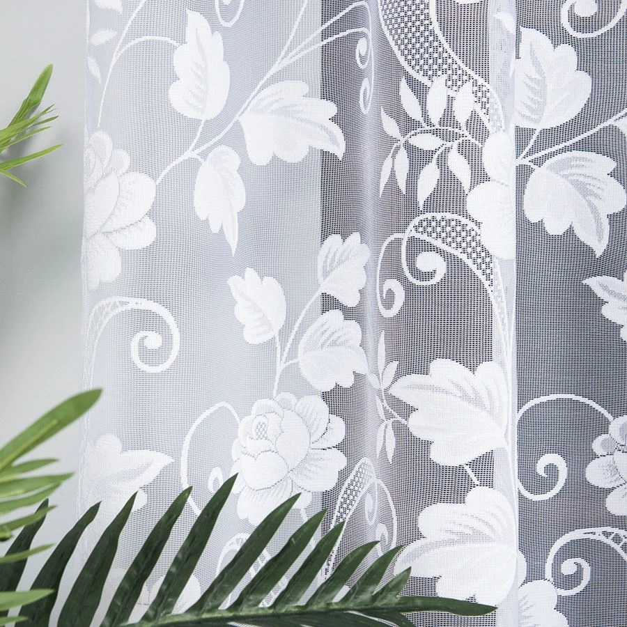 Firanka żakardowa dostępna w metrażu, w kolorze białym, z motywem kwiatowym. Wiele wysokości do wyboru a szerokość jest dowolna, dzięki czemu dopasujesz ją dokładnie do swojego okna. Firankę możesz zamówić z usługą szycia w naszej profesjonalnej szwalni - wybierz wykończenie, podaj wymiary, a otrzymasz uszytą i gotową do zawieszenia firankę. Najwyższa jakość przędzy żakardowej idealnie wkomponuje się w aranżację wnętrz nowoczesnych jak i tych urządzonych w klasycznym stylu. Firanka pięknie się układa, nie wymaga prasowania i można ją prać w pralce w niskiej temperaturze. Cechuje ją dobra przepuszczalność powietrza i promieni słonecznych.