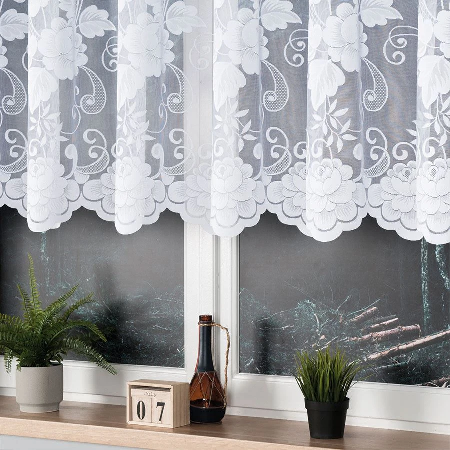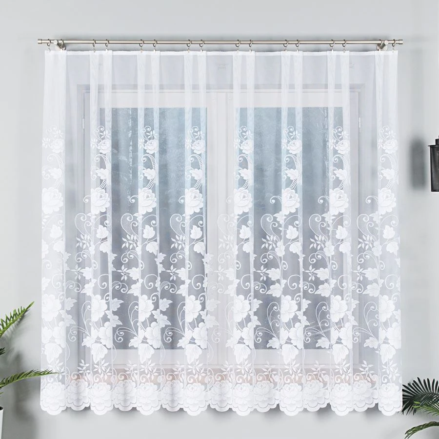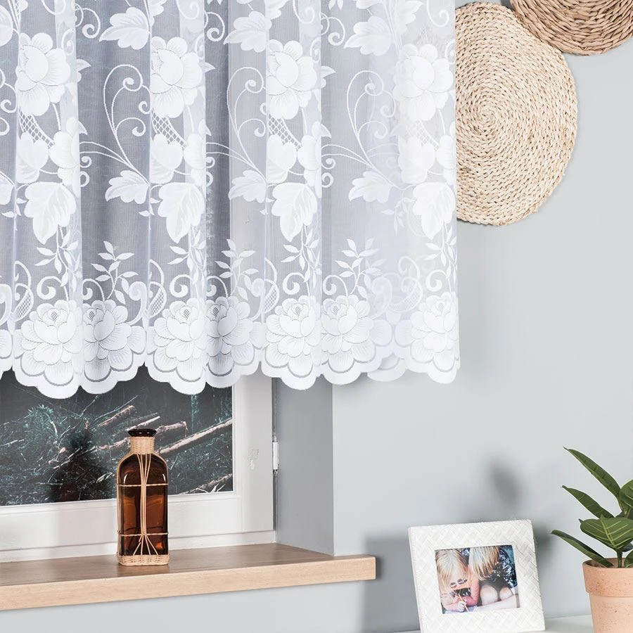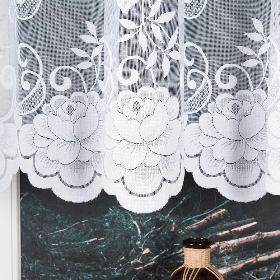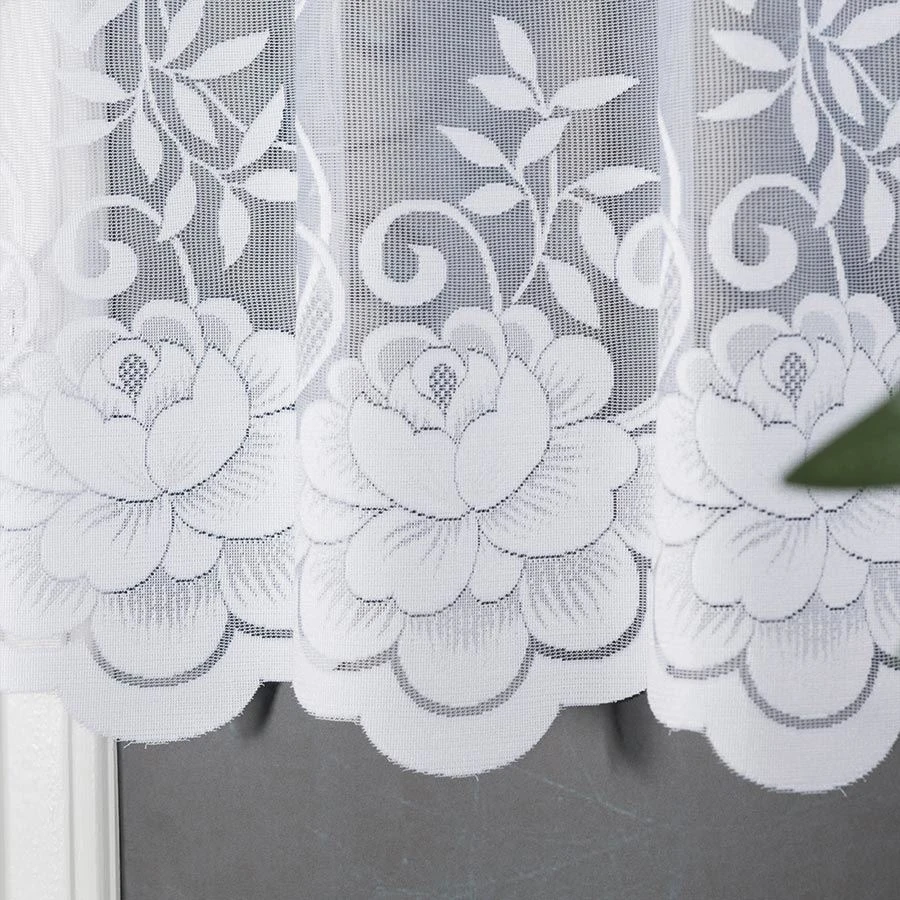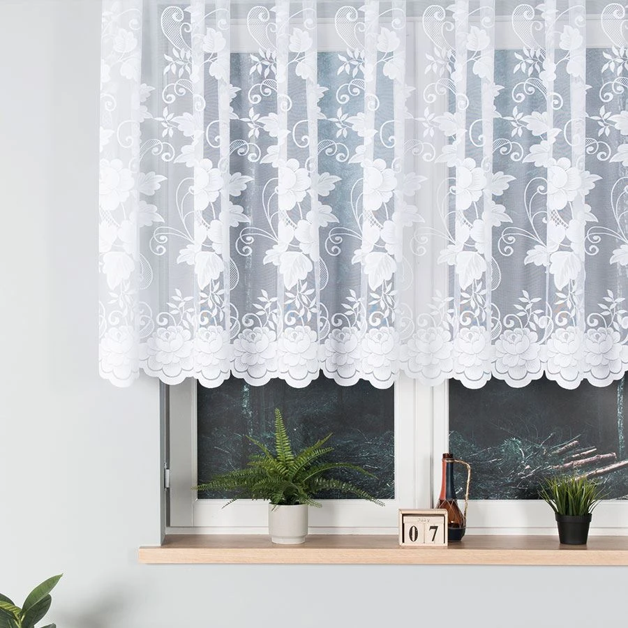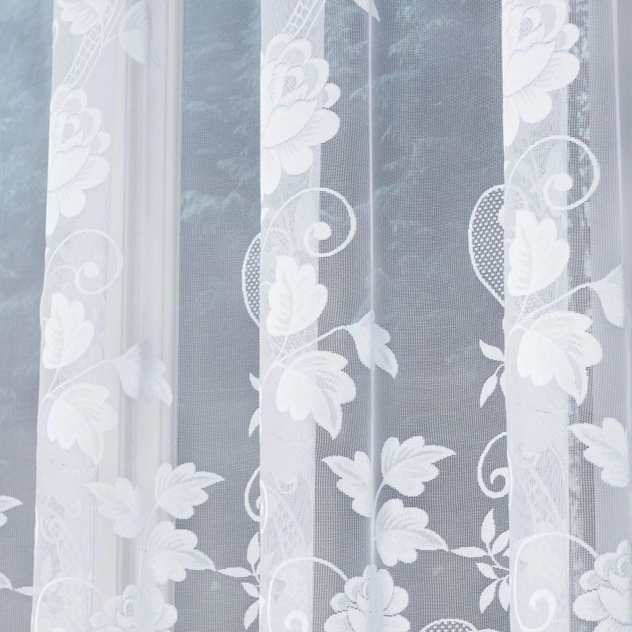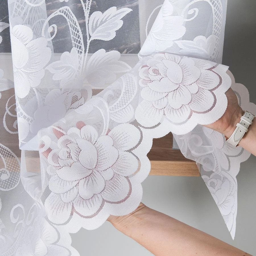 Firanka żakardowa dostępna w metrażu, w kolorze białym, z motywem kwiatowym. Wiele wysokości do wyboru a szerokość jest dowolna, dzięki czemu dopasujesz ją dokładnie do swojego okna. Firankę możesz zamówić z usługą szycia w naszej profesjonalnej szwalni - wybierz wykończenie, podaj wymiary, a otrzymasz uszytą i gotową do zawieszenia firankę. Najwyższa jakość przędzy żakardowej idealnie wkomponuje się w aranżację wnętrz nowoczesnych jak i tych urządzonych w klasycznym stylu. Firanka pięknie się układa, nie wymaga prasowania i można ją prać w pralce w niskiej temperaturze. Cechuje ją dobra przepuszczalność powietrza i promieni słonecznych.