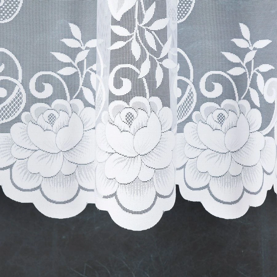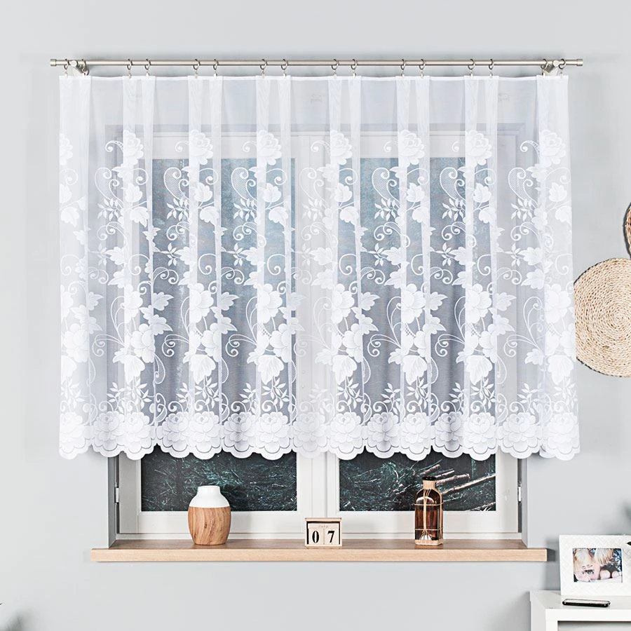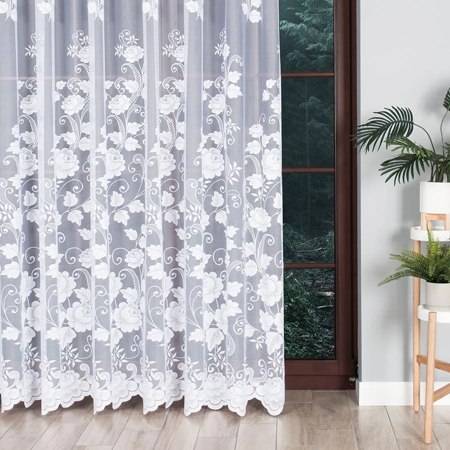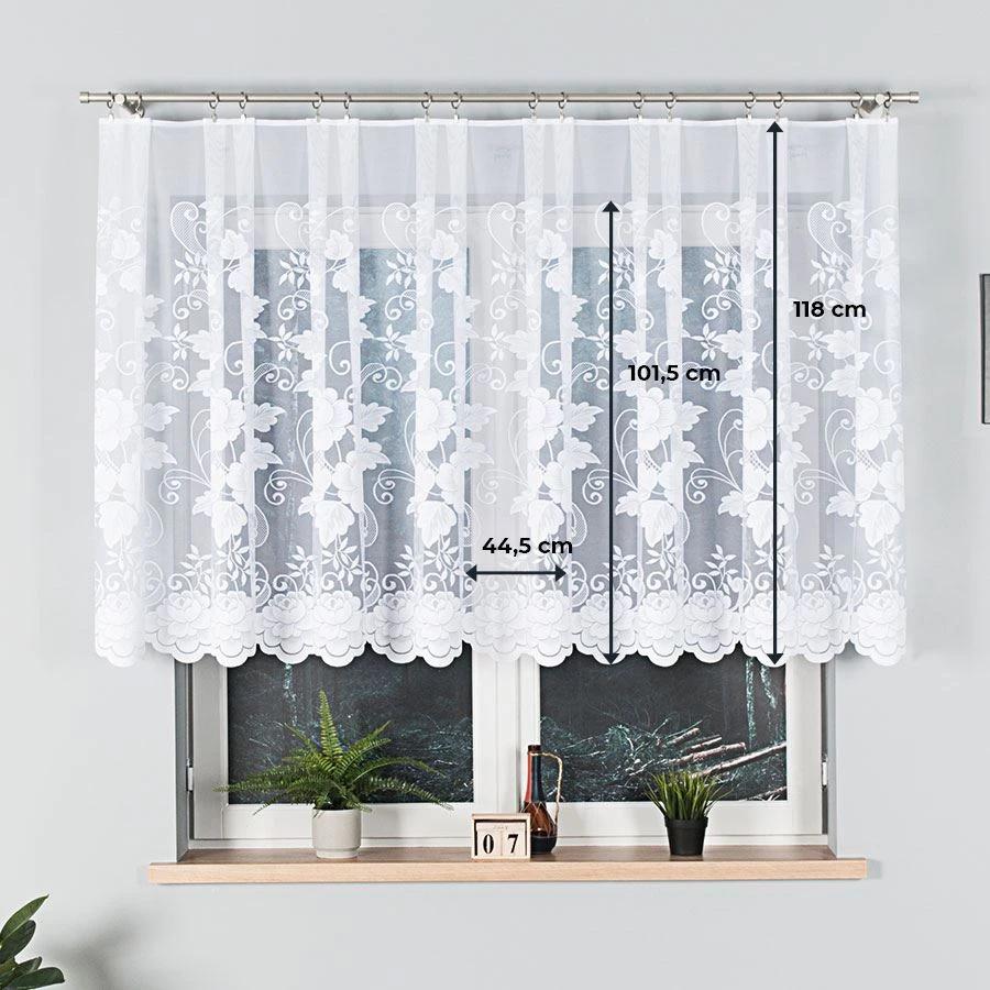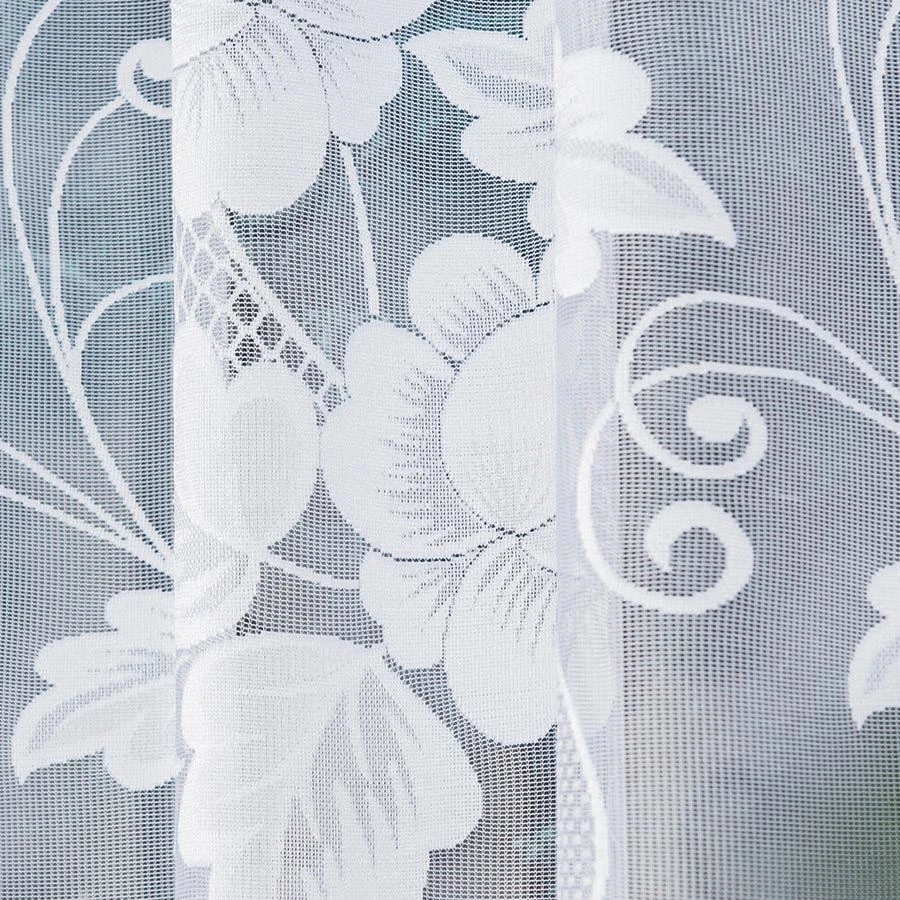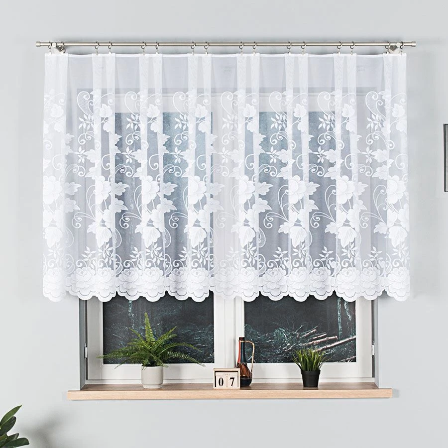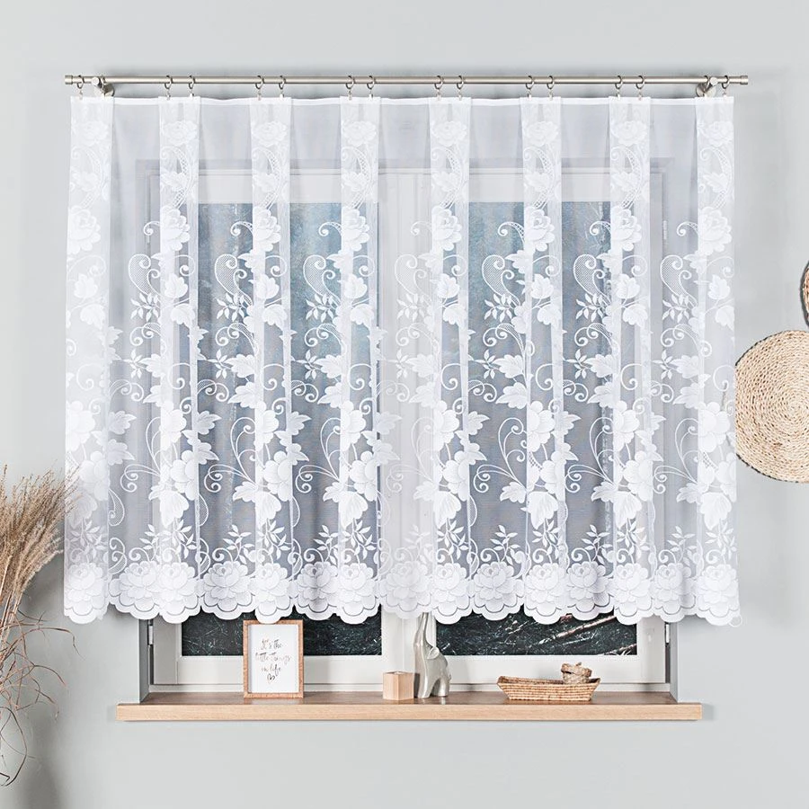 Firanka żakardowa dostępna w metrażu, w kolorze białym, z motywem kwiatowym. Wiele wysokości do wyboru a szerokość jest dowolna, dzięki czemu dopasujesz ją dokładnie do swojego okna. Firankę możesz zamówić z usługą szycia w naszej profesjonalnej szwalni - wybierz wykończenie, podaj wymiary, a otrzymasz uszytą i gotową do zawieszenia firankę. Najwyższa jakość przędzy żakardowej idealnie wkomponuje się w aranżację wnętrz nowoczesnych jak i tych urządzonych w klasycznym stylu. Firanka pięknie się układa, nie wymaga prasowania i można ją prać w pralce w niskiej temperaturze. Cechuje ją dobra przepuszczalność powietrza i promieni słonecznych.