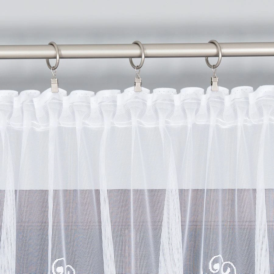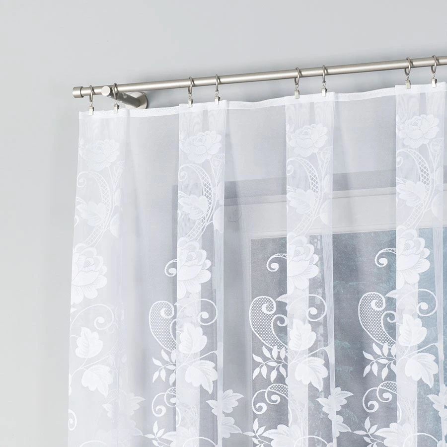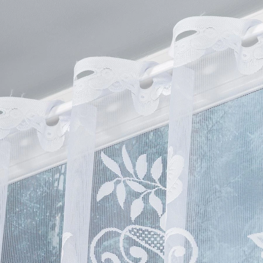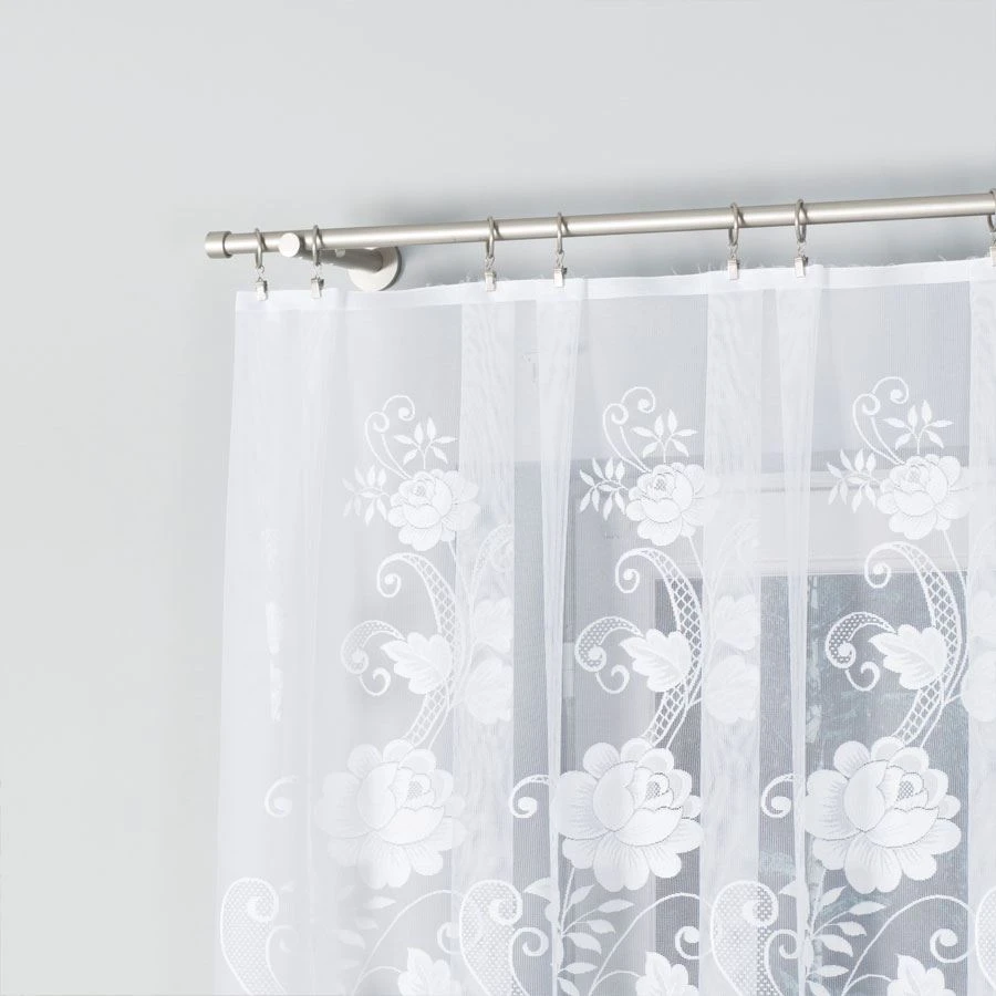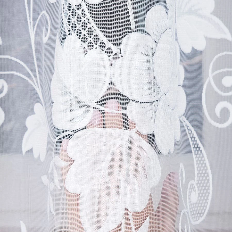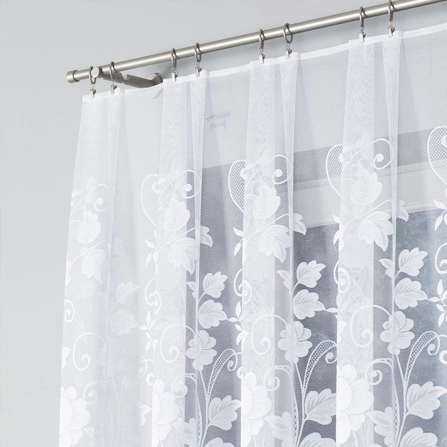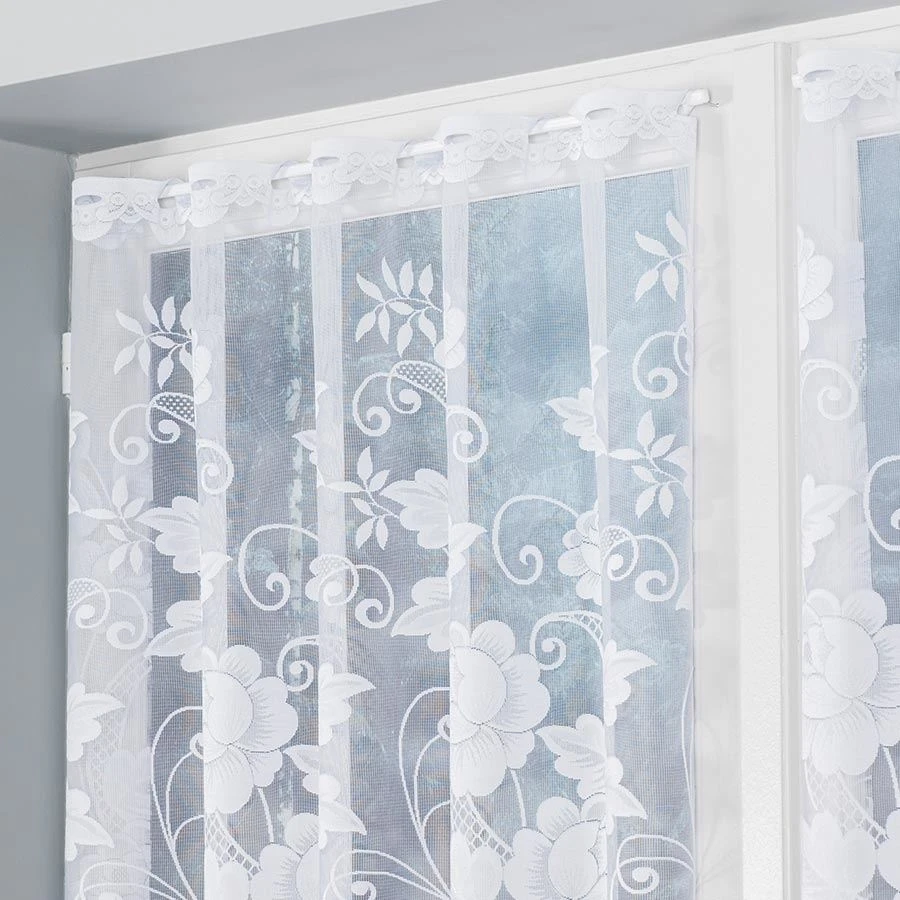 Firanka żakardowa dostępna w metrażu, w kolorze białym, z motywem kwiatowym. Wiele wysokości do wyboru a szerokość jest dowolna, dzięki czemu dopasujesz ją dokładnie do swojego okna. Firankę możesz zamówić z usługą szycia w naszej profesjonalnej szwalni - wybierz wykończenie, podaj wymiary, a otrzymasz uszytą i gotową do zawieszenia firankę. Najwyższa jakość przędzy żakardowej idealnie wkomponuje się w aranżację wnętrz nowoczesnych jak i tych urządzonych w klasycznym stylu. Firanka pięknie się układa, nie wymaga prasowania i można ją prać w pralce w niskiej temperaturze. Cechuje ją dobra przepuszczalność powietrza i promieni słonecznych.