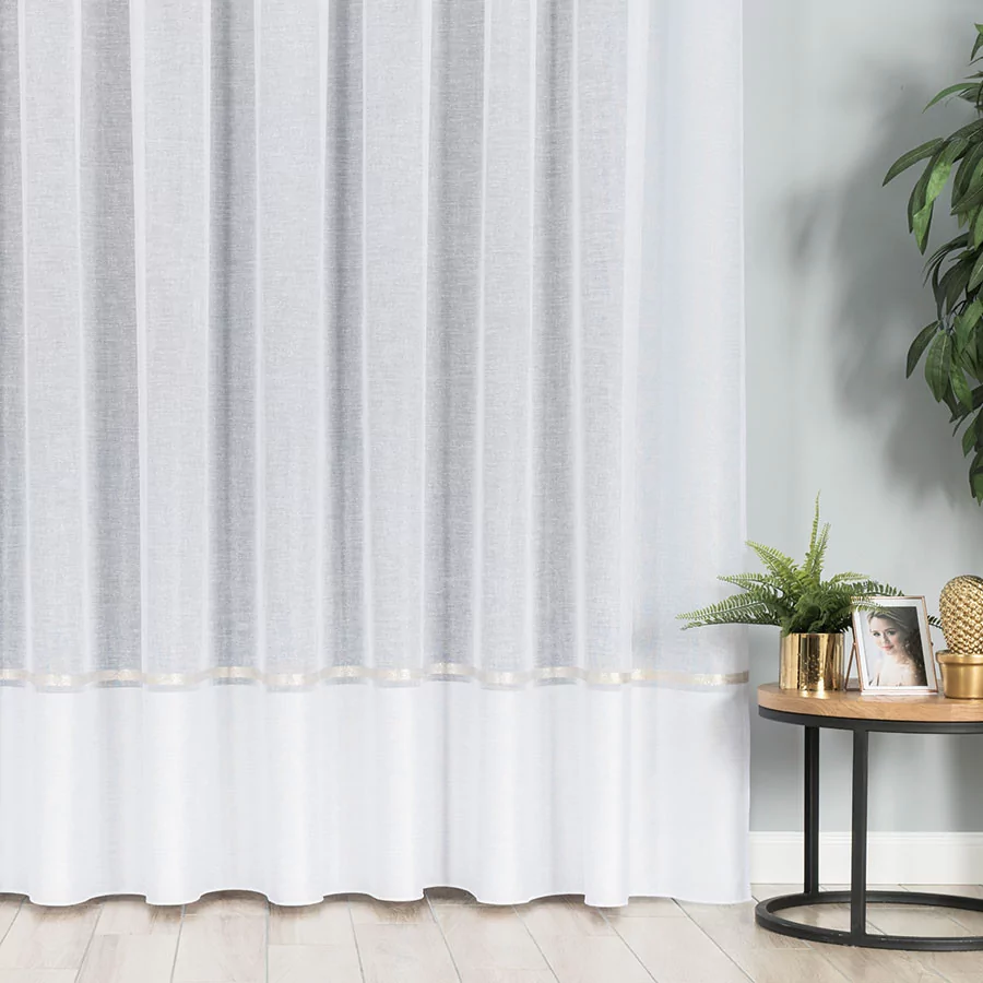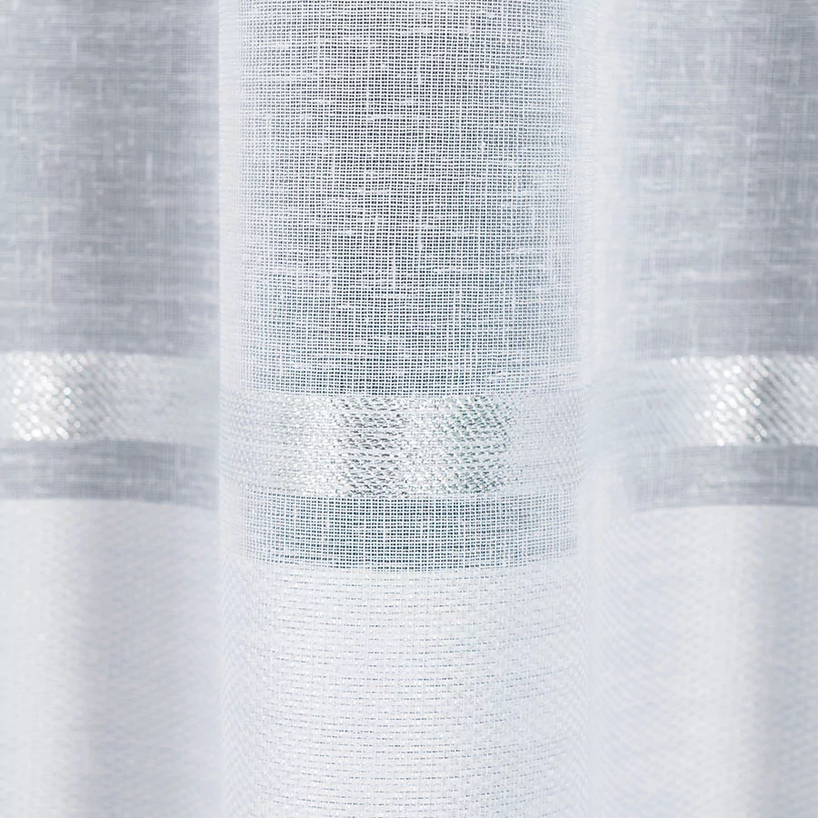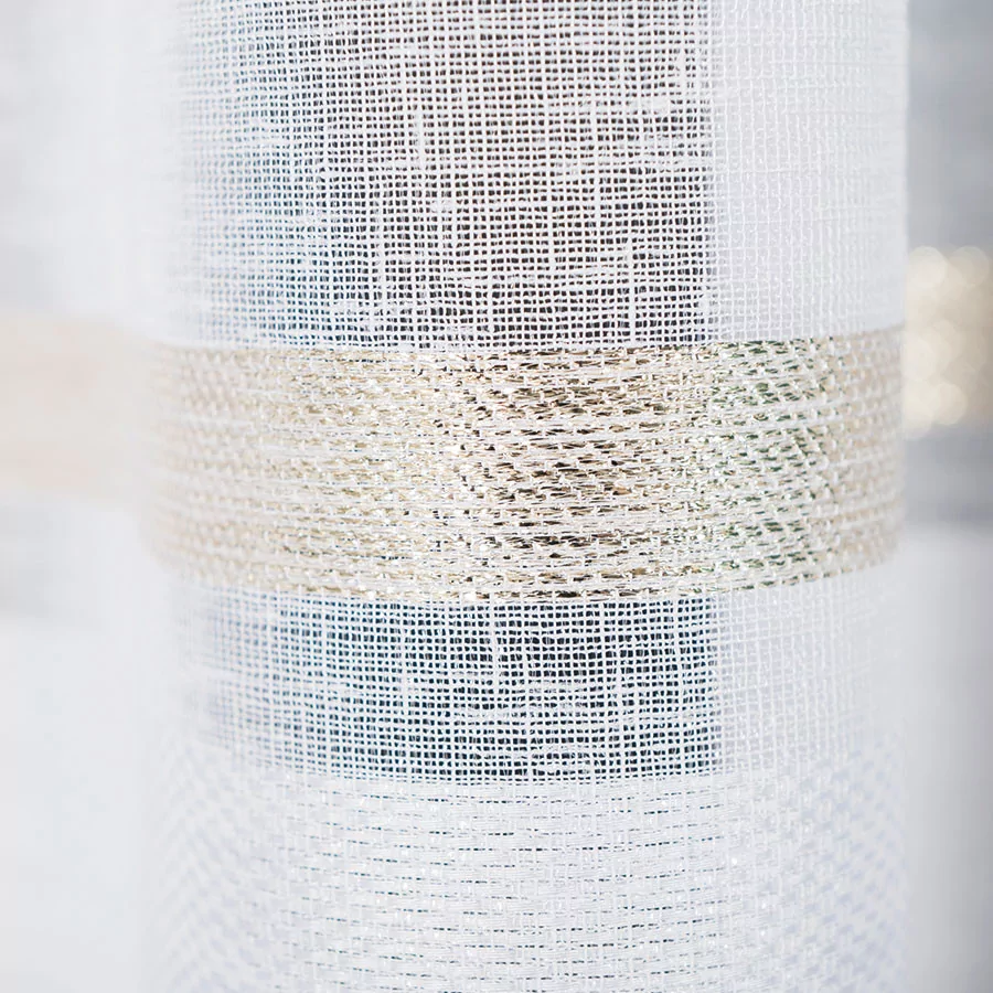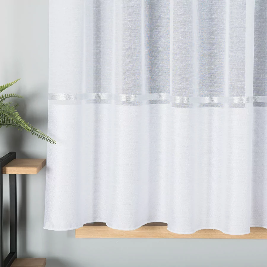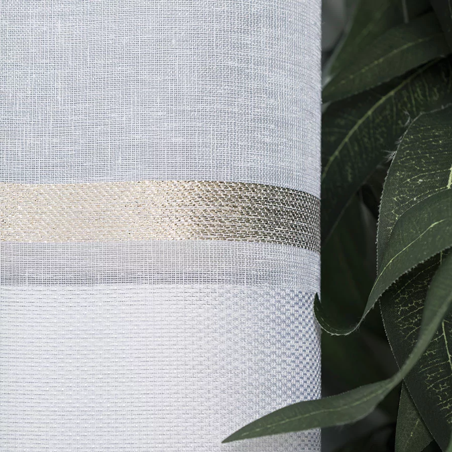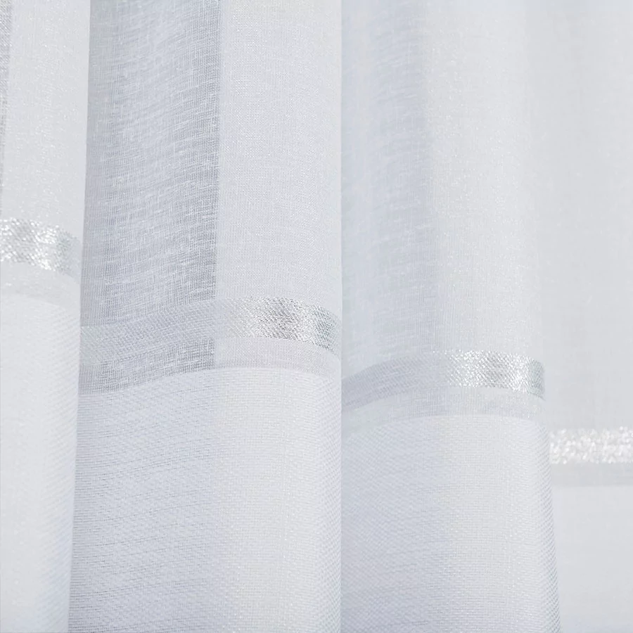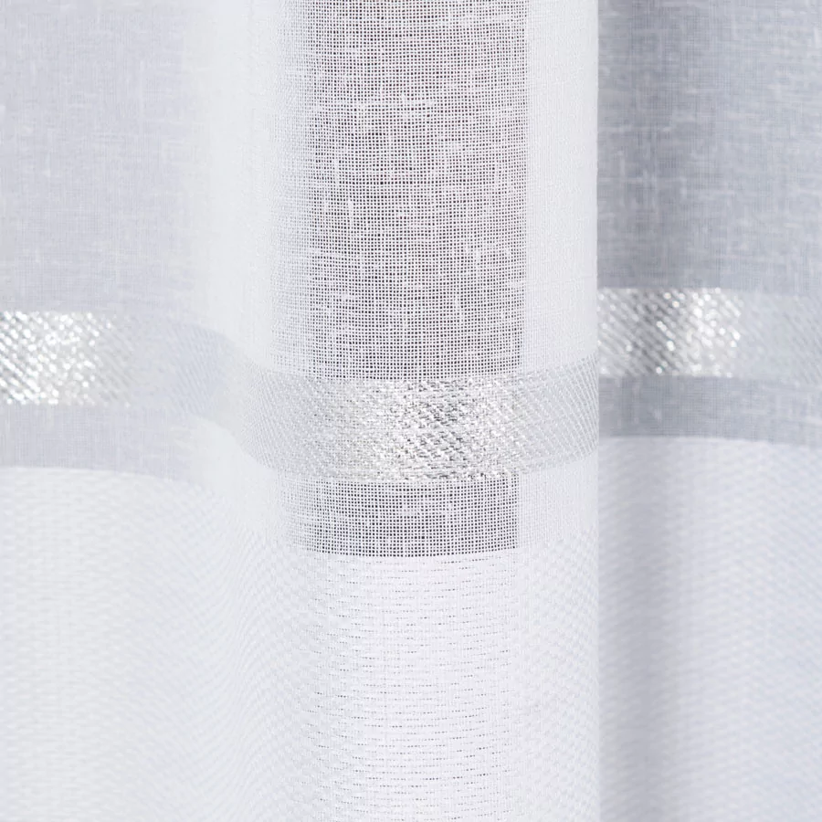 Przedstawiamy wykonaną na delikatnym, białym podkładzie batystowym firankę metrażową. Lekki i pięknie układający się materiał, zdobiony srebrnymi lub złotymi pasami idealnie wpasuje się zarówno w nowoczesne, jak i klasyczne wnętrze. Materiał ten jest łatwy w użytkowaniu a jego zagęszczony splot świetnie uchroni przed słońcem i wiatrem jednocześnie nie tracąc na swej niezwykłej lekkości i zwiewności. Tak prosty i minimalistyczny wzór doda subtelności i przytulności wnętrzom.