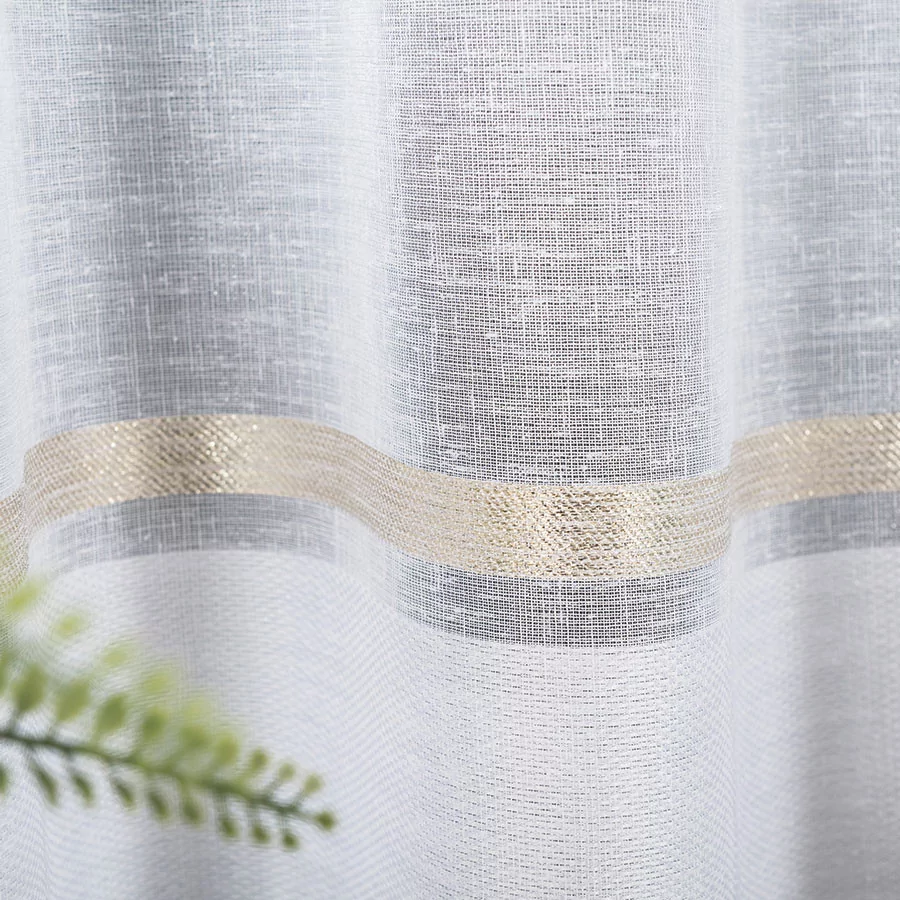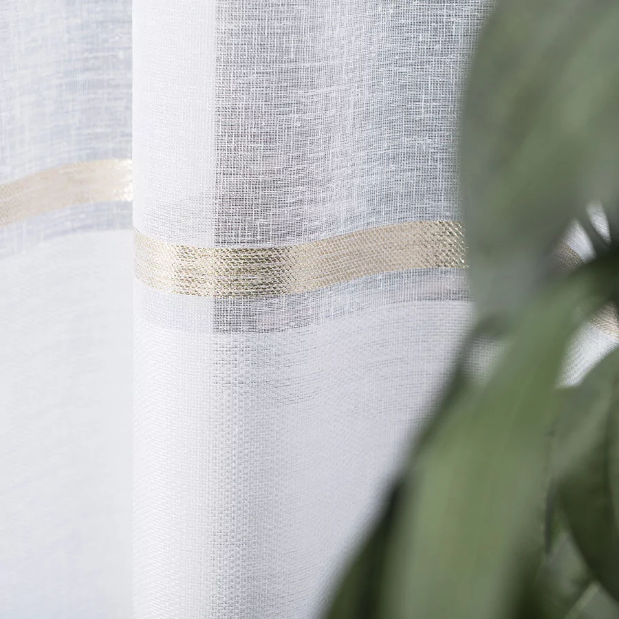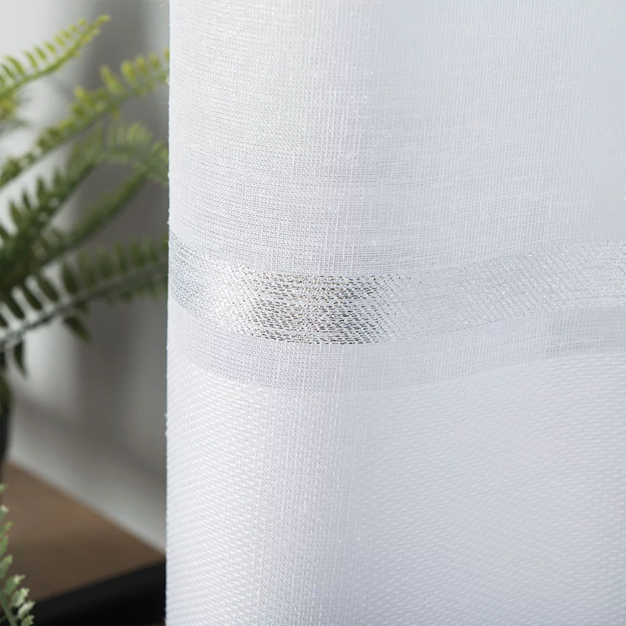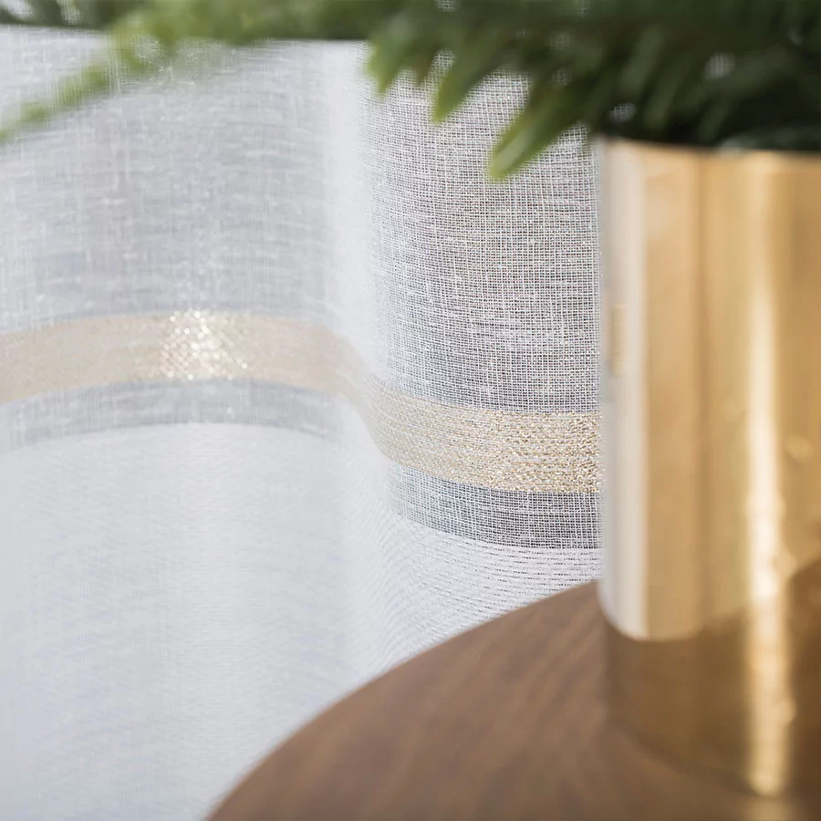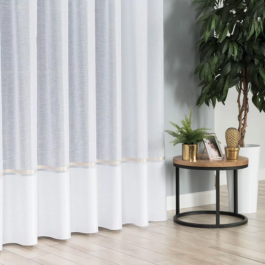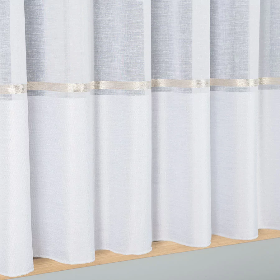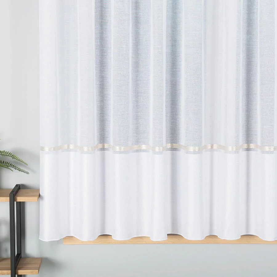 Przedstawiamy wykonaną na delikatnym, białym podkładzie batystowym firankę metrażową. Lekki i pięknie układający się materiał, zdobiony srebrnymi lub złotymi pasami idealnie wpasuje się zarówno w nowoczesne, jak i klasyczne wnętrze. Materiał ten jest łatwy w użytkowaniu a jego zagęszczony splot świetnie uchroni przed słońcem i wiatrem jednocześnie nie tracąc na swej niezwykłej lekkości i zwiewności. Tak prosty i minimalistyczny wzór doda subtelności i przytulności wnętrzom.