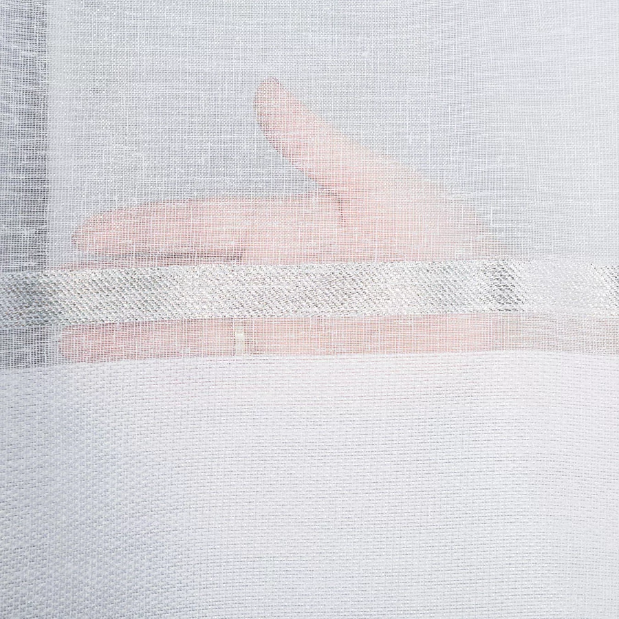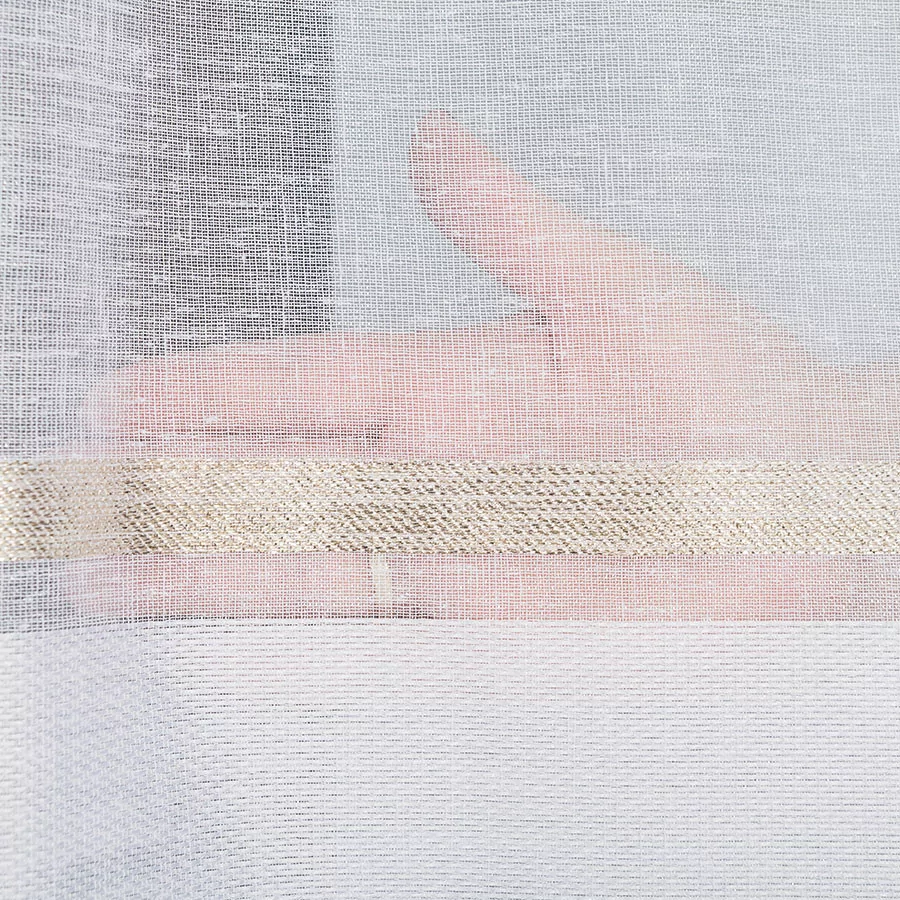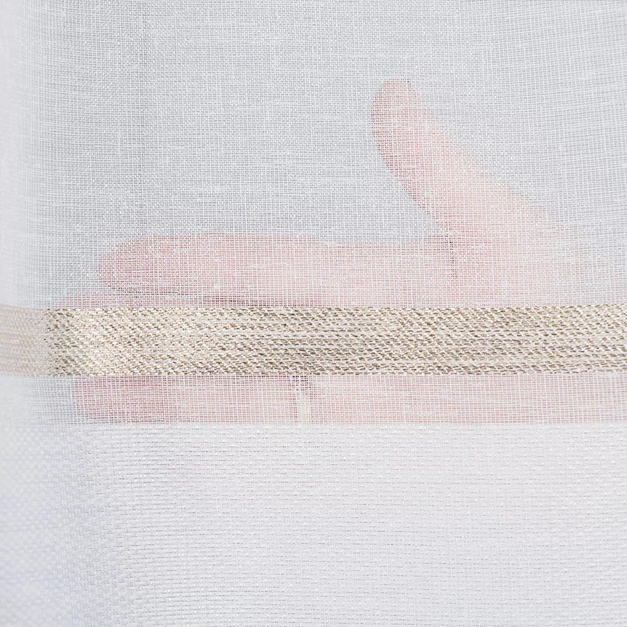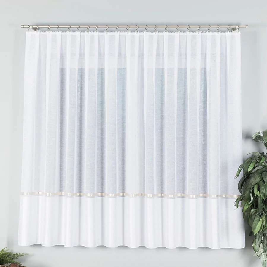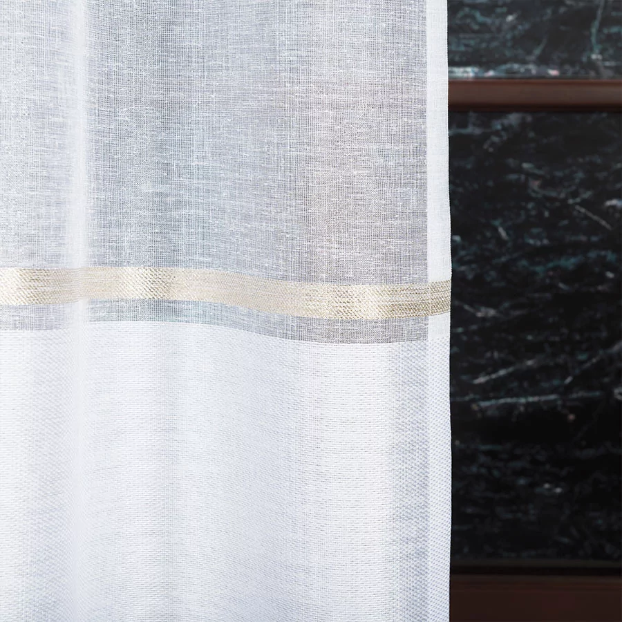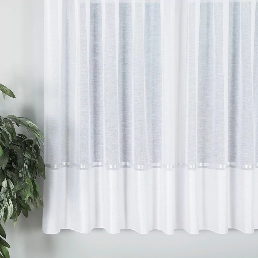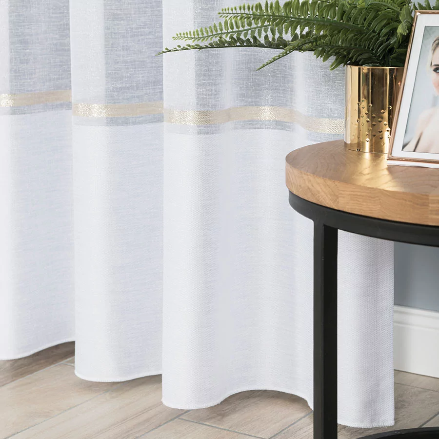 Przedstawiamy wykonaną na delikatnym, białym podkładzie batystowym firankę metrażową. Lekki i pięknie układający się materiał, zdobiony srebrnymi lub złotymi pasami idealnie wpasuje się zarówno w nowoczesne, jak i klasyczne wnętrze. Materiał ten jest łatwy w użytkowaniu a jego zagęszczony splot świetnie uchroni przed słońcem i wiatrem jednocześnie nie tracąc na swej niezwykłej lekkości i zwiewności. Tak prosty i minimalistyczny wzór doda subtelności i przytulności wnętrzom.