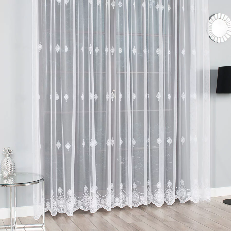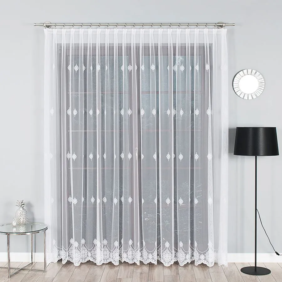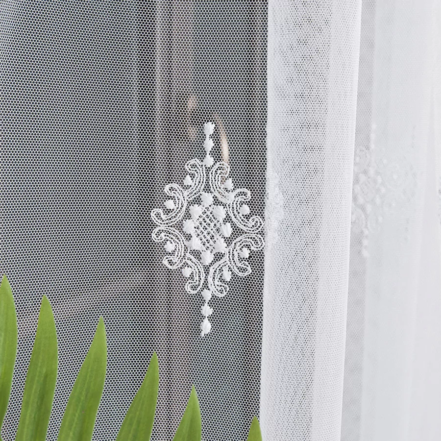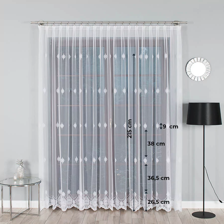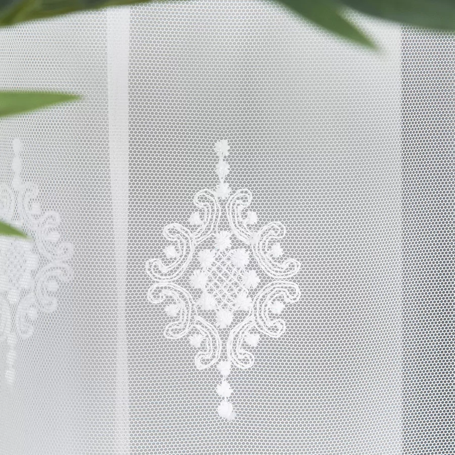 Firanka haftowana, dostępna w metrażu w kolorze białym. Firankę możesz zamówić z usługą szycia w naszej profesjonalnej szwalni - wybierz taśmę lub przelotki, podaj wymiary, a otrzymasz uszytą i gotową do zawieszenia firankę.