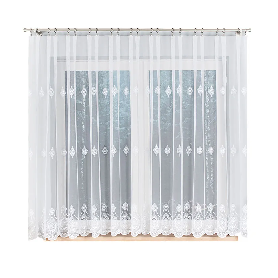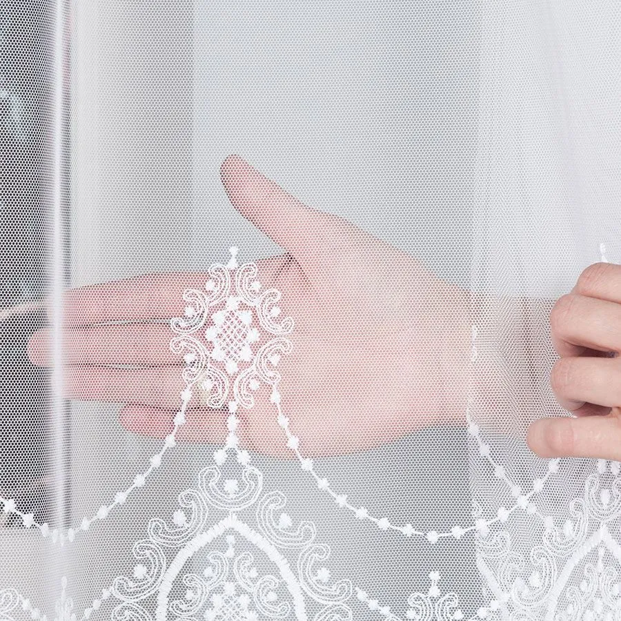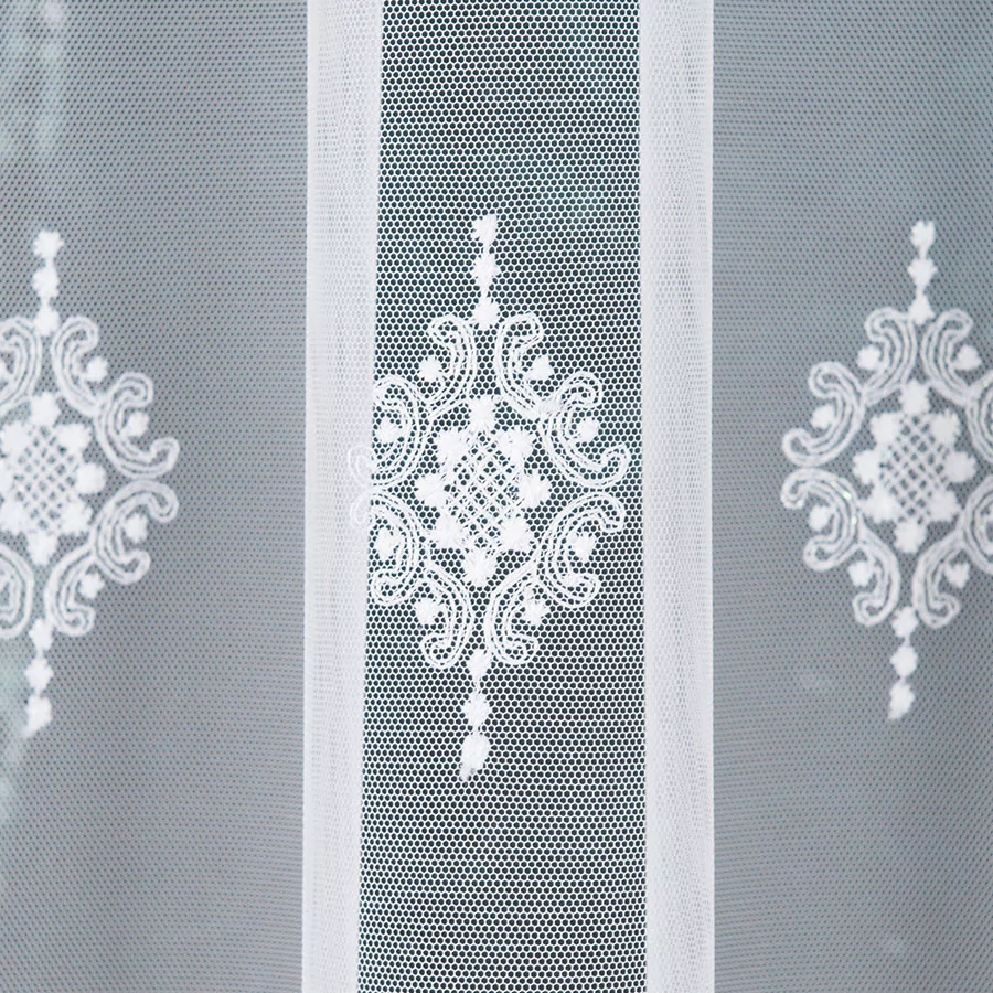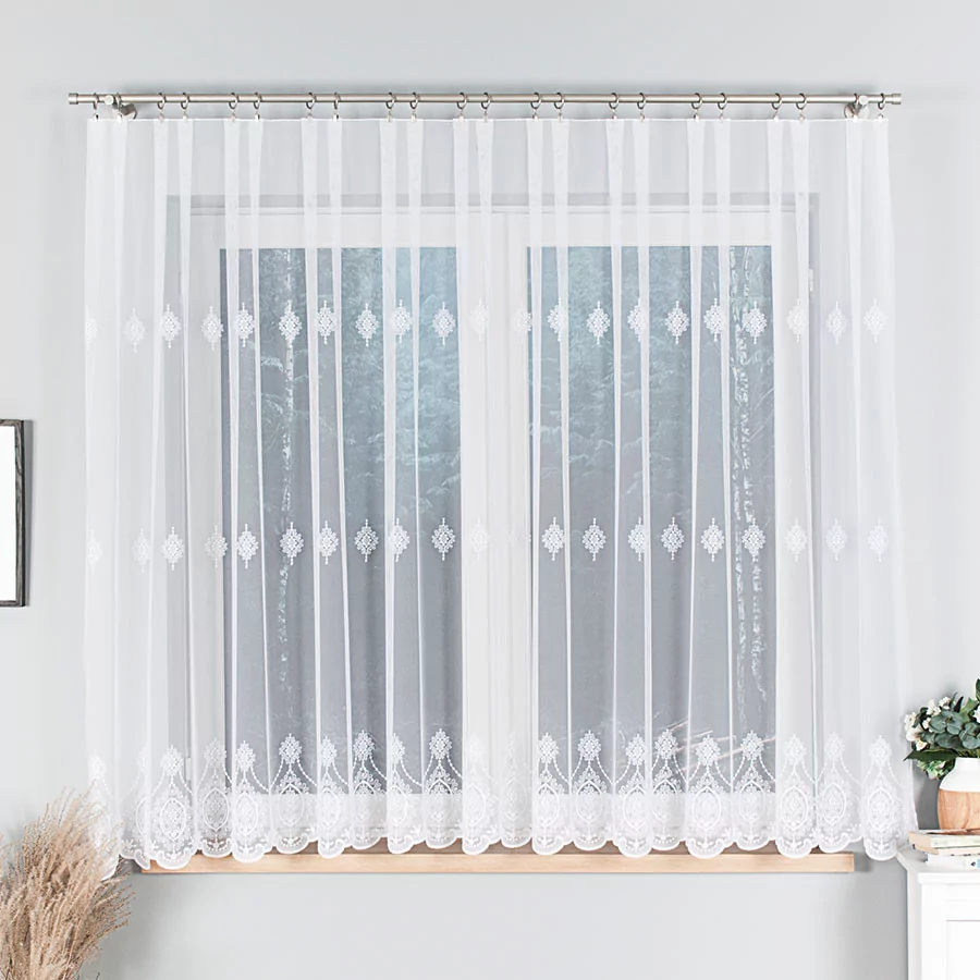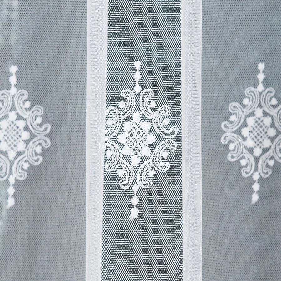 Firanka haftowana, dostępna w metrażu w kolorze białym. Firankę możesz zamówić z usługą szycia w naszej profesjonalnej szwalni - wybierz taśmę lub przelotki, podaj wymiary, a otrzymasz uszytą i gotową do zawieszenia firankę.