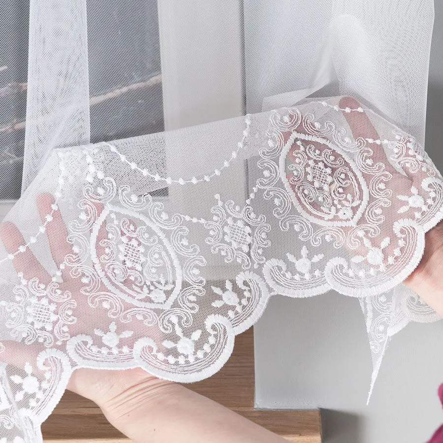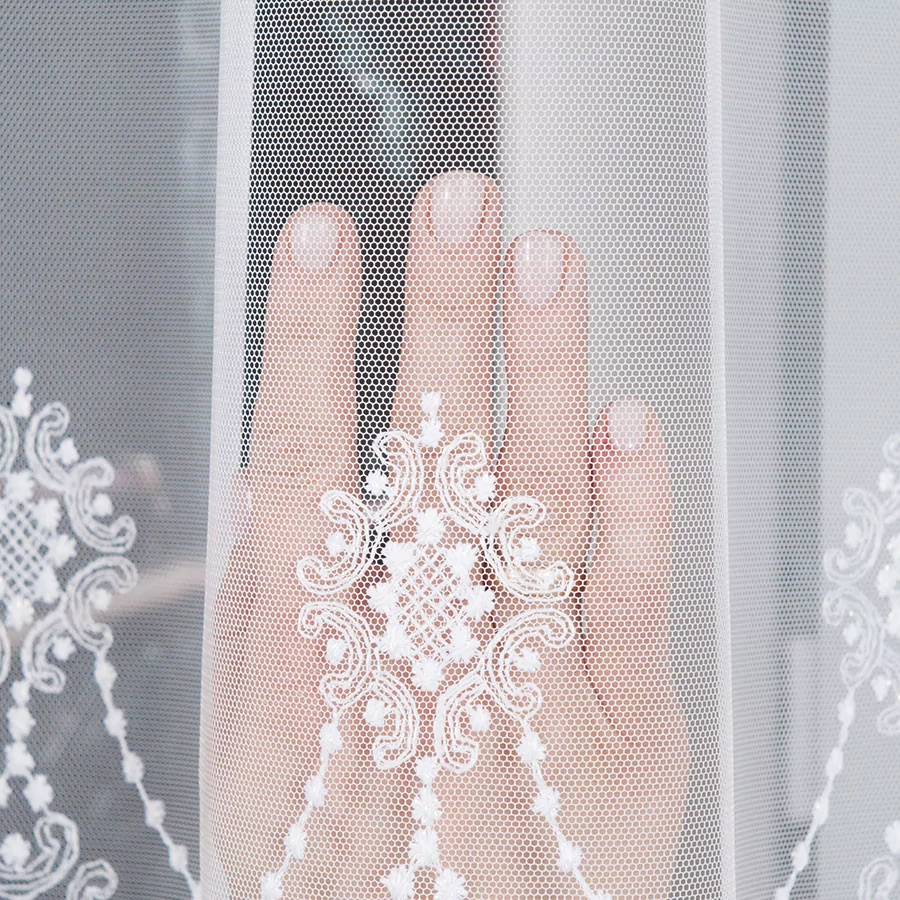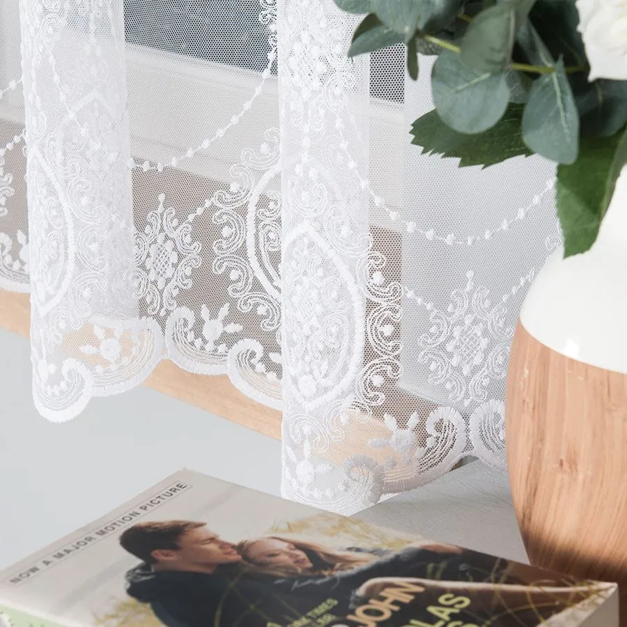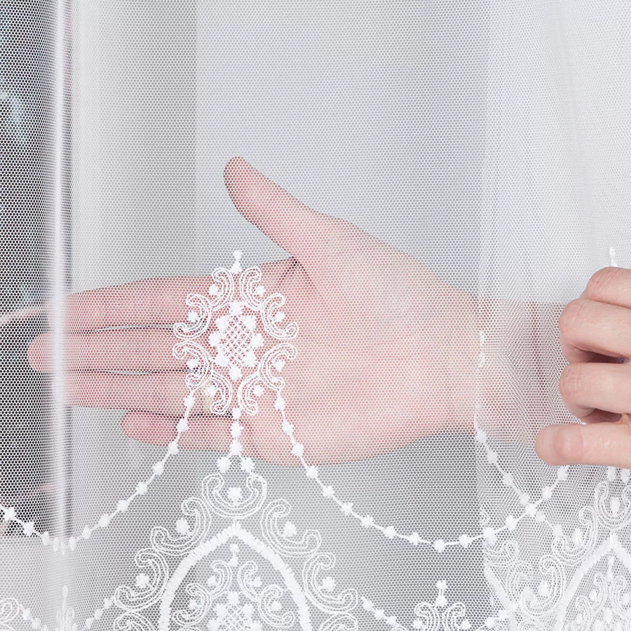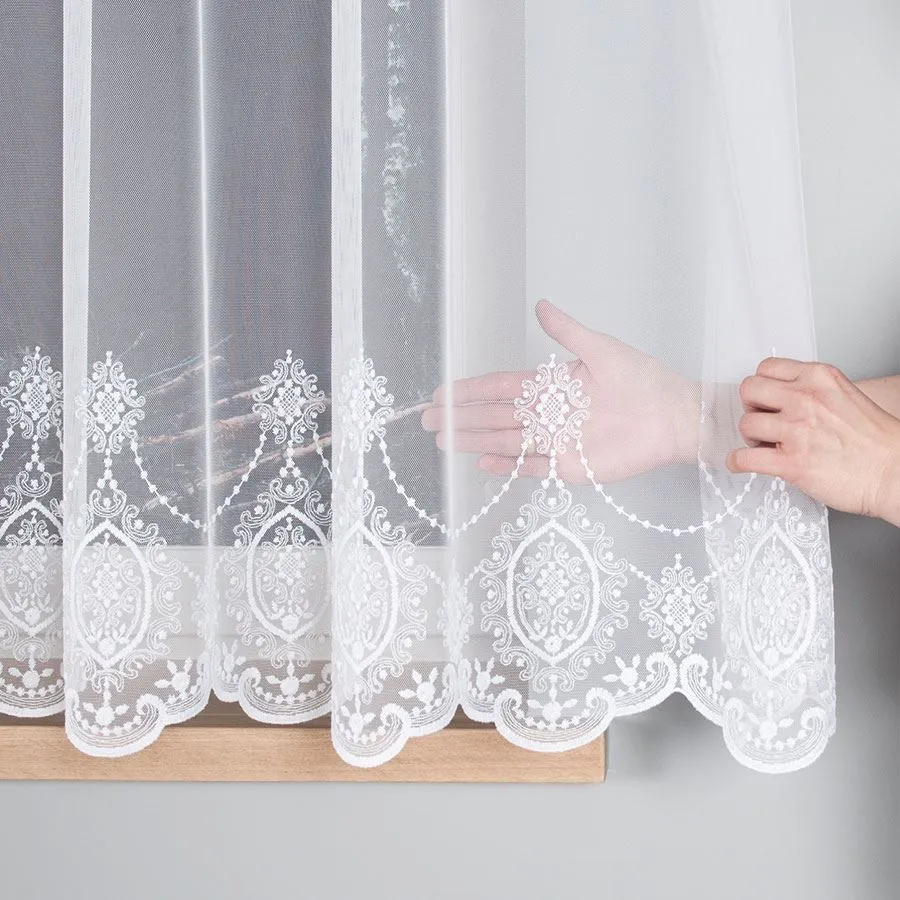 Firanka haftowana, dostępna w metrażu w kolorze białym. Firankę możesz zamówić z usługą szycia w naszej profesjonalnej szwalni - wybierz taśmę lub przelotki, podaj wymiary, a otrzymasz uszytą i gotową do zawieszenia firankę.