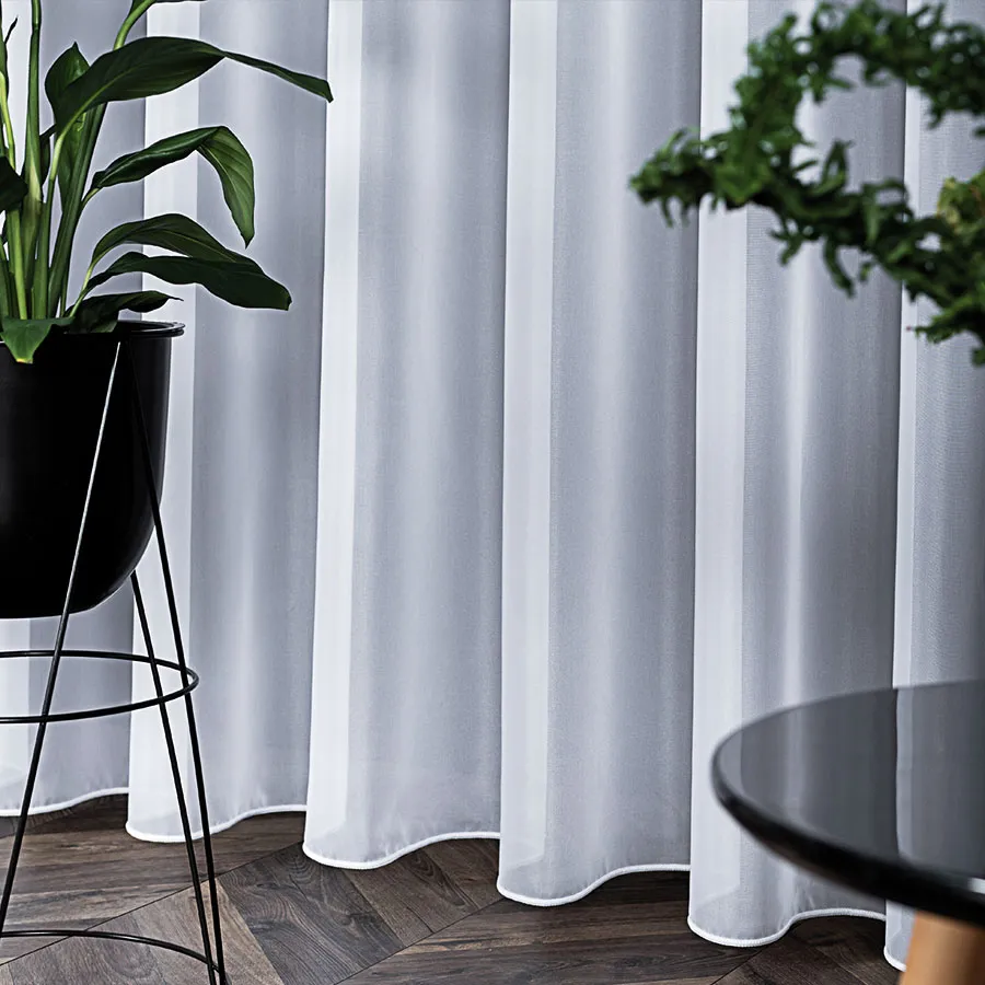 Firana woalowa wykończona ołowianką. Możesz zamówić ją z usługą szycia w naszej profesjonalnej szwalni - wybierz taśmę lub przelotki, podaj wymiary, a otrzymasz uszytą i gotową do zawieszenia firankę.