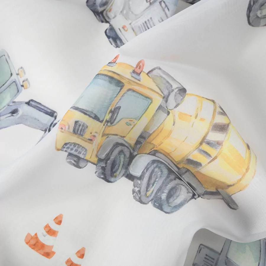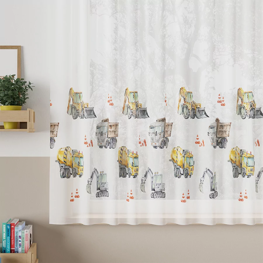 Firanka metrażowa POJAZDY dostępna w dwóch wzorach i kolorach. Będzie idealną dekoracją okienną w pokoju małego fana pojazdów budowlanych.