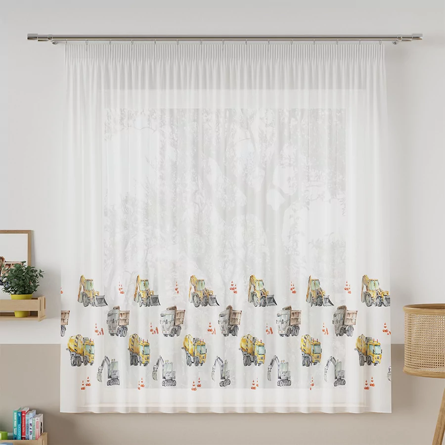 Na firance są widoczne pojazdy budowy takie jak: koparki, betoniarki oraz ciężarówki. Każdy samochód ma swój kształt oraz kolor, co pobudza wyobraźnię i ciekawość dziecka. Firanka wykonana jest z wysokiej jakości materiału woalowego, który jest miękki i przyjemny w dotyku. Tkanina jest odporna na blaknięcia i zagniecenia, a także łatwa w pielęgnacji i praniu. Wszyty ołowiany obciążnik zapobiega jej podwiewaniu i nadaje jej ładny kształt. Firanka woalowa POJAZDY to idealna ozdoba okienna dla małych fanów motoryzacji, którzy będą mogli podziwiać swoje ulubione pojazdy na oknie każdego dnia.
