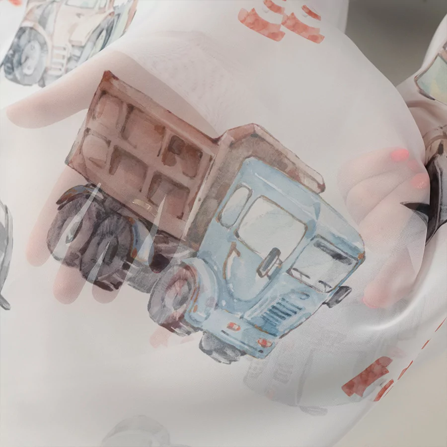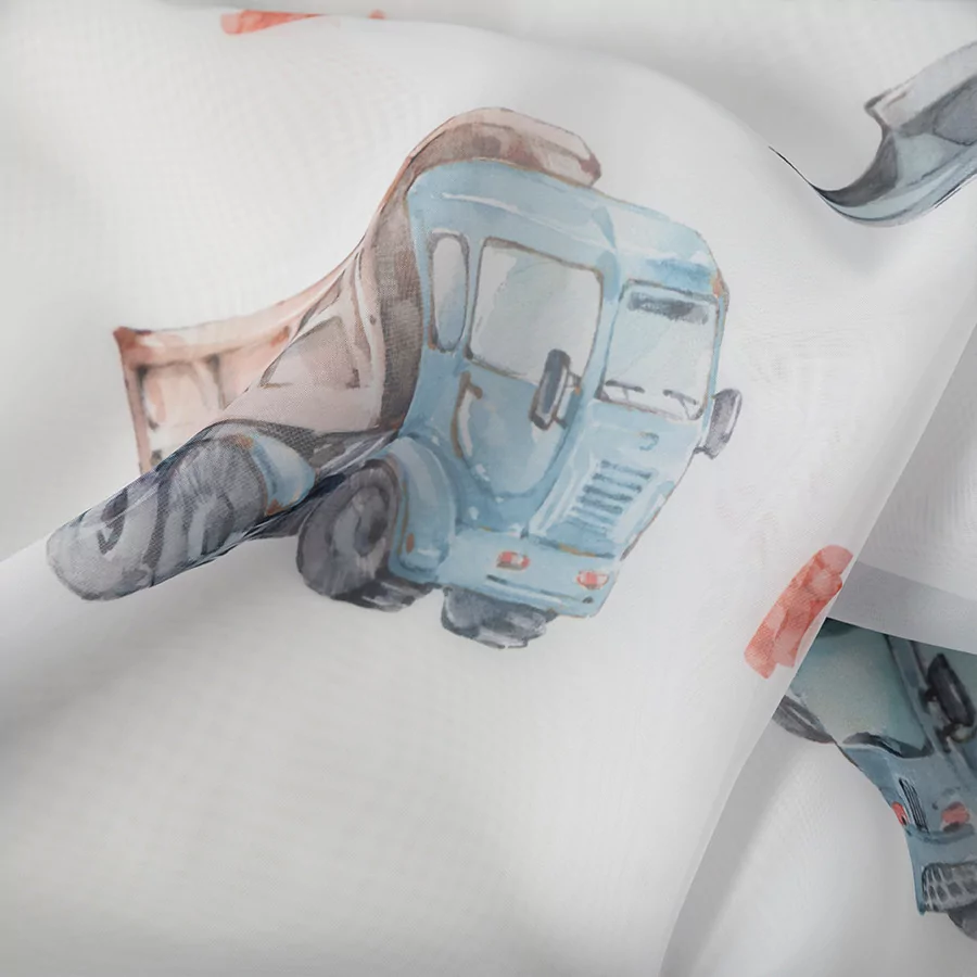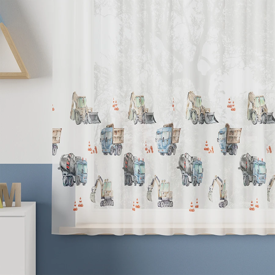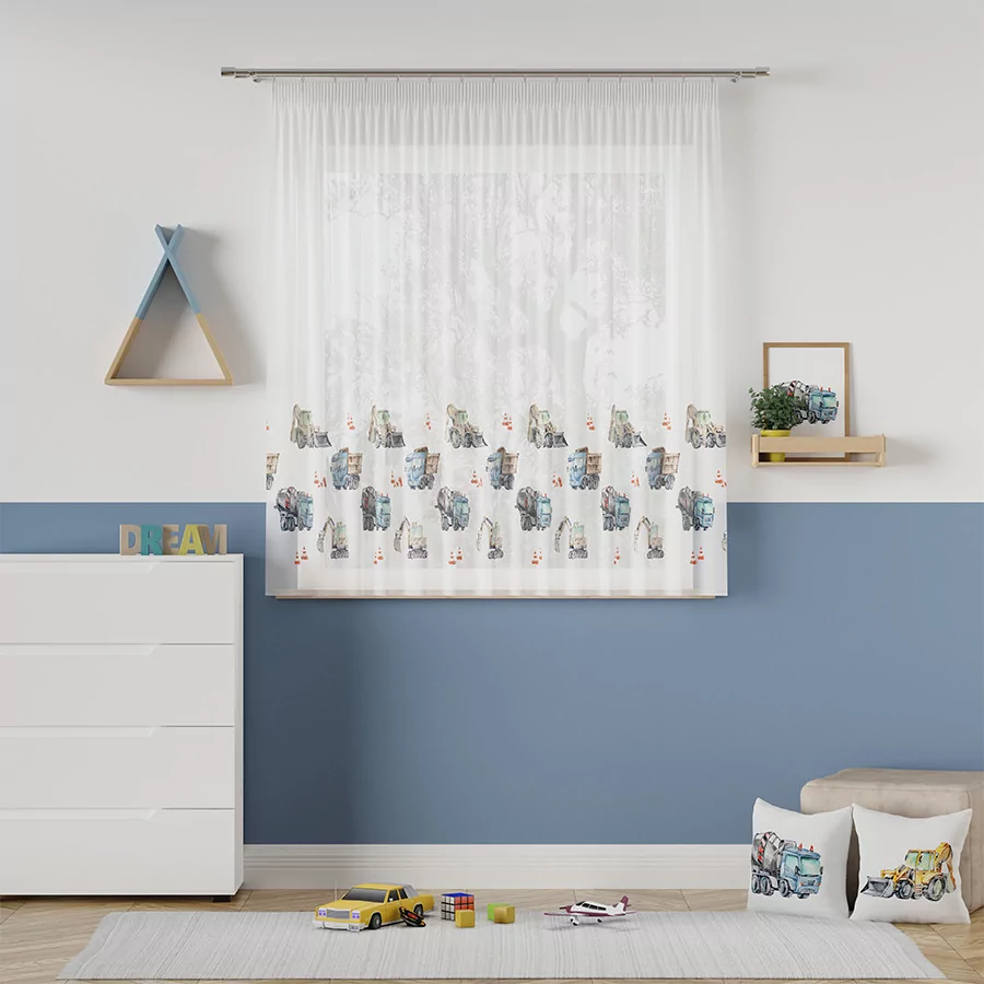 Firanka metrażowa POJAZDY dostępna w dwóch wzorach i kolorach. Będzie idealną dekoracją okienną w pokoju małego fana pojazdów budowlanych. Produkt w metrażu, który można zamówić z usługą szycia na wymiar.