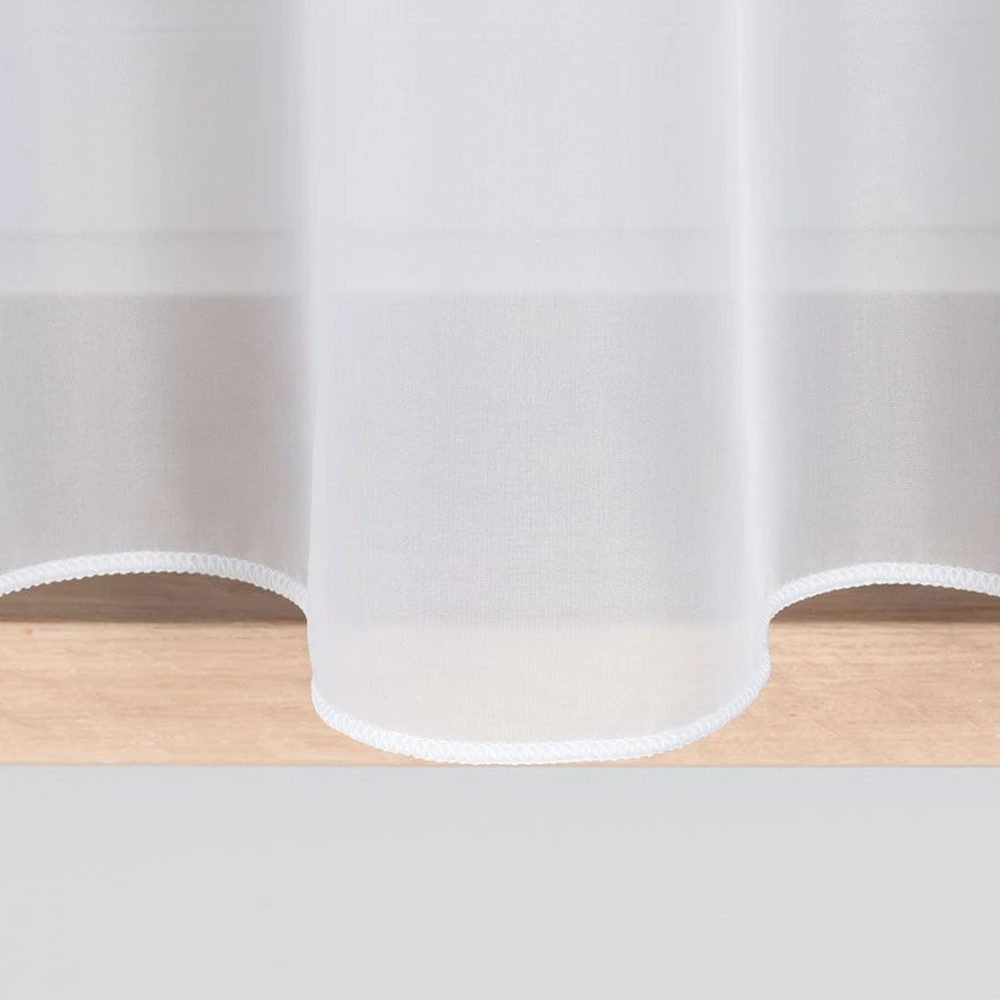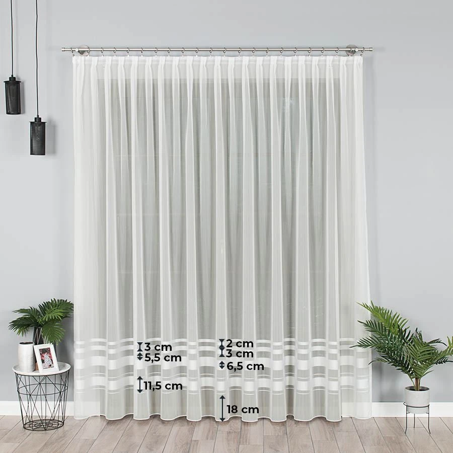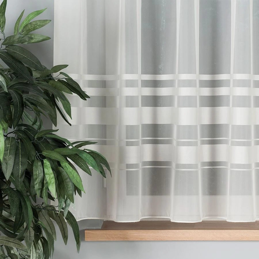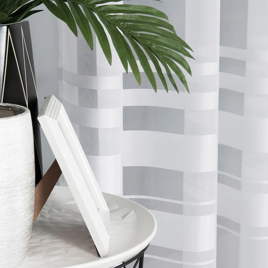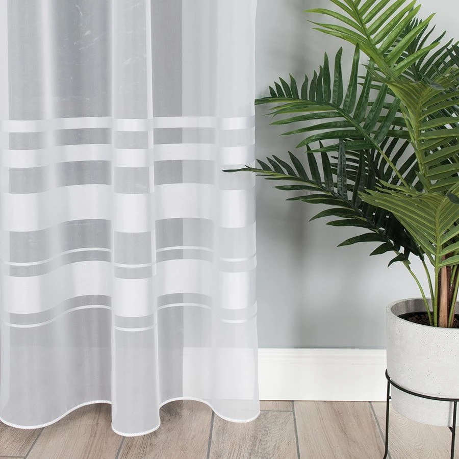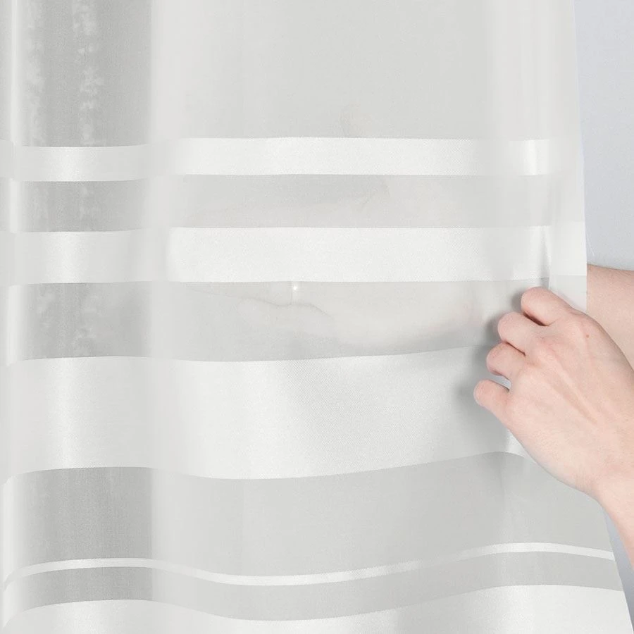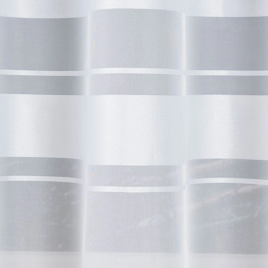 Delikatnie połyskująca tkanina woalowa, zdobiona atłasowymi pasami to jedna z wielu propozycji dostępnych w ofercie naszego sklepu internetowego. Prezentowany model dzięki minimalistycznemu wzornictwu doskonale nadaje się zarówno do nowoczesnych, jak i tradycyjnych pomieszczeń.