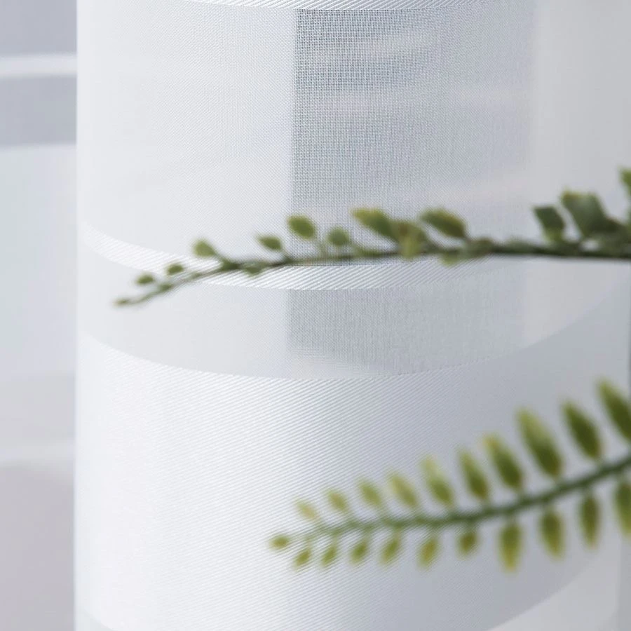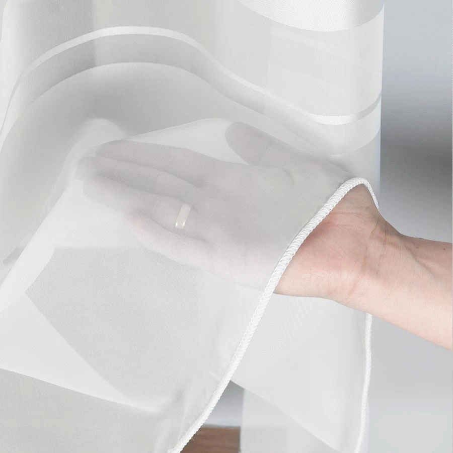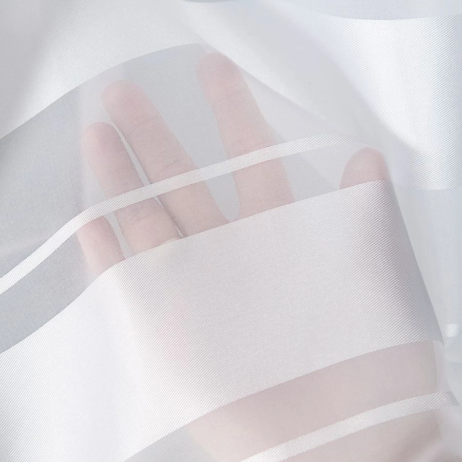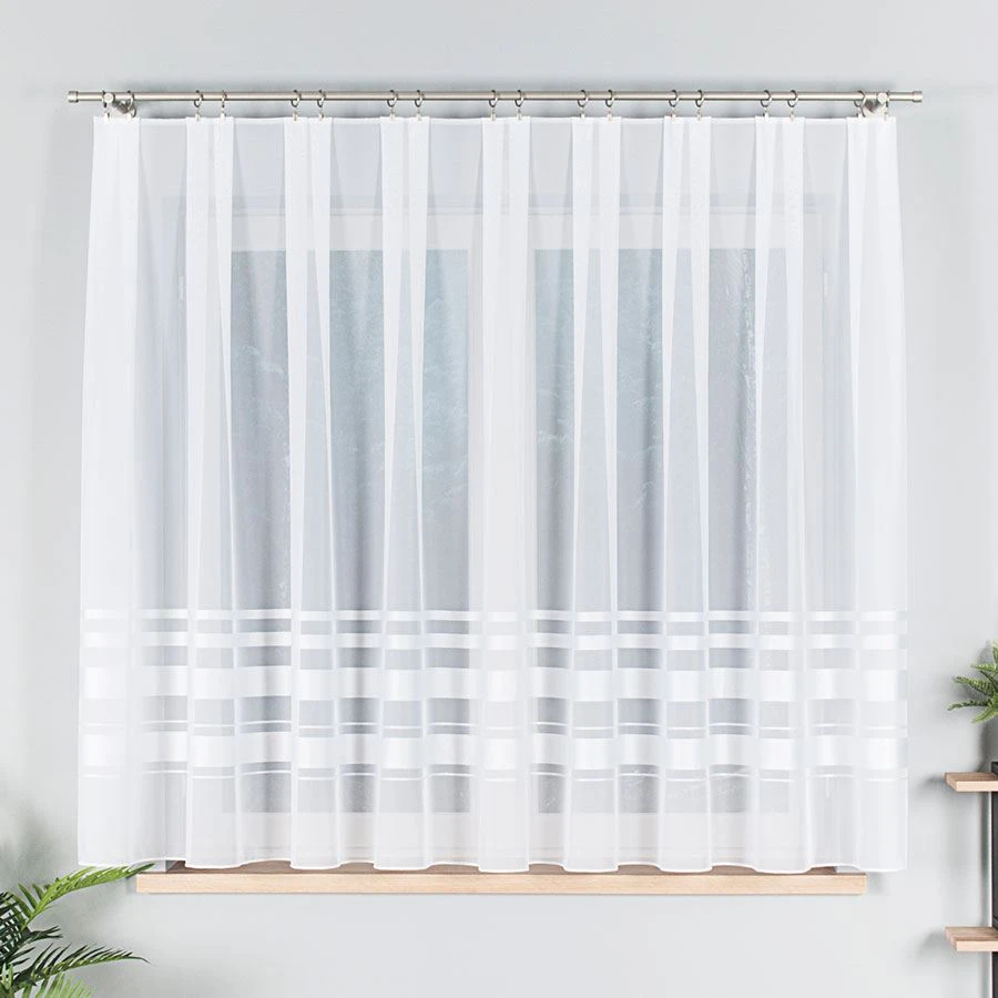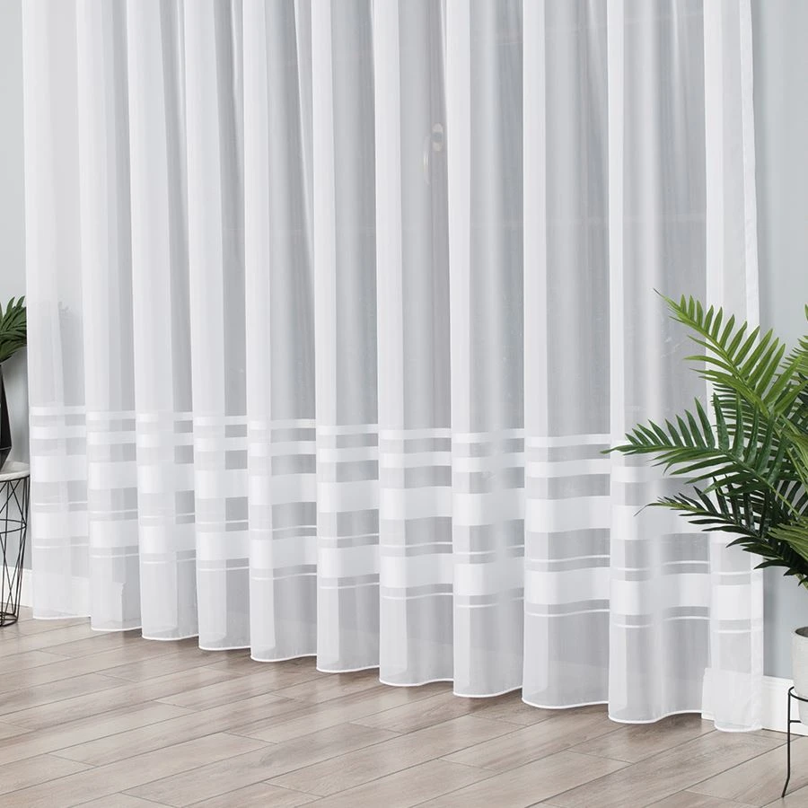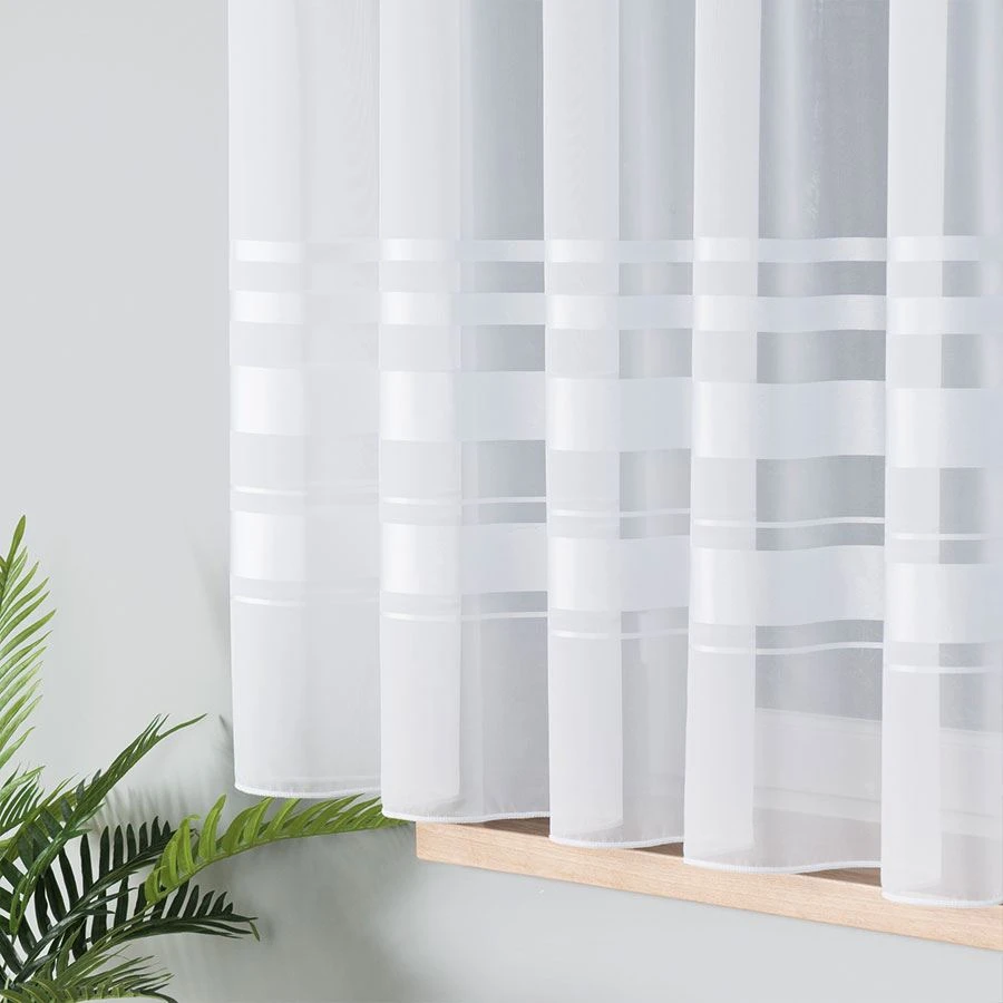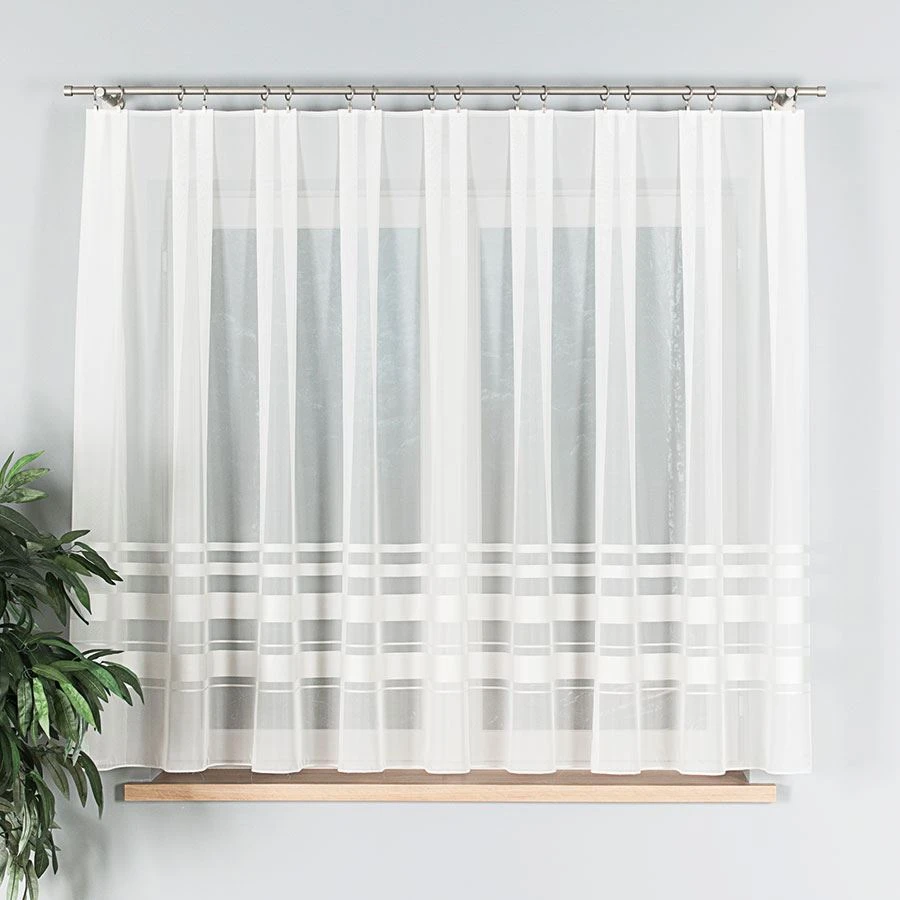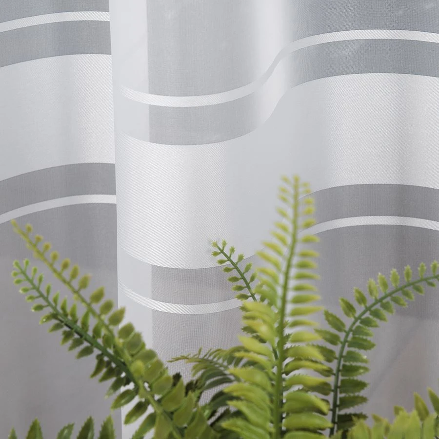 Delikatnie połyskująca tkanina woalowa, zdobiona atłasowymi pasami to jedna z wielu propozycji dostępnych w ofercie naszego sklepu internetowego. Prezentowany model dzięki minimalistycznemu wzornictwu doskonale nadaje się zarówno do nowoczesnych, jak i tradycyjnych pomieszczeń.