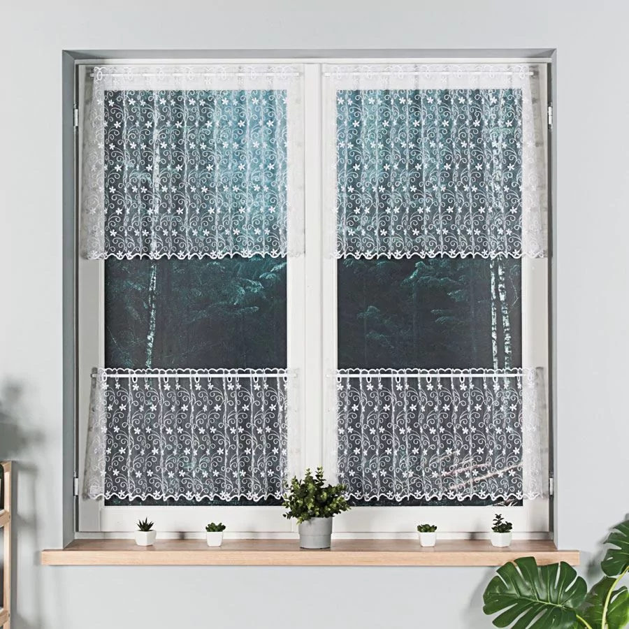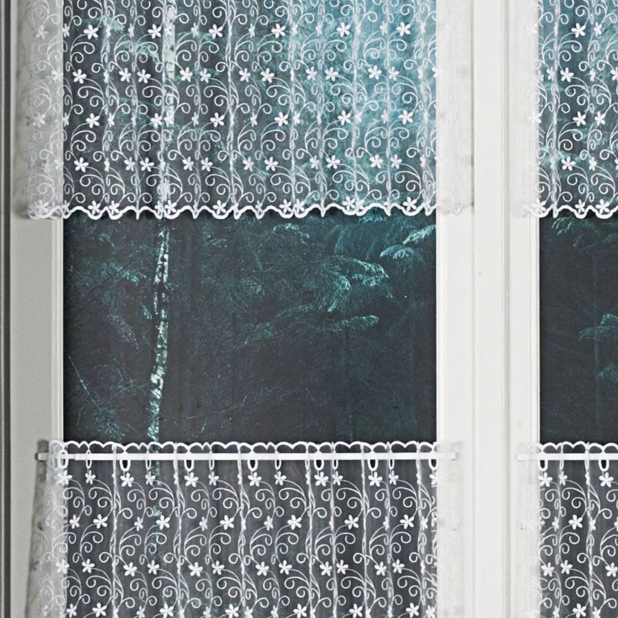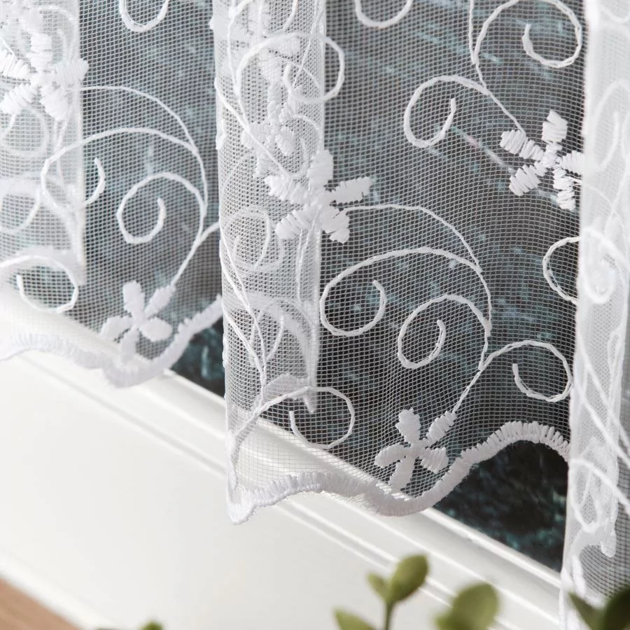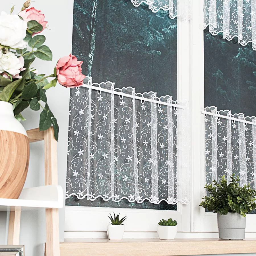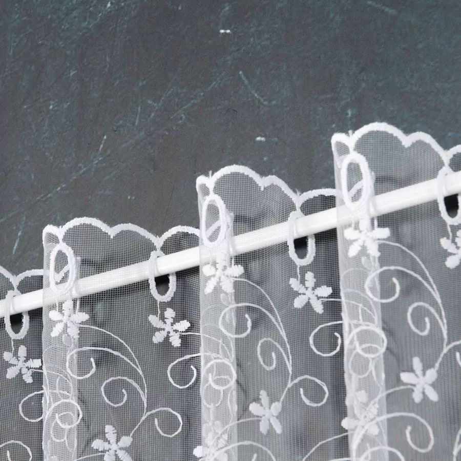 Firanka haftowana na drobnej siatce, dostępna w metrażu w kolorze białym. Firankę możesz zamówić z usługą szycia w naszej profesjonalnej szwalni - wybierz taśmę lub przelotki, podaj wymiary, a otrzymasz uszytą i gotową do zawieszenia firankę.
