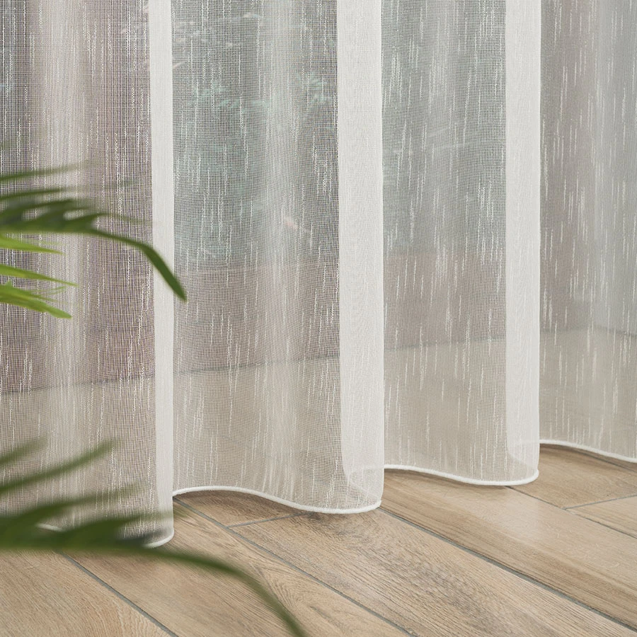 Pięknie układająca się firanka metrażowa z efektem deszczyku. Bardzo dobrze przepuszcza powietrze i promienie słoneczne. Idealna propozycja na zwieńczenie procesów aranżacyjnych w pokojach dziennych i salonach. Zagęszczony splot delikatnego, siateczkowego podkładu ozdobiony jest subtelnym efektem "deszczyku". Tak prosty i minimalistyczny wzór doda subtelności i przytulności wnętrzom. Firankę możesz zamówić z usługą szycia w naszej profesjonalnej szwalni - wybierz wykończenie, podaj wymiary, a otrzymasz uszytą i gotową do zawieszenia firankę.
