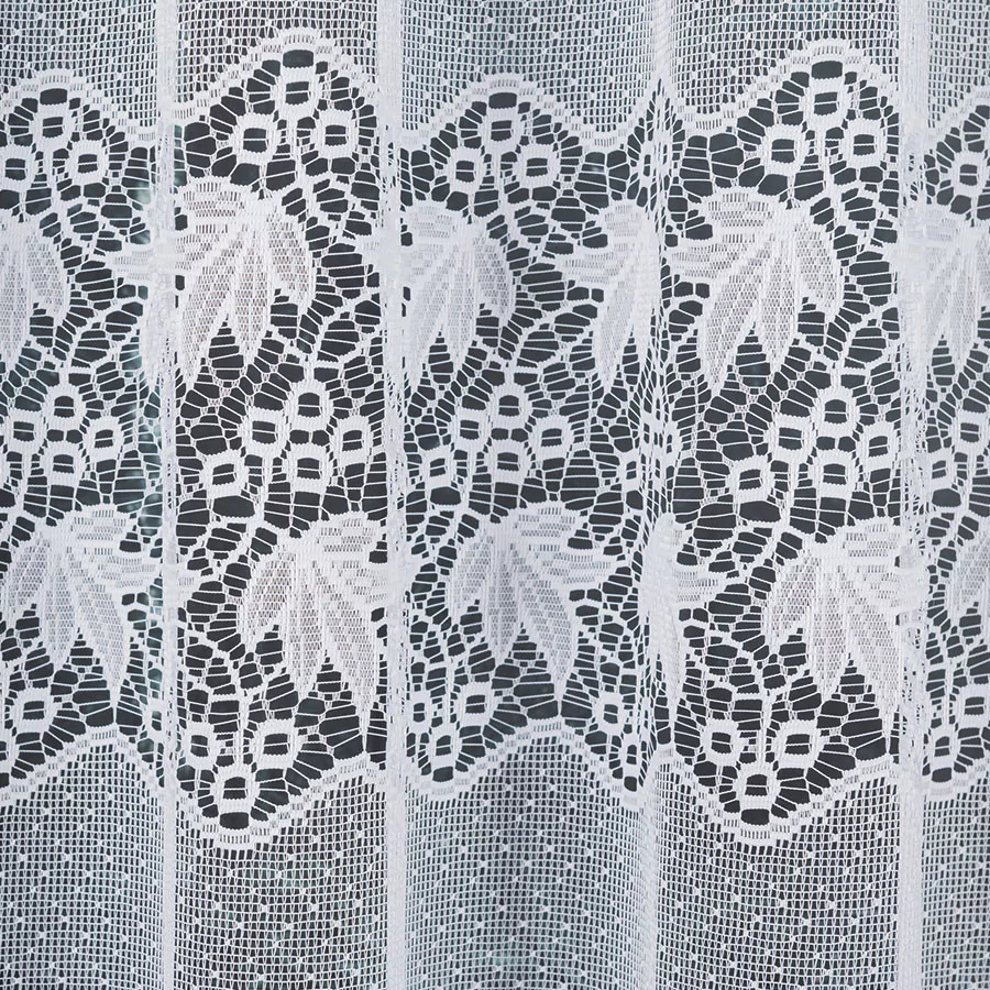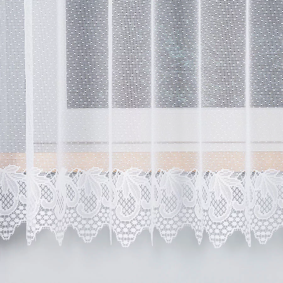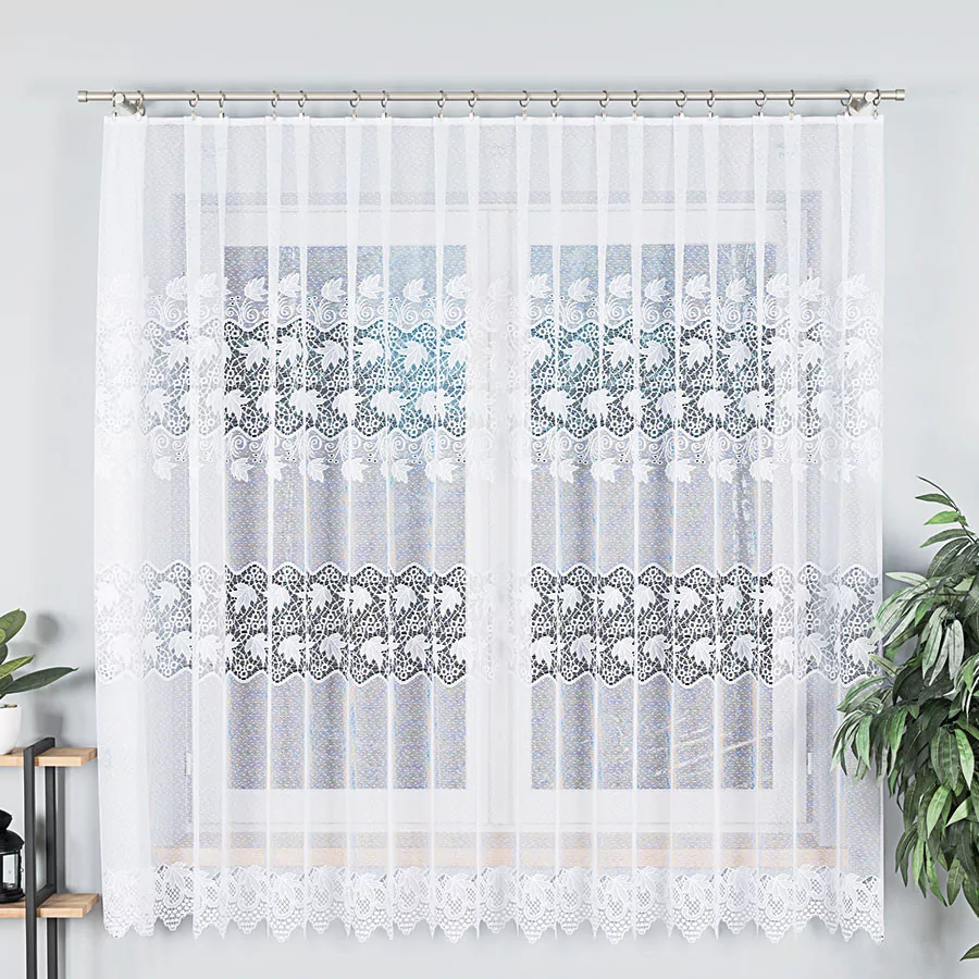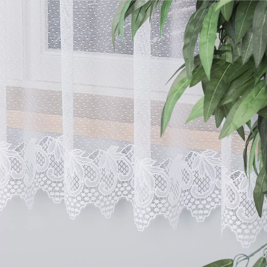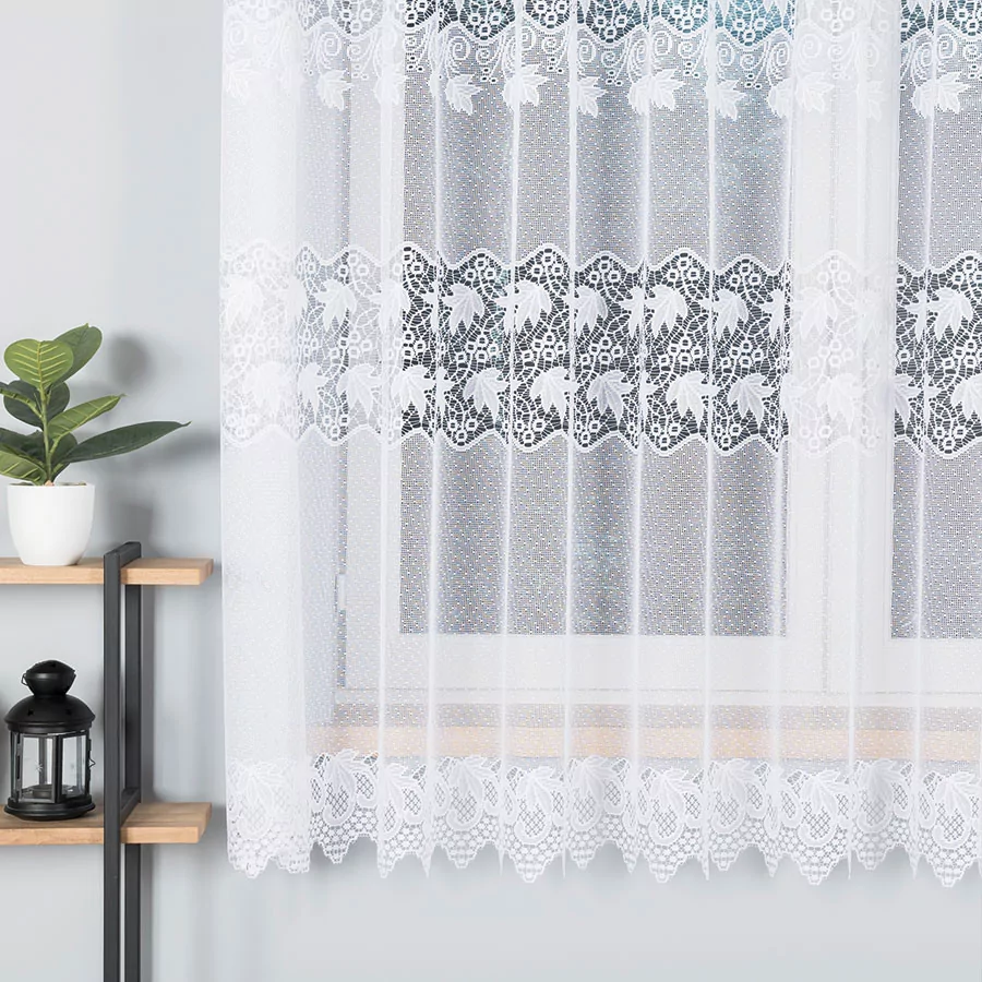 Firanka żakardowa dostępna w metrażu, kolor: biały, motyw: rośliny / kwiaty, wiele wysokości o wyboru, szerokość dowolna, dzięki czemu dopasujesz ją dokładnie do swojego okna. Firankę możesz zamówić z usługą szycia w naszej profesjonalnej szwalni - wybierz wykończenie, podaj wymiary, a otrzymasz uszytą i gotową do zawieszenia firankę. Najwyższa jakość przędzy żakardowej idealnie wkomponuje się w aranżację wnętrz nowoczesnych jak i tych urządzonych w klasycznym stylu. Firanka pięknie się układa, nie wymaga prasowania i można go prać w pralce w niskiej temperaturze. Cechuje ją dobra przepuszczalność powietrza i promieni słonecznych.