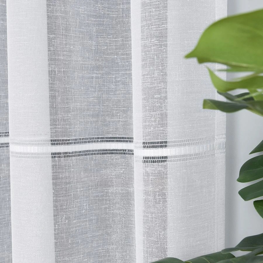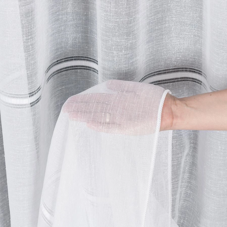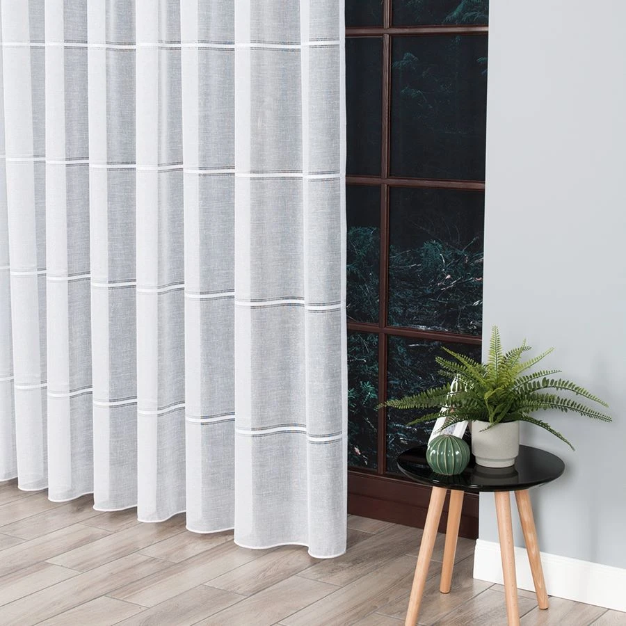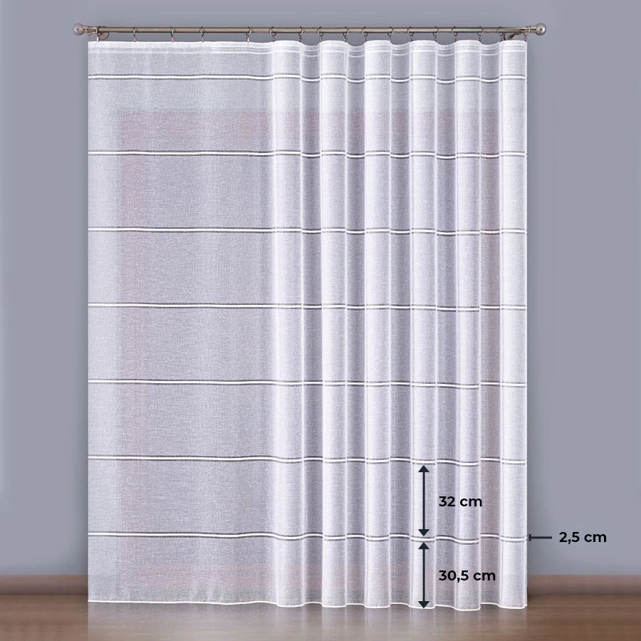 Pięknie układająca się firanka metrażowa zdobiona poziomymi pasami. Umiarkowanie przepuszcza powietrze i promienie słoneczne.