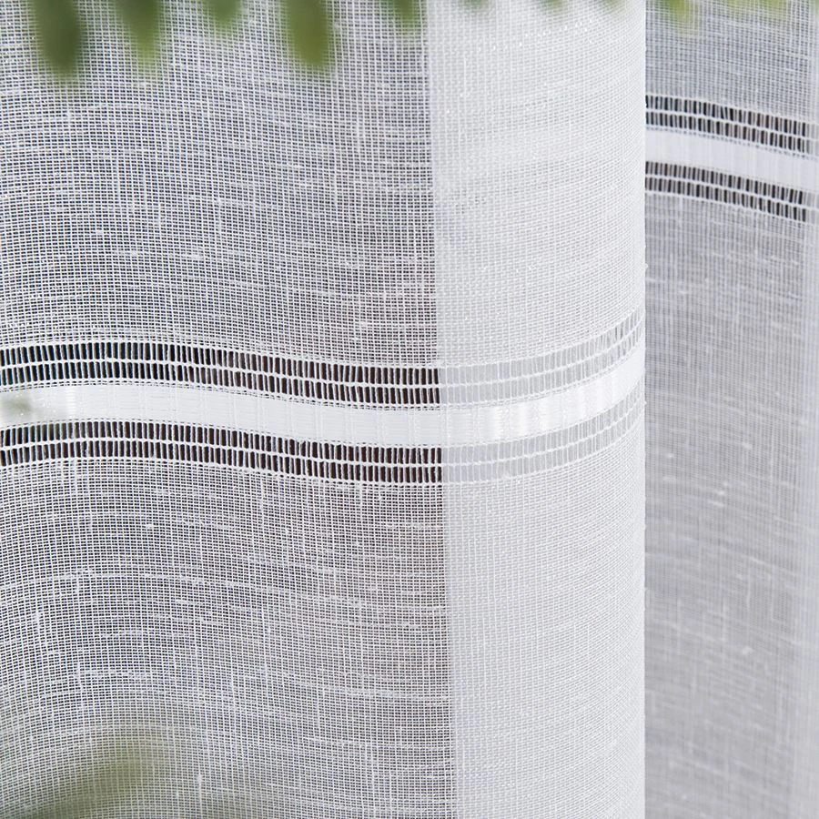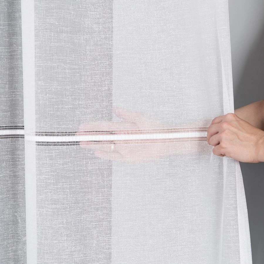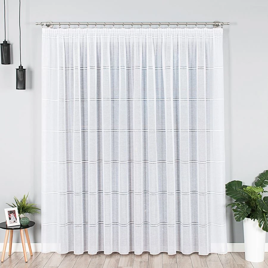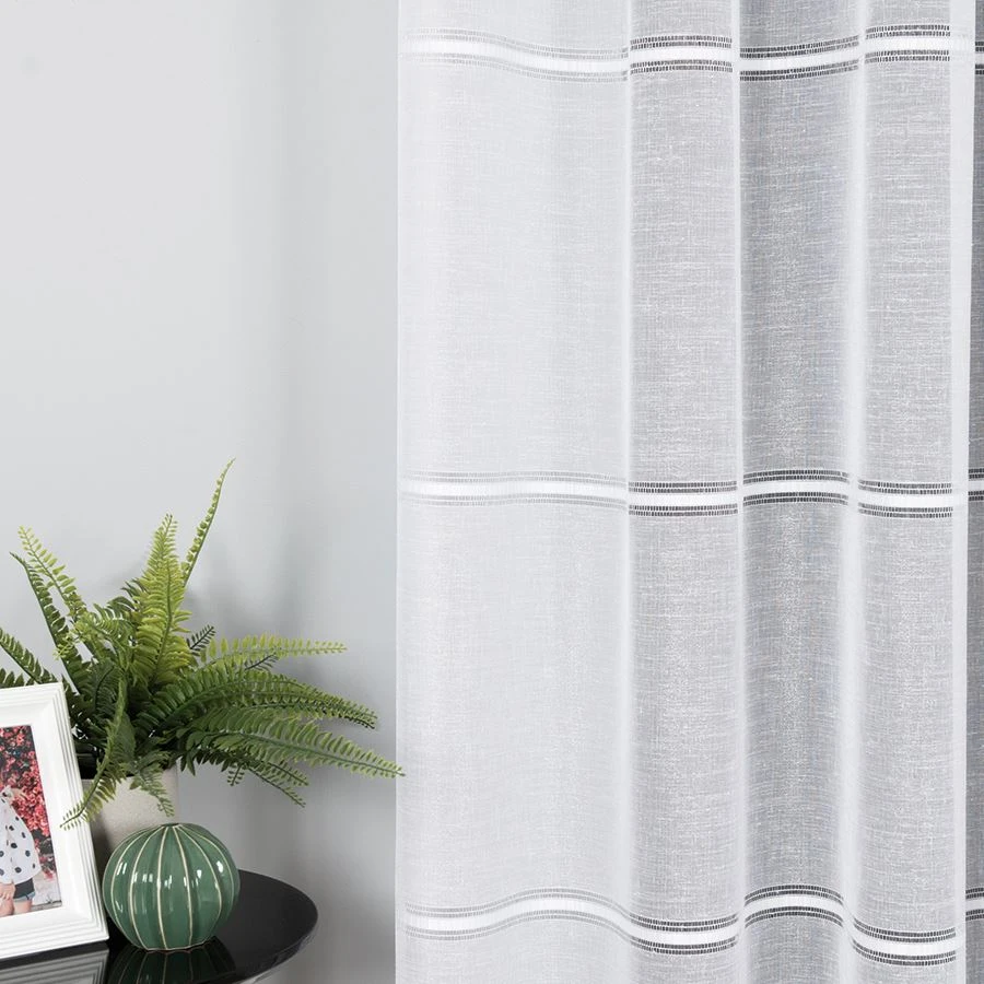 Pięknie układająca się firanka metrażowa zdobiona poziomymi pasami. Umiarkowanie przepuszcza powietrze i promienie słoneczne.