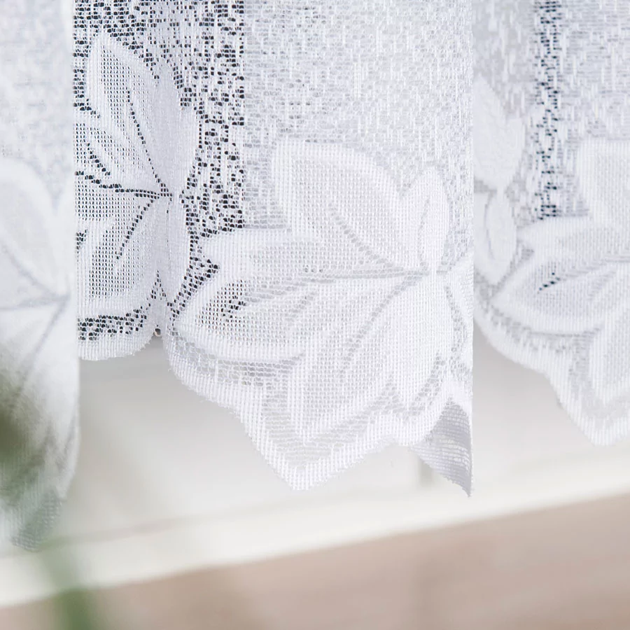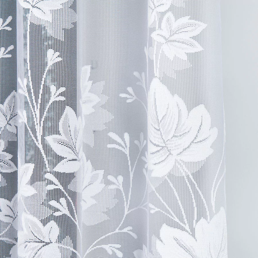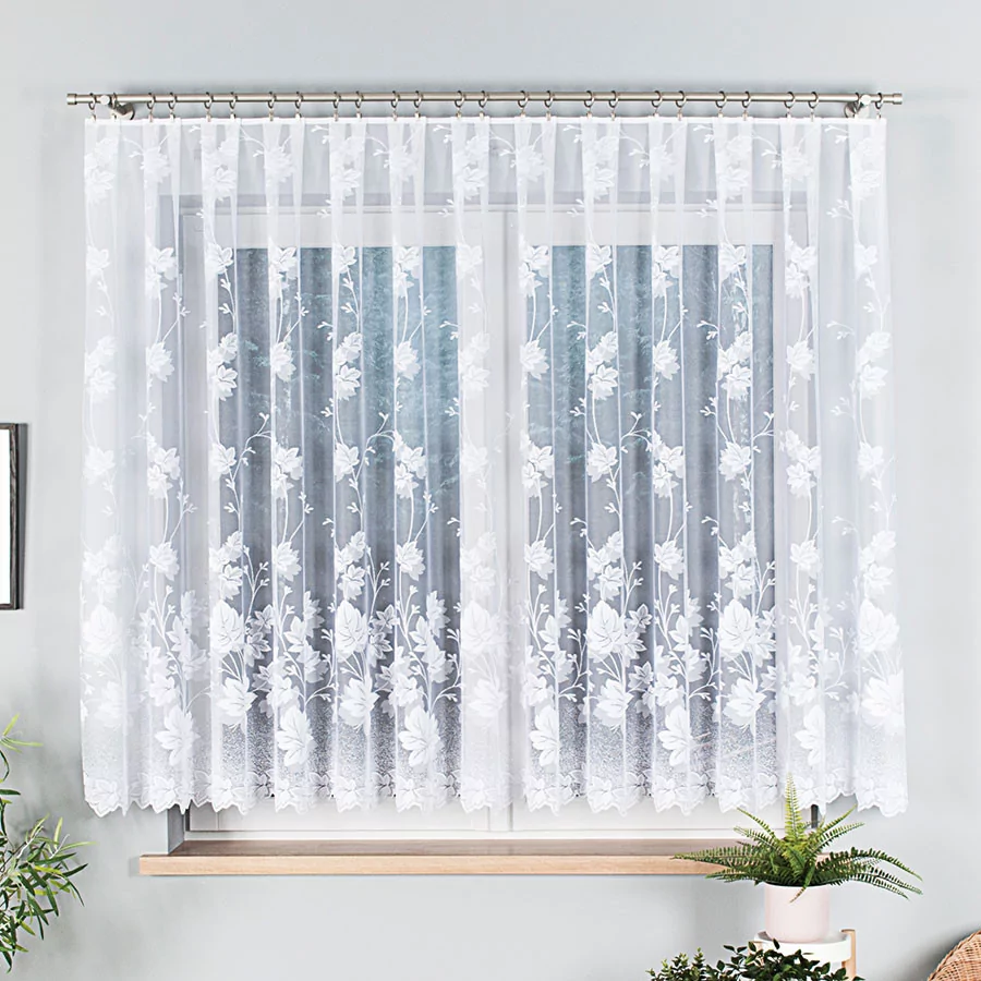 Firanka żakardowa dostępna w metrażu. Wiele wysokości do wyboru, szerokość dowolna, dzięki czemu dopasujesz ją dokładnie do swojego okna. Firankę możesz zamówić z usługą szycia w naszej profesjonalnej szwalni - wybierz wykończenie, podaj wymiary, a otrzymasz uszytą i gotową do zawieszenia firankę. Najwyższa jakość przędzy żakardowej idealnie wkomponuje się w aranżację wnętrz nowoczesnych jak i tych urządzonych w klasycznym stylu. Firanka pięknie się układa, nie wymaga prasowania i można ją prać w pralce w niskiej temperaturze. Cechuje ją dobra przepuszczalność powietrza i promieni słonecznych.