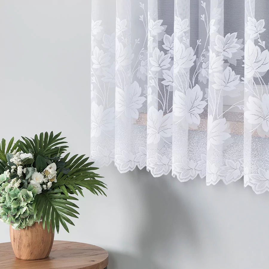Firanka żakardowa dostępna w metrażu. Wiele wysokości do wyboru, szerokość dowolna, dzięki czemu dopasujesz ją dokładnie do swojego okna. Firankę możesz zamówić z usługą szycia w naszej profesjonalnej szwalni - wybierz wykończenie, podaj wymiary, a otrzymasz uszytą i gotową do zawieszenia firankę. Najwyższa jakość przędzy żakardowej idealnie wkomponuje się w aranżację wnętrz nowoczesnych jak i tych urządzonych w klasycznym stylu. Firanka pięknie się układa, nie wymaga prasowania i można ją prać w pralce w niskiej temperaturze. Cechuje ją dobra przepuszczalność powietrza i promieni słonecznych.